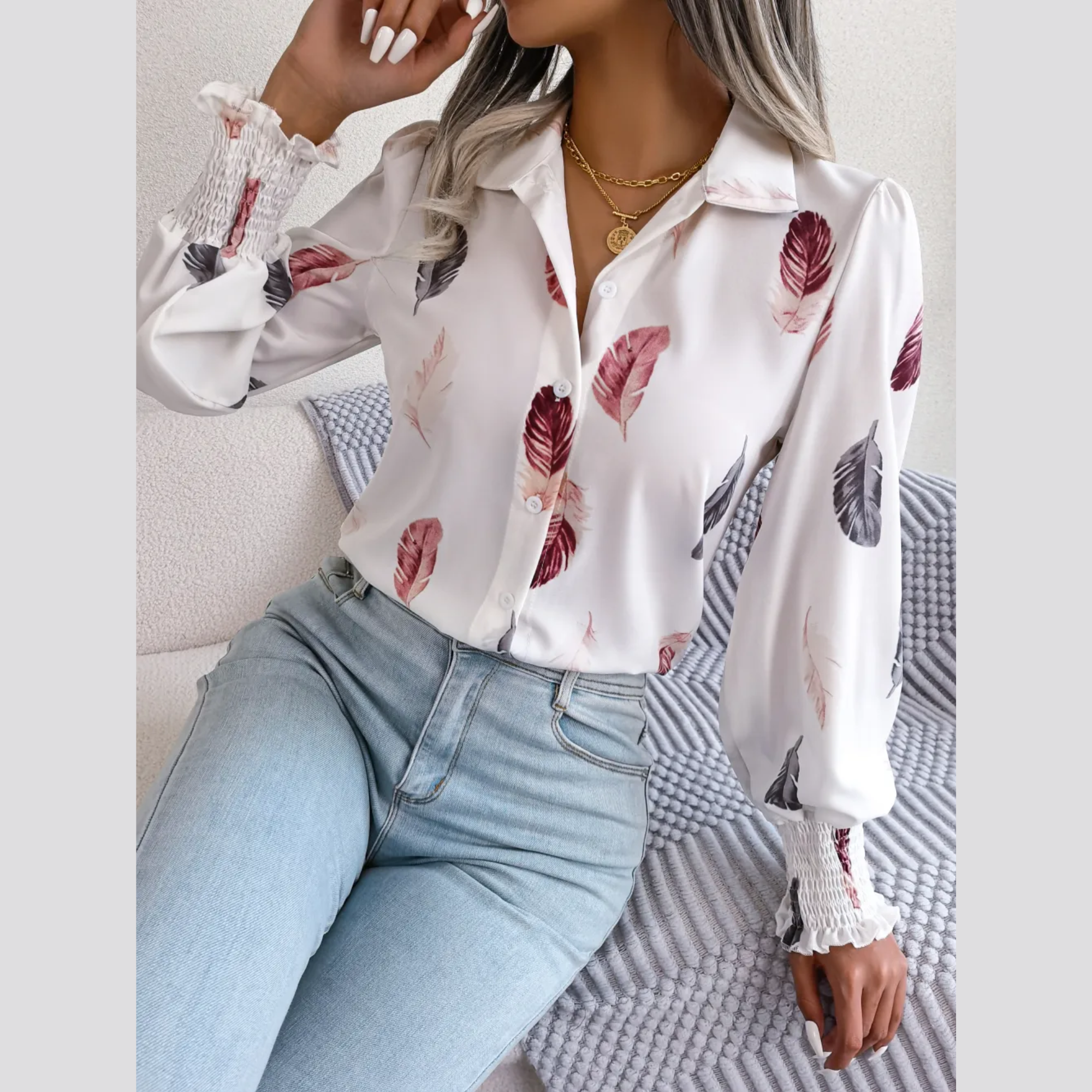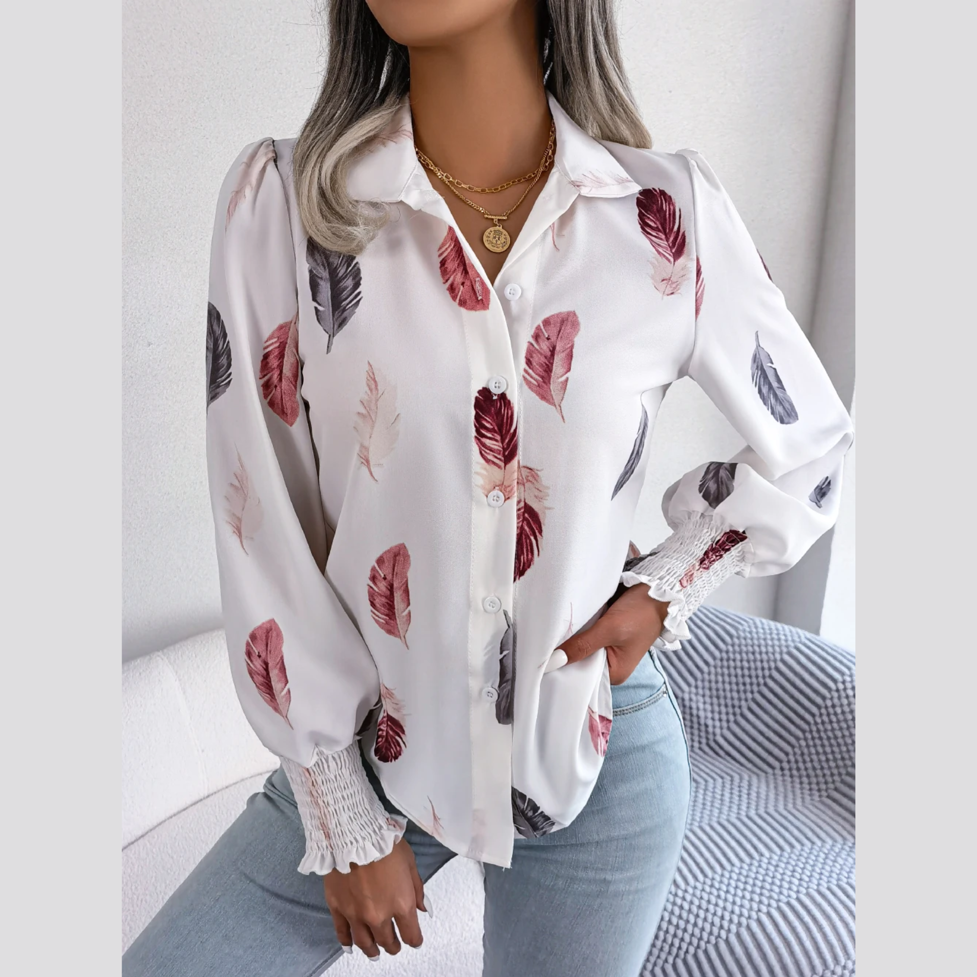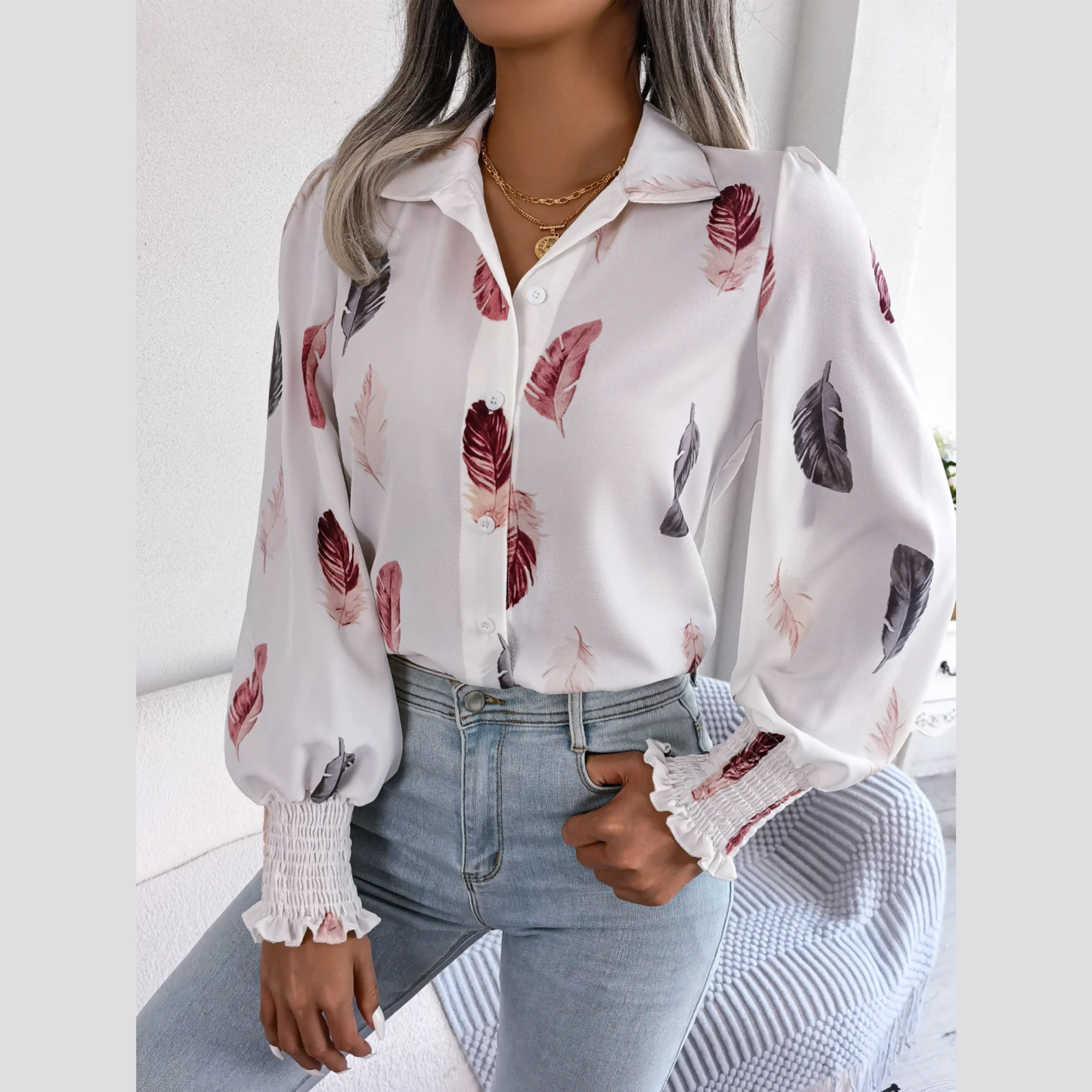 Fangen Sie mit Brie die süße Essenz eines Blattmusters ein. Diese erfrischende und elegante Bluse mit Knopfleiste hat einen Kragenausschnitt und lange Laternenärmel. Die lockere Passform verleiht ihr einen lässigen und unkomplizierten Stil.