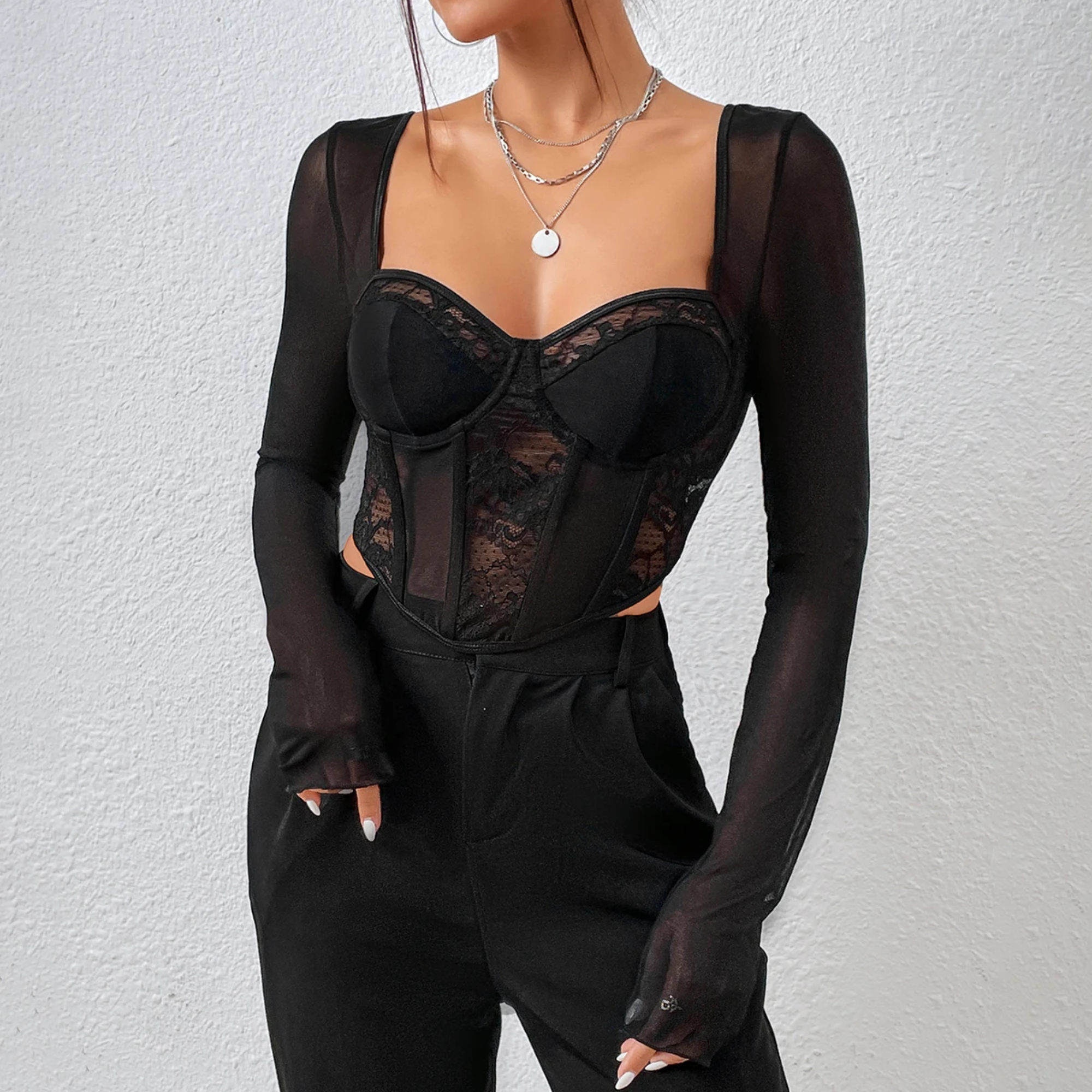 Mode war noch nie so edel wie mit unserem schwarzen Crop Top aus transparentem Netzstoff und Spitze. Das raffinierte Design mit langen Ärmeln und herzförmigem Ausschnitt sorgt für einen bezaubernden Look, der garantiert alle Blicke auf sich zieht. Das Oberteil im Korsett-Stil betont Ihre Figur wunderbar, während der Mix aus transparentem Netzstoff und Spitze ihm einen Hauch von Verführung und Eleganz verleiht. Ideal für alle Ihre Anlässe – dieses Crop Top ist ein echter Hingucker.