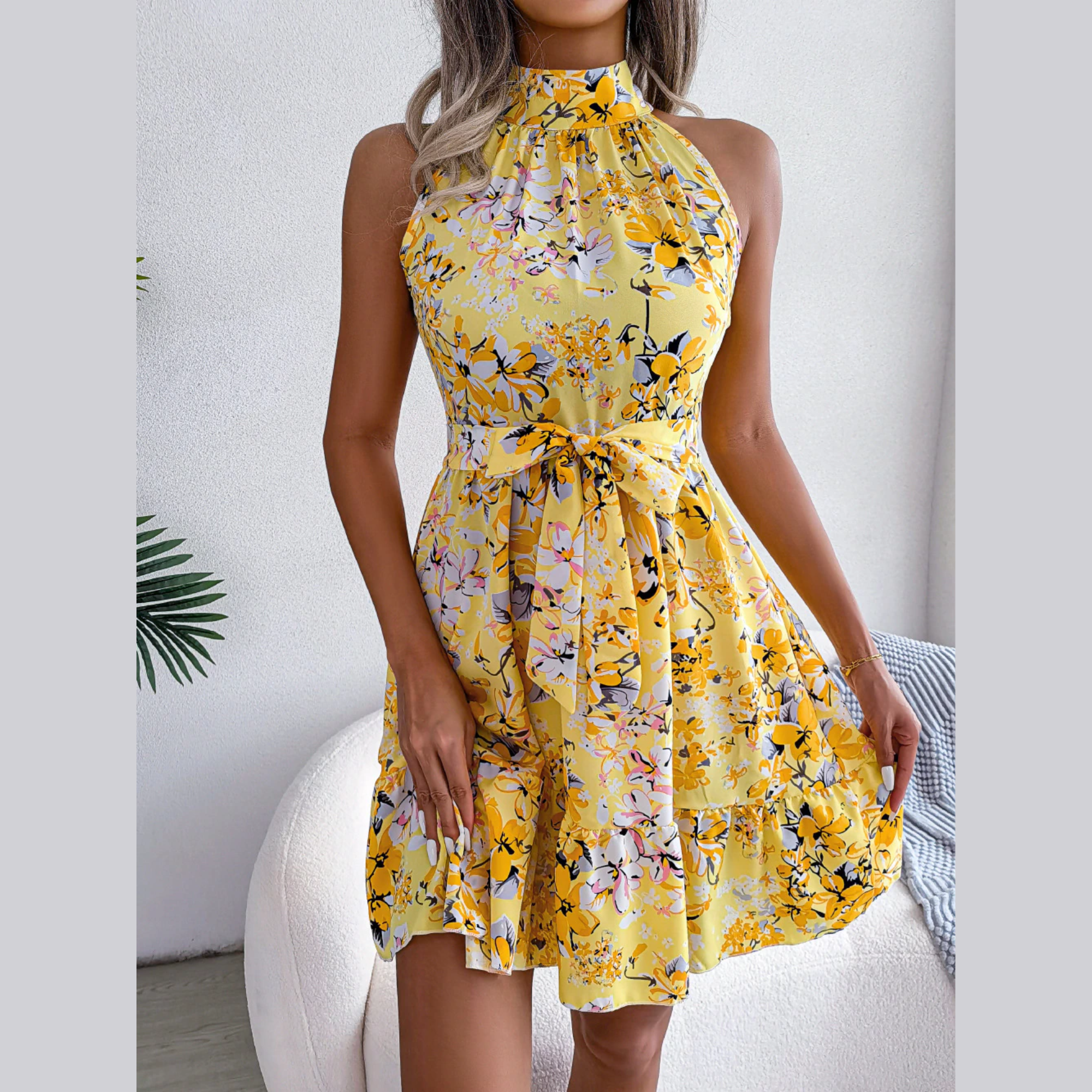 Tauchen Sie ein in die Blumenwelt – Ladonna besticht durch ein traumhaftes Blumenarrangement entlang der fließenden Silhouette. Der Stehkragen und die ärmellosen Schultern runden das Design ab. Der Minirock hat einen fließenden A-Linien-Saum, der beim Gehen flattert.