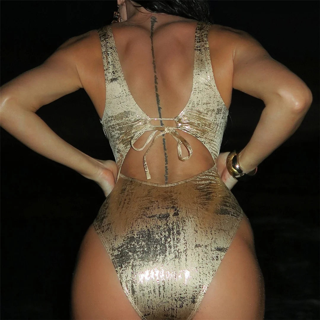 Step into elegance with this stunning metallic one-piece swimsuit. Designed with a deep V-neckline, it features a stylish ring detail at the center for added allure. The chic color combination exudes sophistication, making it perfect for poolside lounging or a day at the beach. With its eye-catching design and impeccable fit, this swimsuit is a must-have for your summer wardrobe.