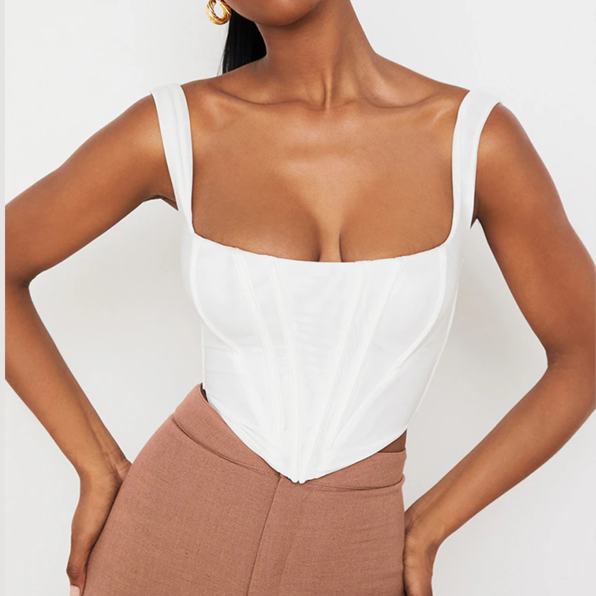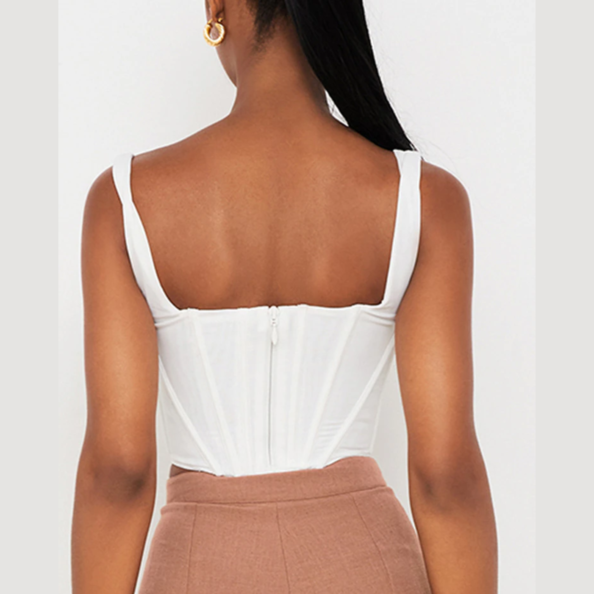 Mazie ist eine Stiltherapie mit einem schicken Schnitt. Diese halbtransparente Bluse hat eine korsettähnliche Konstruktion und eine bustierartige Passform. Sie hat eine verkürzte Länge mit quadratischem Ausschnitt und zwei Schulterträgern.