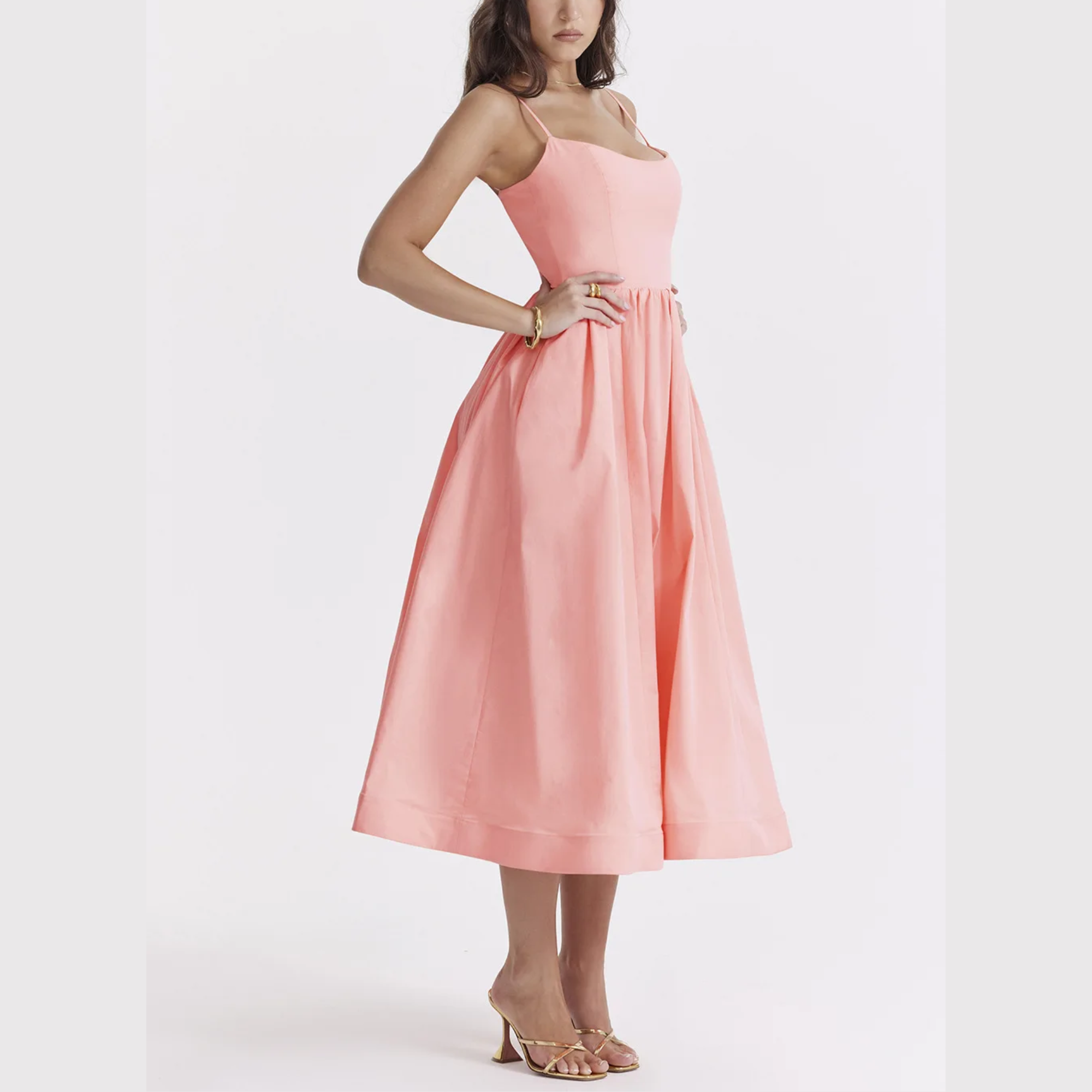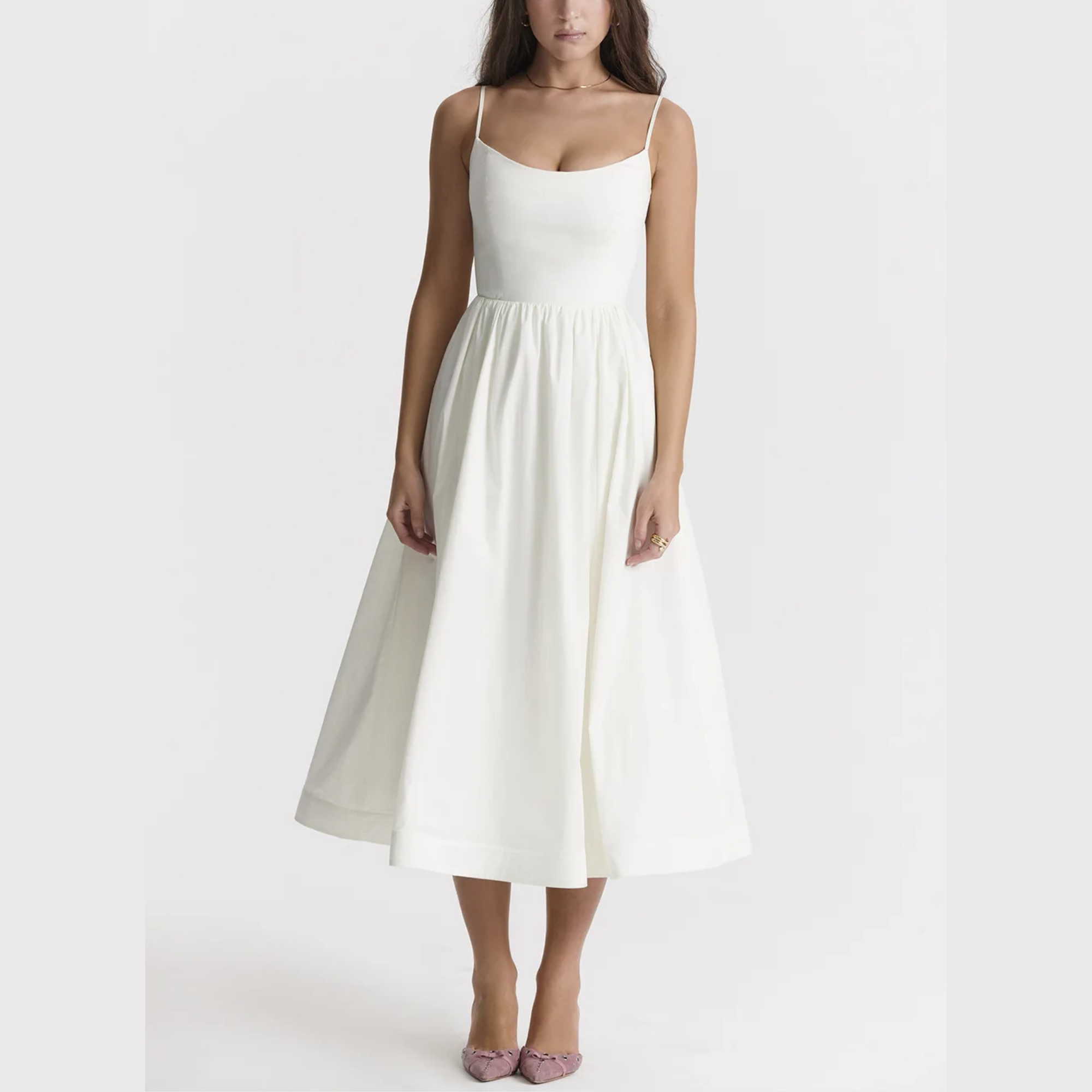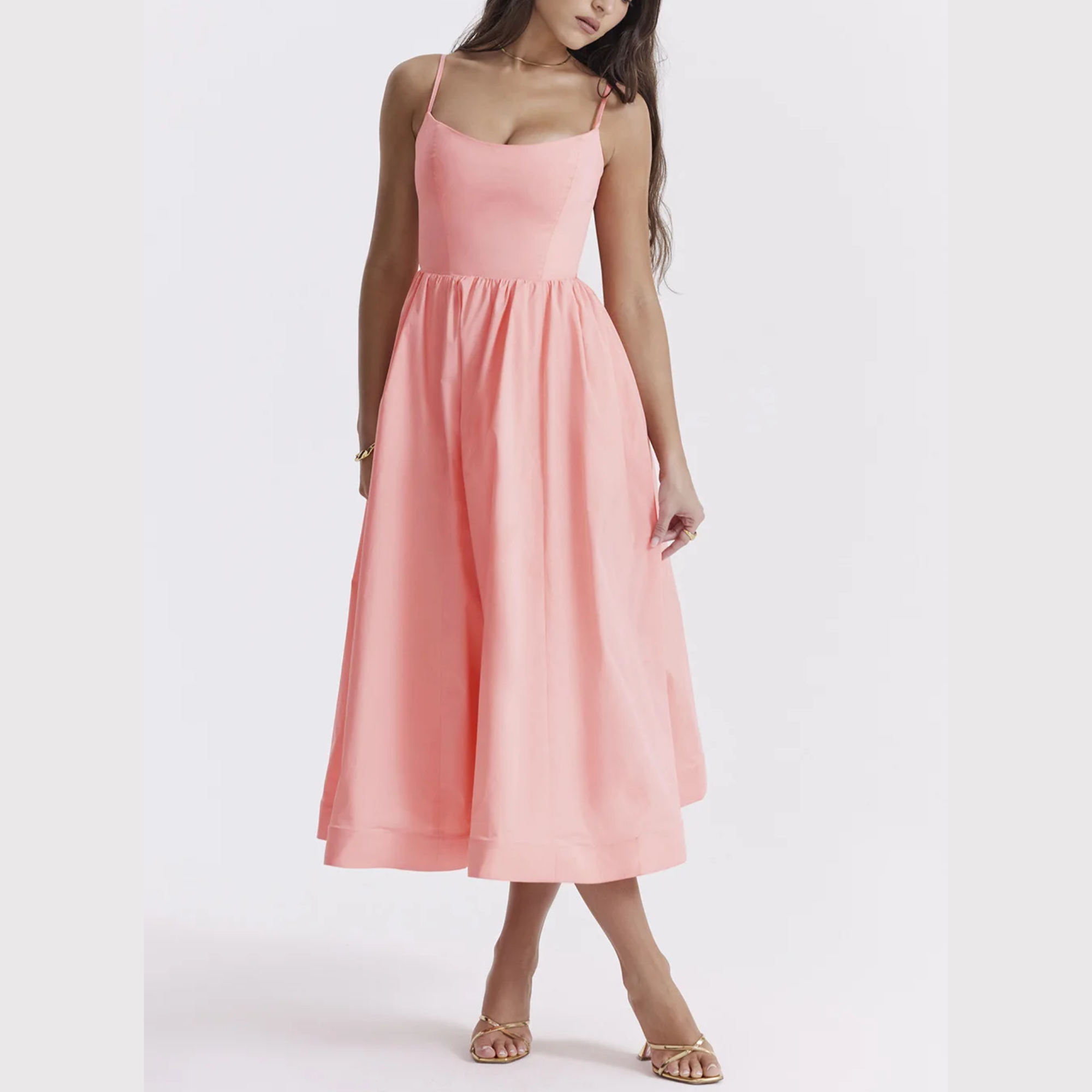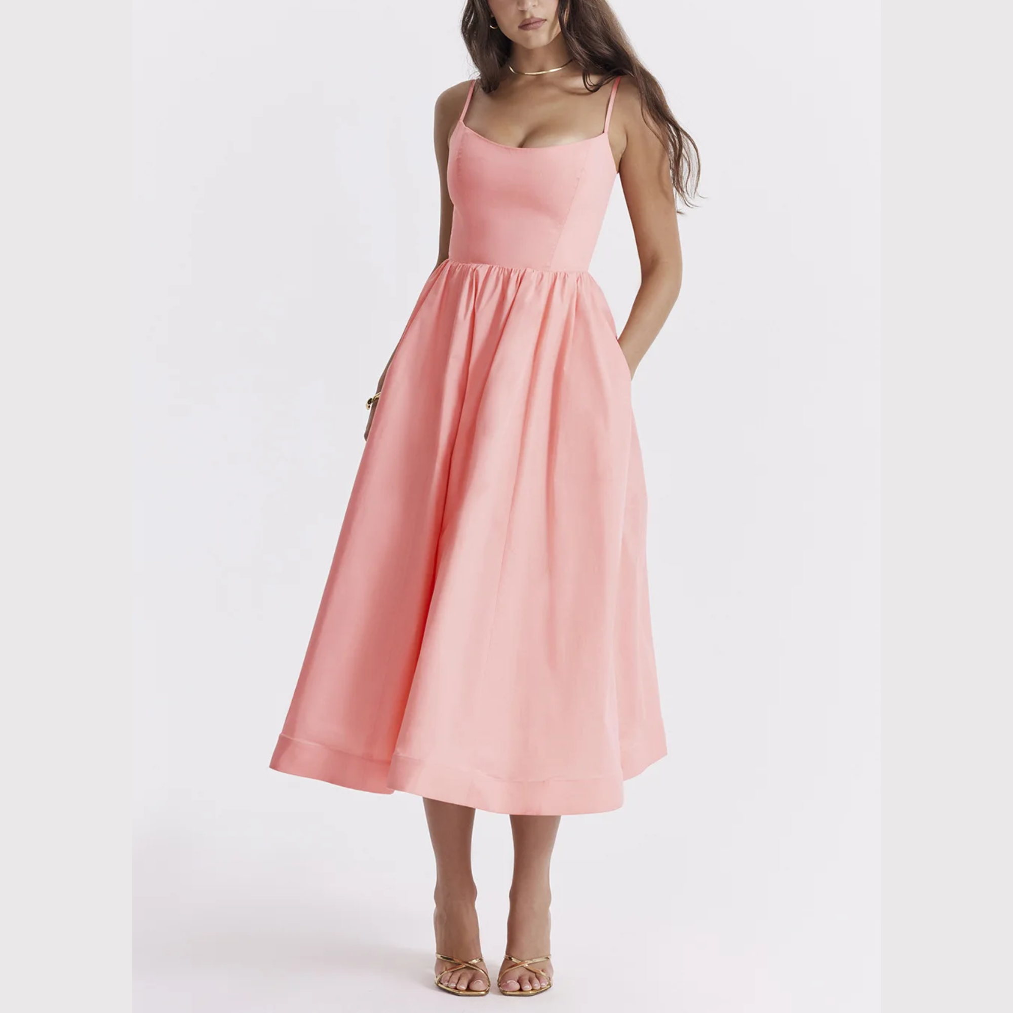 Erleben Sie Eleganz mit unserem ausgestellten Midikleid mit Spaghettiträgern in A-Linie. Das figurbetonte Oberteil und der fließende Rock verleihen diesem Kleid eine anmutige Silhouette. Die Spaghettiträger verleihen ihm einen zarten Touch und eignen sich perfekt für legere Anlässe und besondere Anlässe. Das leichte, atmungsaktive Material sorgt für Komfort ohne Abstriche beim Stil. Kombinieren Sie es mit Sandalen für einen entspannten Look oder mit High Heels für ein Statement. Dieses vielseitige und schicke Midikleid ist ein Must-have für Ihre Garderobe.