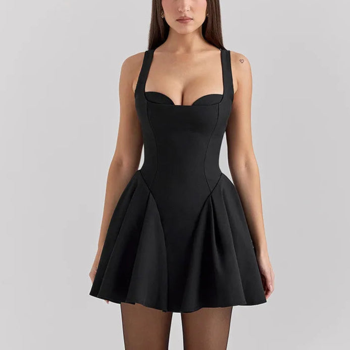 Turn heads at any event with this stunning dress. Featuring a sweetheart neckline and wide straps, it provides both elegance and comfort. The fitted bodice accentuates your curves, while the flared skirt offers a touch of playful sophistication. Made from high-quality fabric, this dress ensures a comfortable fit for any occasion. The added charm of gold hoop earrings and sheer black stockings makes this outfit an all-time favorite for evening parties or special occasions. Add a personal touch with accessories like a delicate bracelet or a small shoulder tattoo.