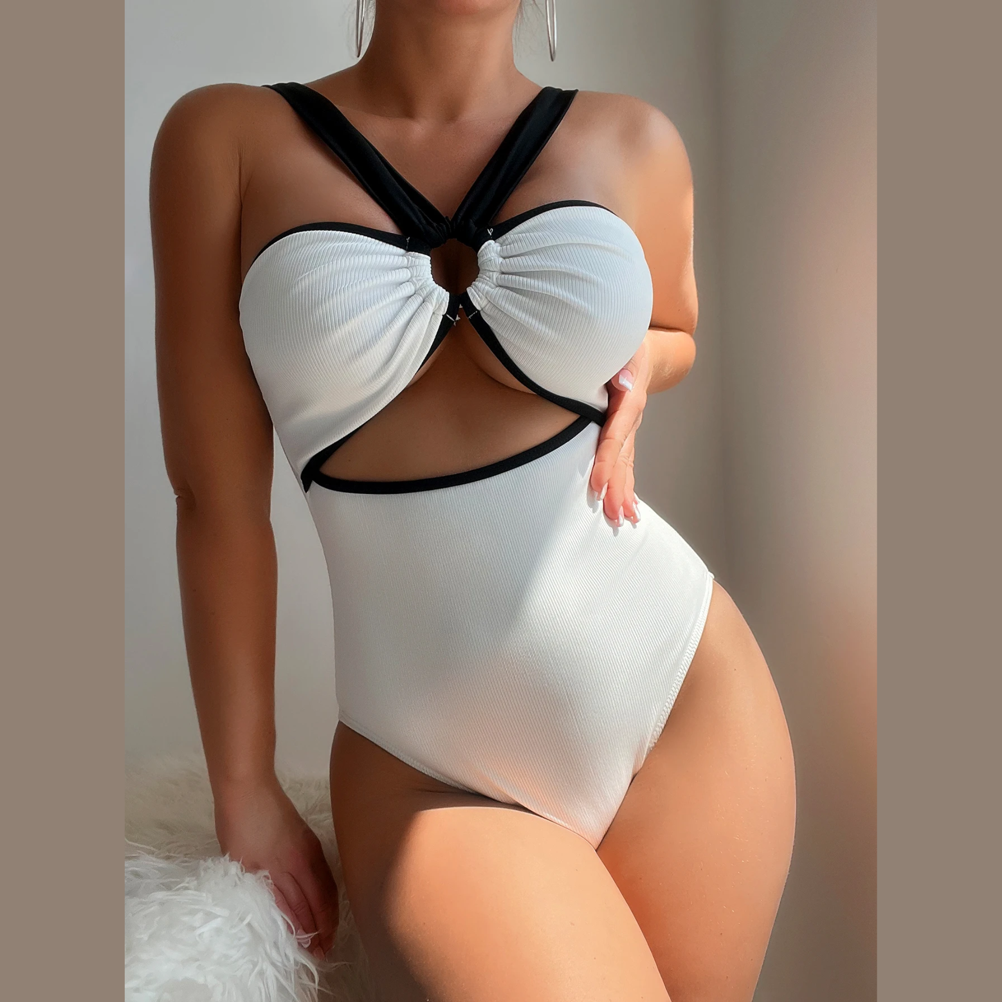 Make a bold statement at the beach or pool with our ribbed one-piece swimsuit in crisp white. Highlighted by black trim and a daring cutout at the chest, this design offers a perfect balance of modern edge and timeless sophistication. The crossed black straps at the neck add an extra element of chic style. This swimsuit is ideal for those who love to blend comfort with high fashion. Team it up with some eye-catching earrings for a standout look. Crafted from top-notch materials, this piece promises to be a staple in your swimwear collection.