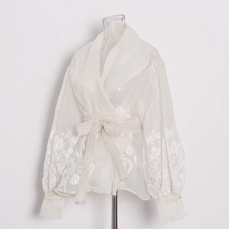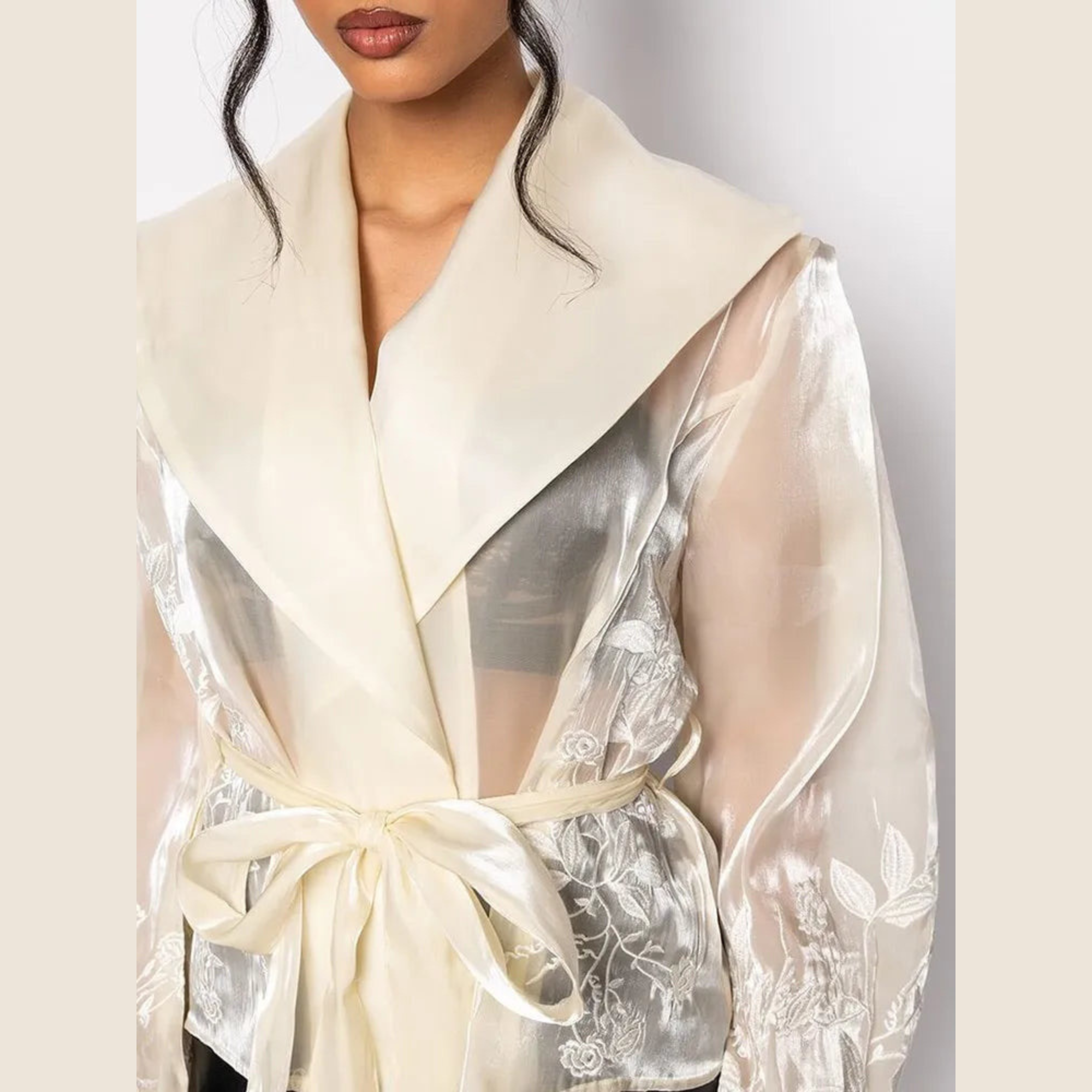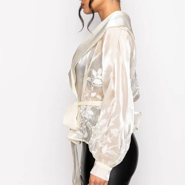 Elevate your wardrobe with this sheer organza tie-waist top, designed to bring a touch of modern elegance to any look. Featuring a lightweight, semi-transparent fabric with a dramatic collar and long sash belt, this blouse blends femininity with bold sophistication. Perfect for layering over bralettes, camis, or bodysuits, it transitions effortlessly from chic daytime styling to statement evening wear.