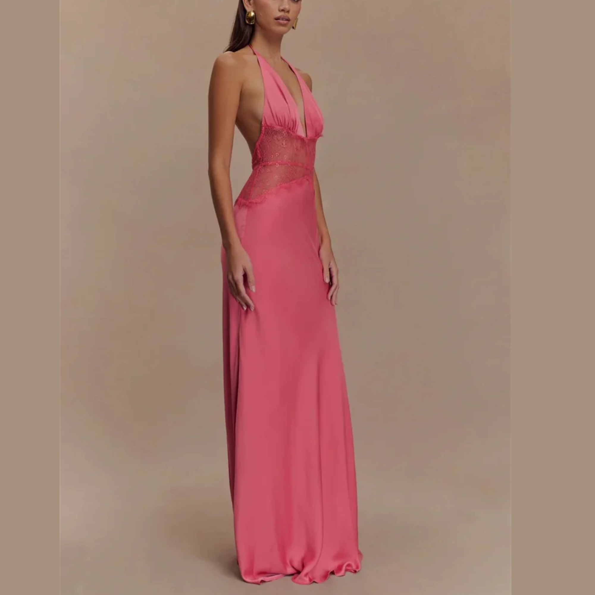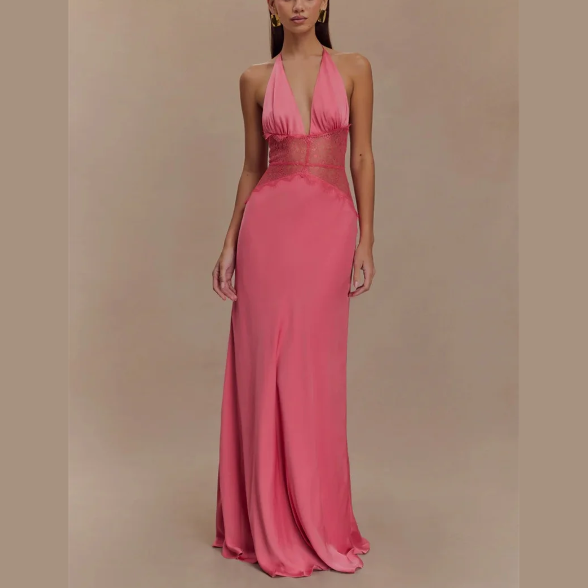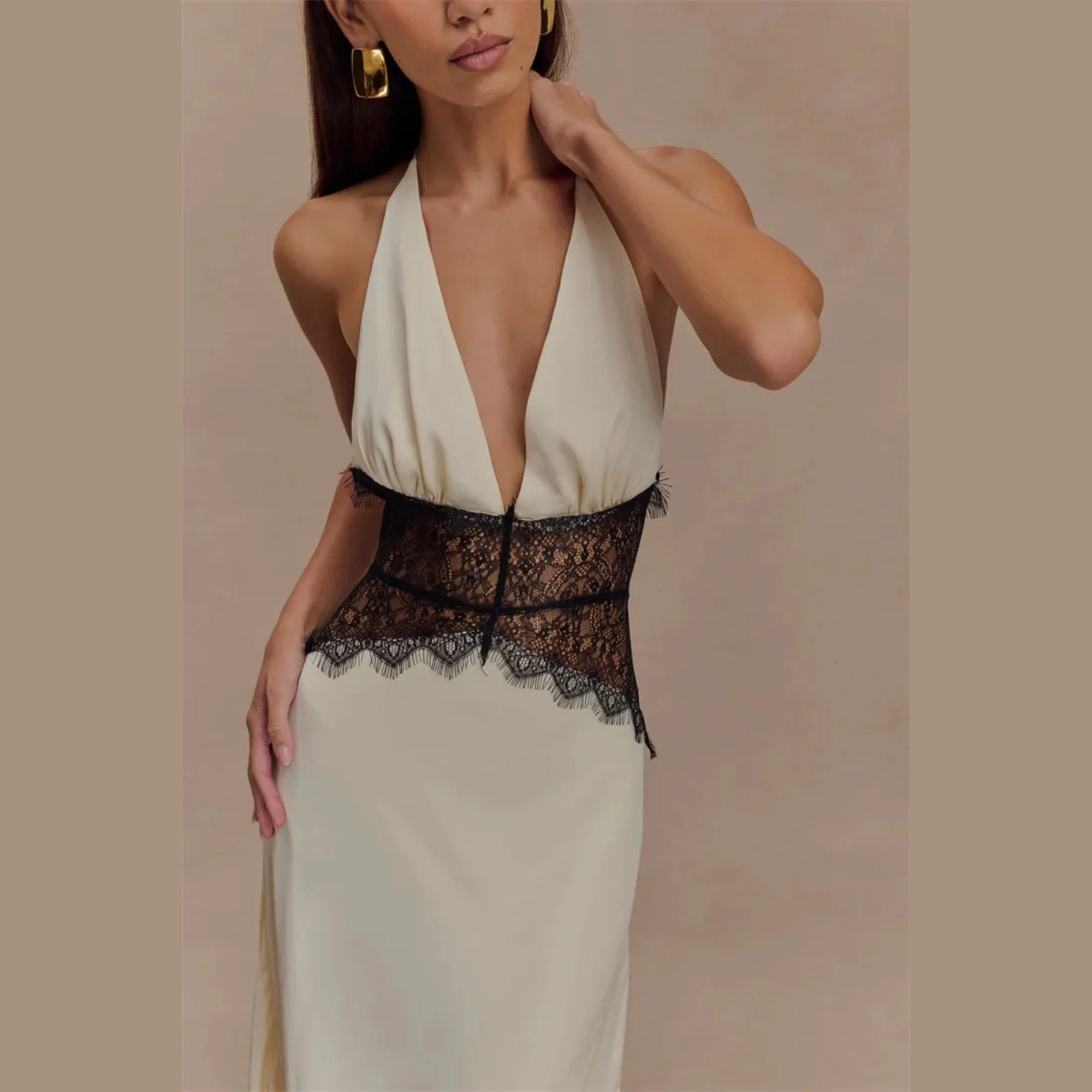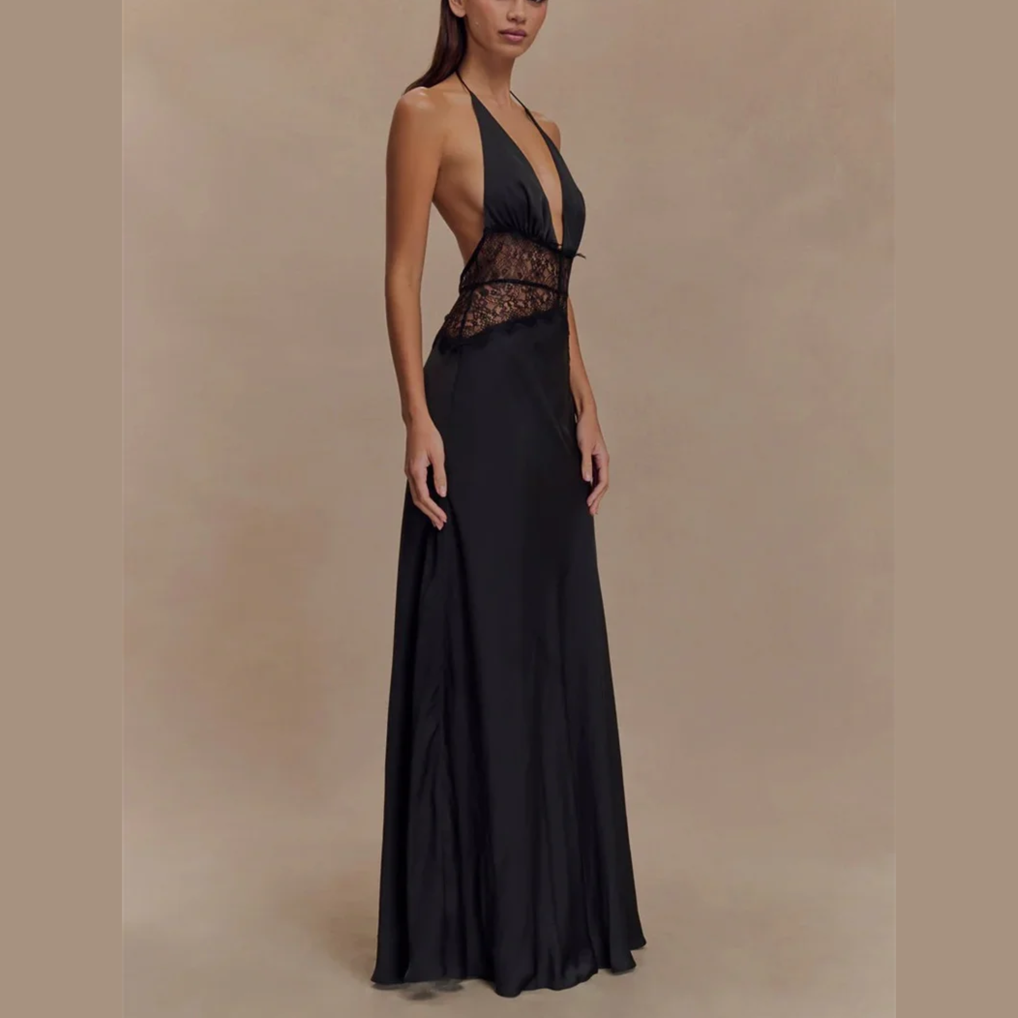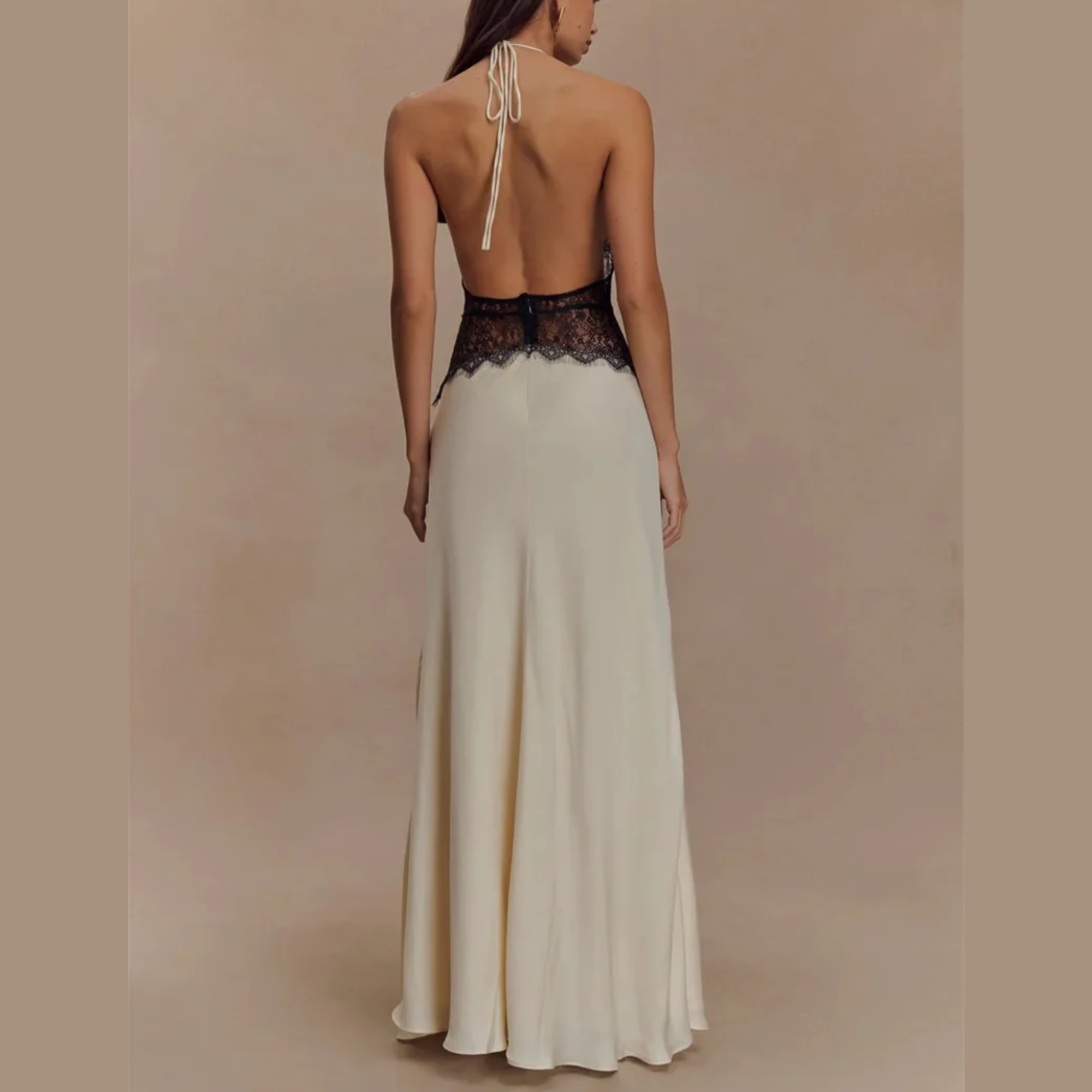 Elevate your evening wardrobe with this chic long halter gown. Available in classic black, pink or soft cream, this dress features delicate lace detailing at the waist for an elegant touch. Ideal for formal gatherings, this versatile gown allows you to exude grace and poise. Pair it with your favorite accessories and be ready to turn heads at any event, from glamorous parties to intimate dinners.