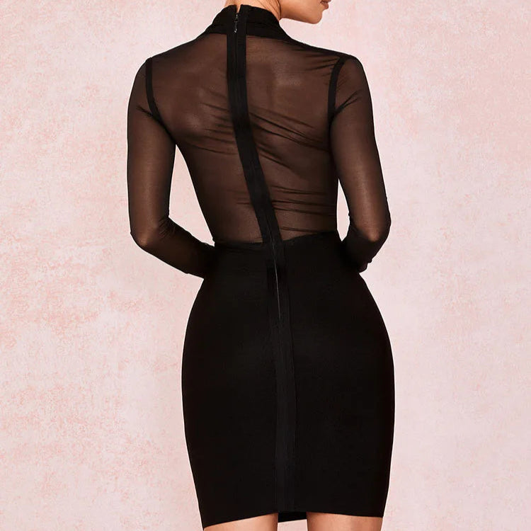 Machen Sie einen umwerfenden Eindruck in unserem schwarzen, kurzen Bandage-Kleid mit tiefem V-Ausschnitt. Elegantes Netzgewebe an den langen Ärmeln, der Taille und dem Rücken vereint dieses Kleid Raffinesse mit einem Hauch von Verführung. Der figurbetonte Bandage-Stil schmiegt sich an Ihren Körper und sorgt für eine schmeichelhafte Silhouette, während die Netzdetails einen Hauch moderner Eleganz verleihen. Perfekt für einen Abend, eine Cocktailparty oder einen besonderen Anlass – dieses Kleid verleiht Ihnen ein selbstbewusstes und schickes Gefühl.