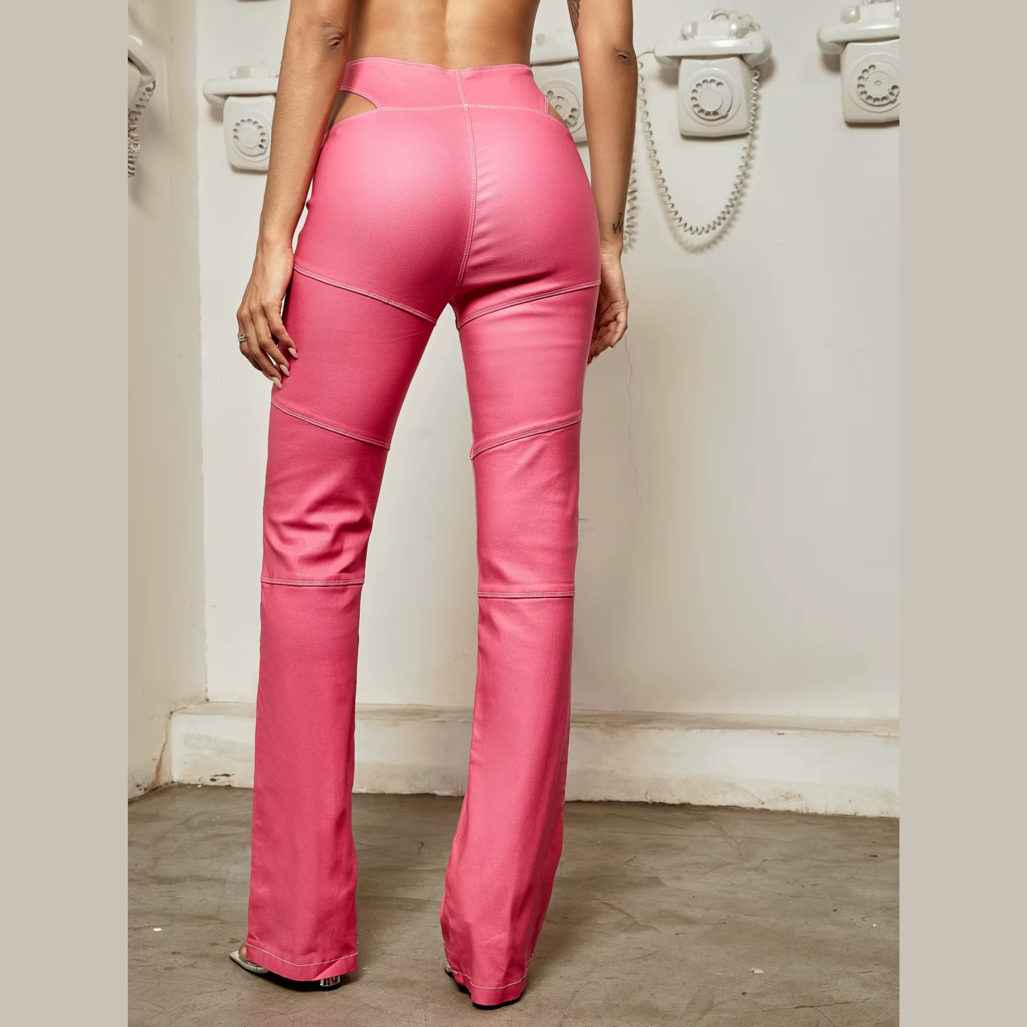 Mit dieser pinkfarbenen Bootcut-Hose aus Kunstleder mit hoher Taille verleihst du deinem Look den letzten Schliff. Mit ihrem stylischen Cut-Out an der Taille ist diese Hose die perfekte Mischung aus Eleganz und Eleganz. Sie wurde für selbstbewusste Fashionistas entworfen und bietet eine schmeichelhafte Passform, die deine Kurven betont. Perfekt für einen Abend oder einen besonderen Anlass – kombiniere diese Hose mit deinem Lieblingstop und High Heels für den perfekten Look.