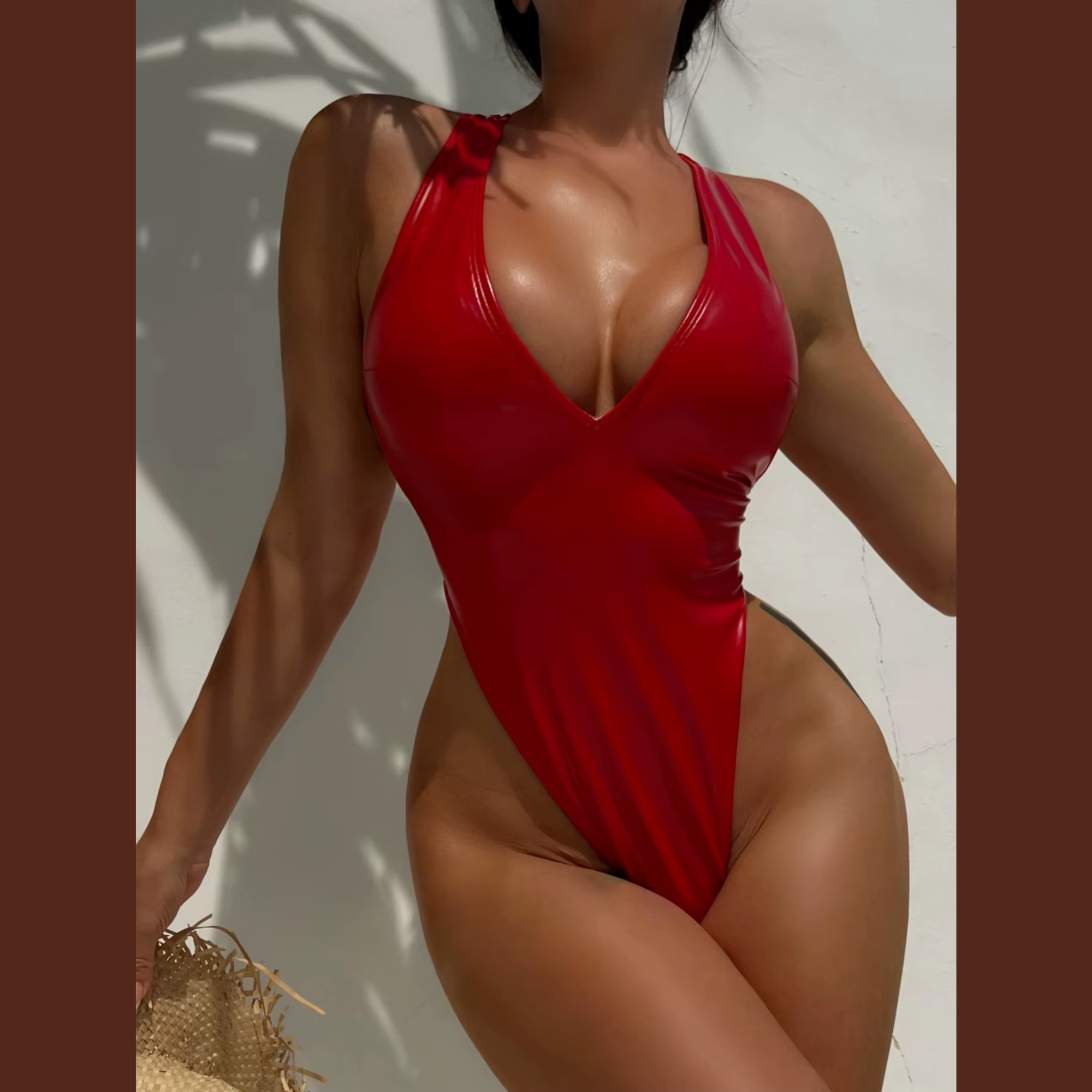 Mit unserem atemberaubenden Badeanzug ziehen Sie am Strand oder Pool alle Blicke auf sich. Dieser Badeanzug aus hochwertigem rotem Kunstleder besticht durch seinen gewagten, tiefen V-Ausschnitt – perfekt, um Ihr Selbstbewusstsein und Ihren Stil zu präsentieren. Der tiefe Ausschnitt sorgt für einen eleganten, schicken Look, während das luxuriöse Material für Komfort und eine makellose Passform sorgt. Ideal für alle, die diesen Sommer ein starkes Modestatement setzen möchten. Erweitern Sie Ihre Bademodenkollektion mit diesem Must-have!