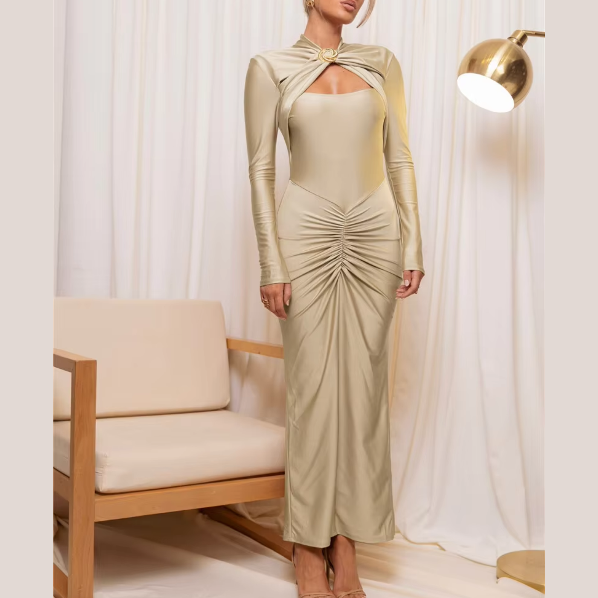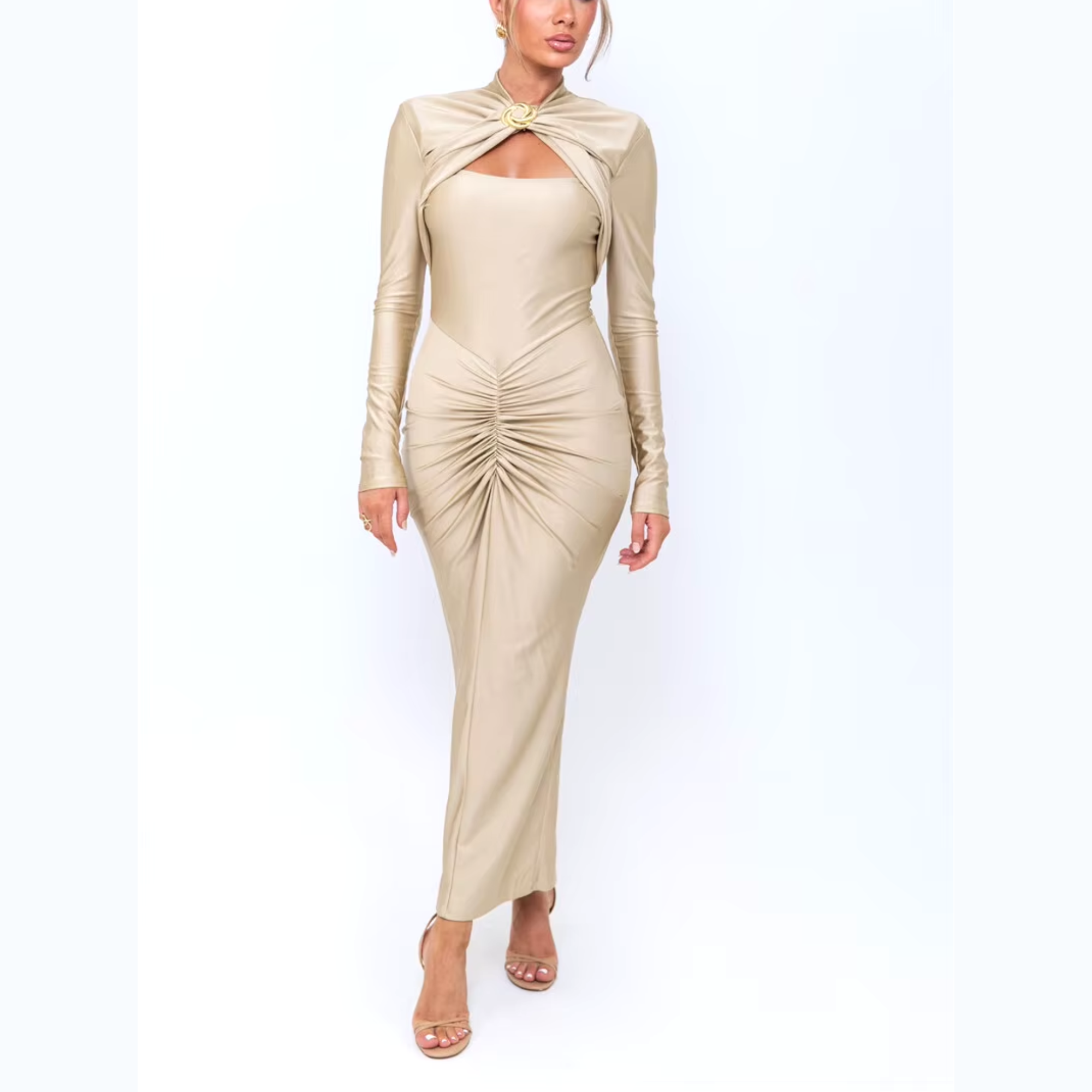 Eleve su guardarropa con nuestro elegante vestido Maxi Bodycon. Este diseño cautivador incluye un escote recortado, acentuado por una lujosa hebilla de oro para un glamour adicional. El Ruching en la falda delantera proporciona un aspecto que mejora la figura que complementa todos los tipos de cuerpo. La parte posterior presenta una división de buen gusto, que ofrece comodidad y una pizca de drama. Ideal para eventos de gala o una noche de salida, este vestido te asegura brillar con cada paso.