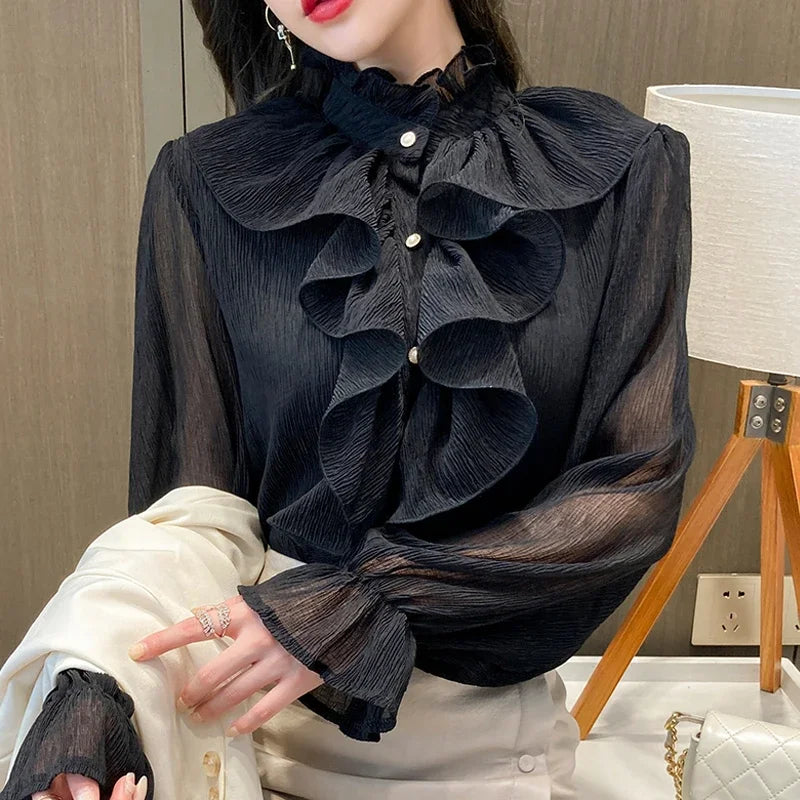 Softly romantic yet effortlessly refined — the Amelise Blouse captures timeless femininity with a modern edge. Designed with cascading ruffles along the front and delicately flared cuffs, this airy blouse adds a touch of vintage charm to any look. The semi-sheer texture and pearl button accents give it a graceful allure, making it perfect for both elegant evenings and elevated daywear.