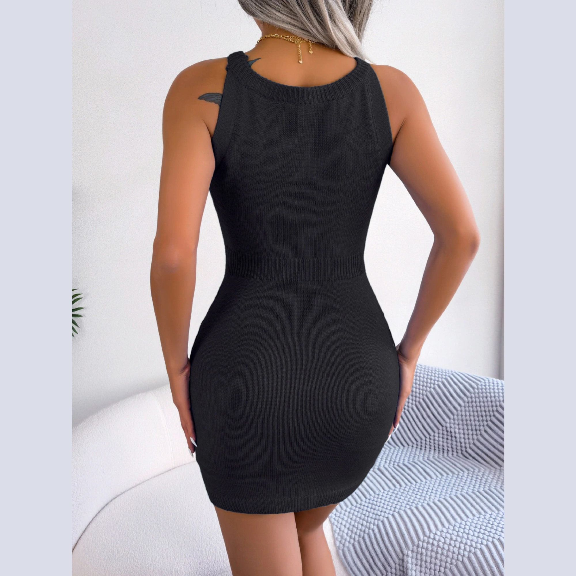 Sé la atracción principal donde quiera que vayas en Sandy. El impresionante ajuste resalta el patrón trenzado en todo el cuerpo. Se detalla en un escote redondo con un estilo de cabestro en los hombros sin mangas. Los botones decorativos resaltan aún más el estilo minimalista.