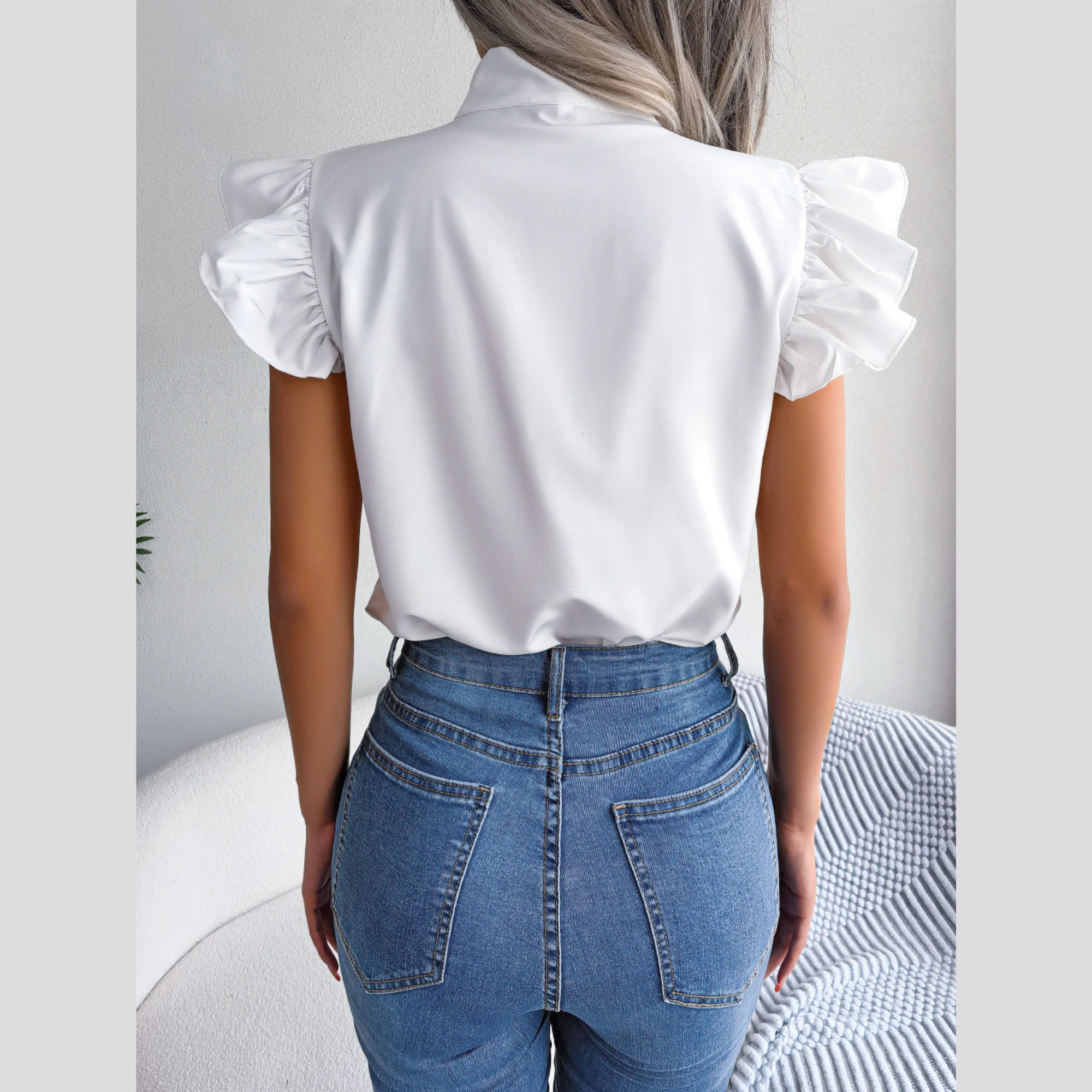 Para todos los eventos repentinos en su calendario, deslízate en Britney. Esta parte superior de ensueño presenta un tono sólido con un interior completamente forrado. El ajuste halagador se adapta a un escote de corbata con mangas con tapa con volantes. El estilo elegante de este top es imprescindible.