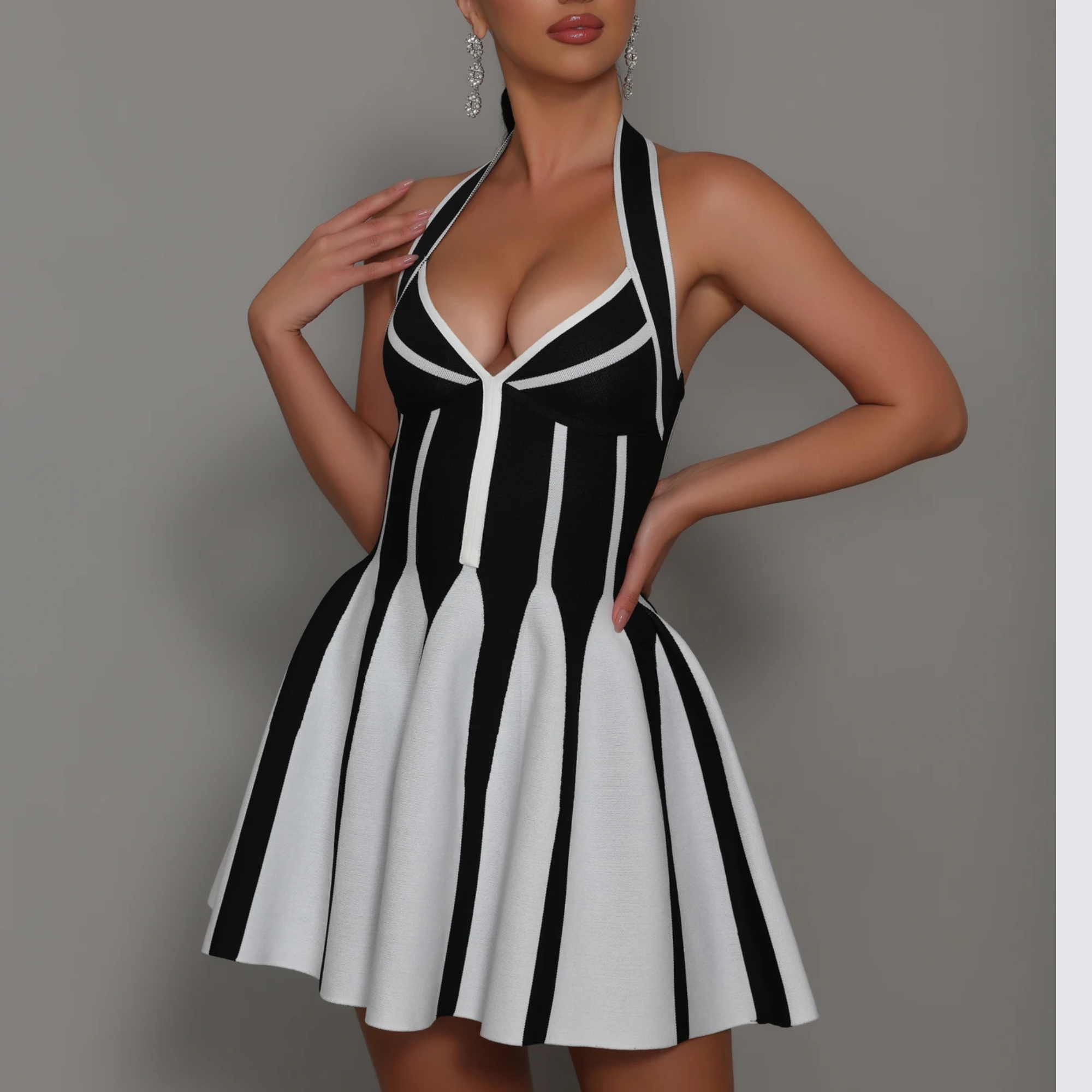 Turn heads with this stunning black and white striped halter bandage dress. The flattering halter neckline frames the shoulders beautifully, while the cinched waist enhances your natural curves. The flared skirt adds a playful touch, creating the perfect balance of elegance and fun. Designed to be as comfortable as it is stylish, this dress is perfect for parties, dinner dates, or casual outings. Accessorize with your favorite earrings and step out with confidence. Its timeless design ensures it will become a wardrobe favorite.