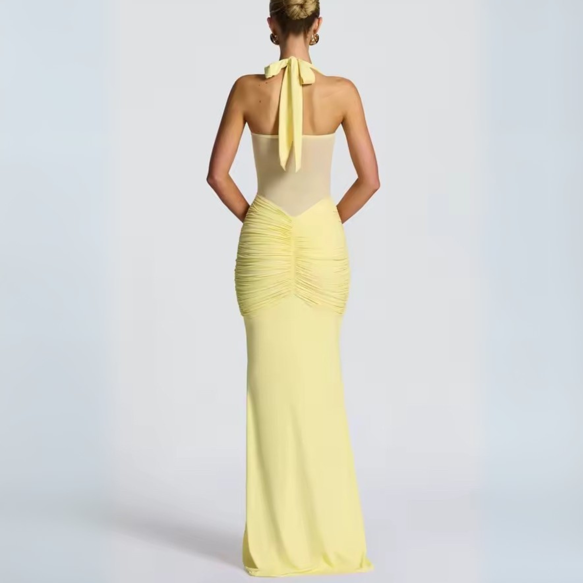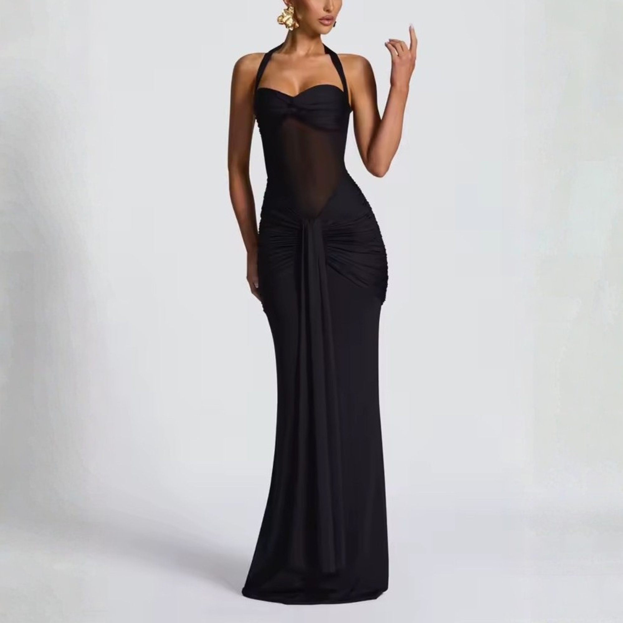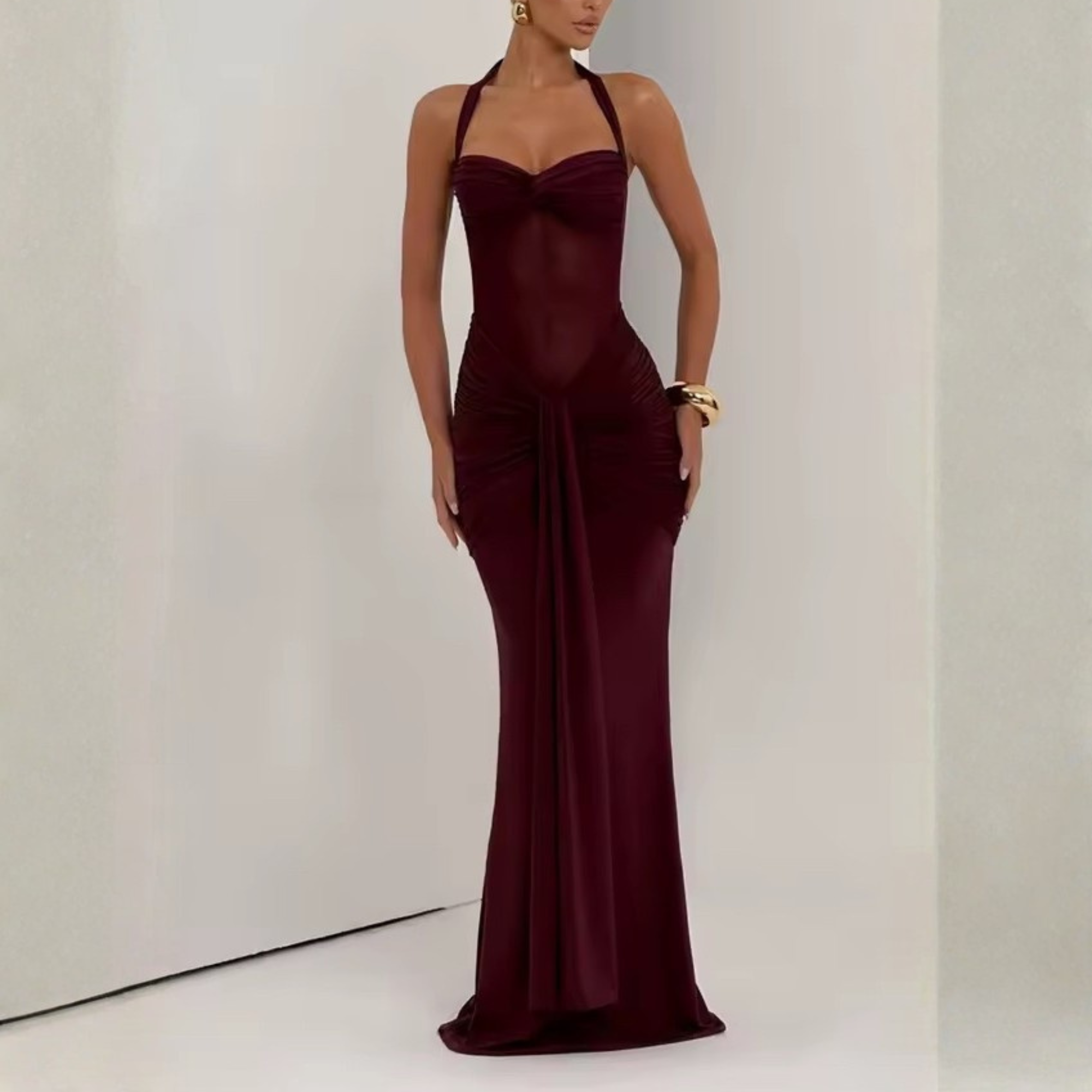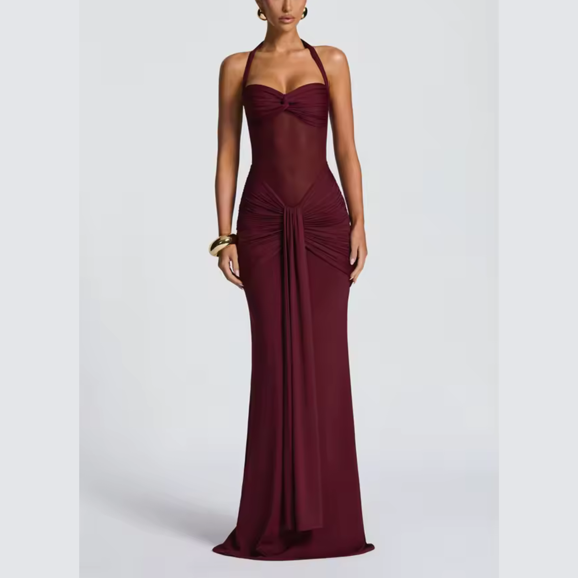 Turn heads in this show-stopping halter-neck maxi designed to sculpt, flatter, and make an entrance. Featuring a sweetheart bust with ruched detailing, the dress hugs your curves with a gathered draped design at the waist that enhances your figure. The sheer mesh midsection creates a striking hourglass illusion, while the floor-length skirt flows effortlessly with every step. Perfect for galas, birthdays, red-carpet events, and upscale evenings.