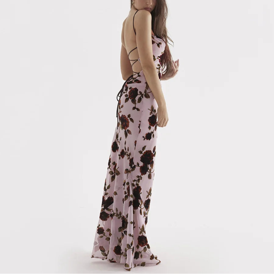 Unveil your inner fashionista with this stunning floral dress. The harmonious blend of dark red roses and green leaves on a light pink canvas creates a captivating design. With its sleek, fitted cut and thin black straps, this dress ensures both comfort and style. The cowl neckline offers a touch of modern elegance, making it ideal for a variety of occasions, from date nights to celebrations. Its timeless floral motif is perfect for those who love classic beauty with a contemporary twist. Complement with bold accessories and your favorite pair of heels for an unforgettable outfit.