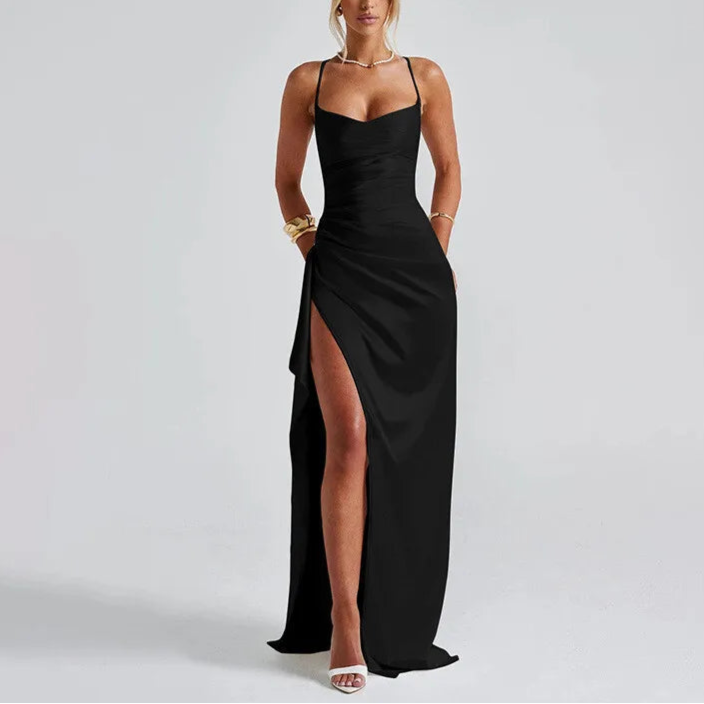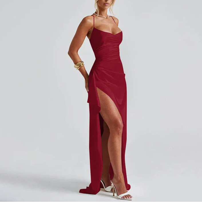 Turn heads in this stunning satin dress featuring a daring high slit. Perfect for a glamorous evening out or a special occasion, this dress will make you feel like a true star. Pair it with the included necklace and bracelet to complete the elegant look. Available in classic black, white and red to match your unique style.