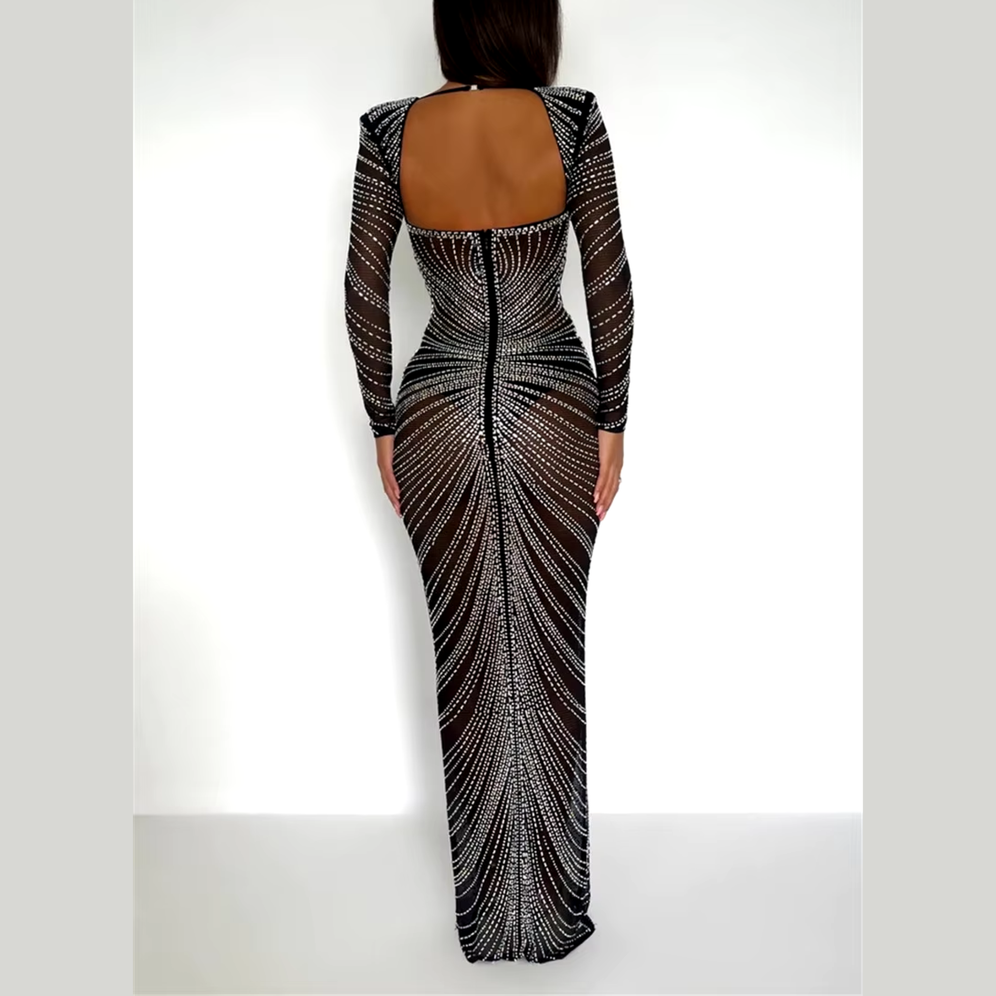 Convierta cada ocasión en una pista con nuestro vestido Maxi de malla negra, con intrincados adornos plateados. El estilo BodyCon resalta su figura, mientras que las mangas largas agregan un aire de sofisticación. Perfecto para galas, bodas o fiestas exclusivas, este vestido promete convertirlo en el centro de atención. El material de malla de alta calidad garantiza la transpirabilidad y la comodidad durante toda la noche. Combina con un embrague plateado y aretes de declaración para un conjunto inolvidable.