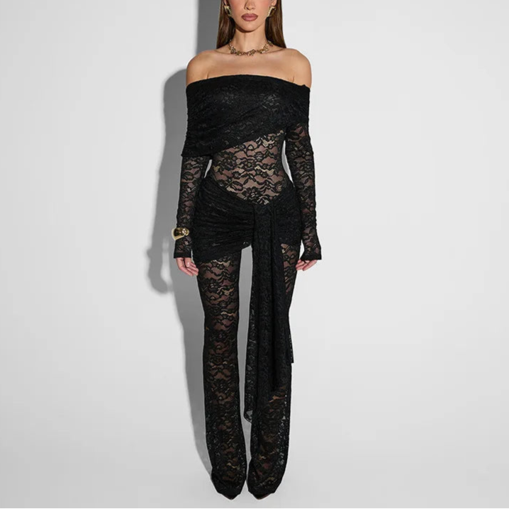Turn heads with this elegant black lace jumpsuit. The off-the-shoulder design and long sleeves provide a classic, timeless look. The draped detail at the waist adds a modern touch and creates a flattering silhouette. Perfect for a night out or special occasion, this jumpsuit is versatile and sophisticated. Paired with gold jewelry, you can elevate your outfit and stand out in any crowd.