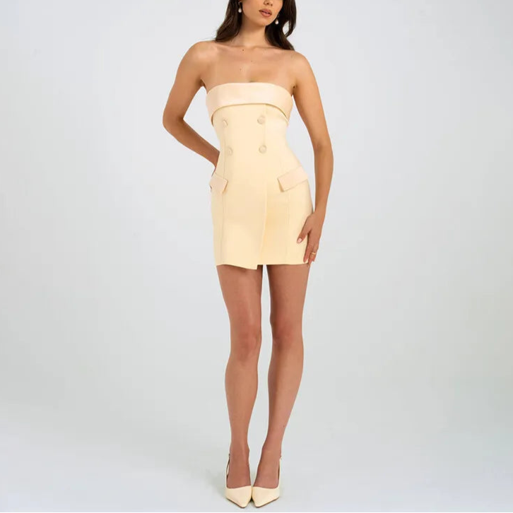 Actualice su guardarropa con nuestro impresionante mini vestido sin tirantes. El diseño de Bandeau plegable proporciona una silueta moderna y elegante, mientras que el detalle de doble pecho agrega un toque de sofisticación. Con bolsillos laterales falsos, este vestido combina la moda con un toque de practicidad. Ideal para cócteles, bodas o una cita elegante de la cena, este vestido está diseñado para que se sienta seguro y elegante. Hecho a partir de materiales premium, ofrece un ajuste y sensación perfectos. Haga coincidir con joyas de declaración para un conjunto completo.