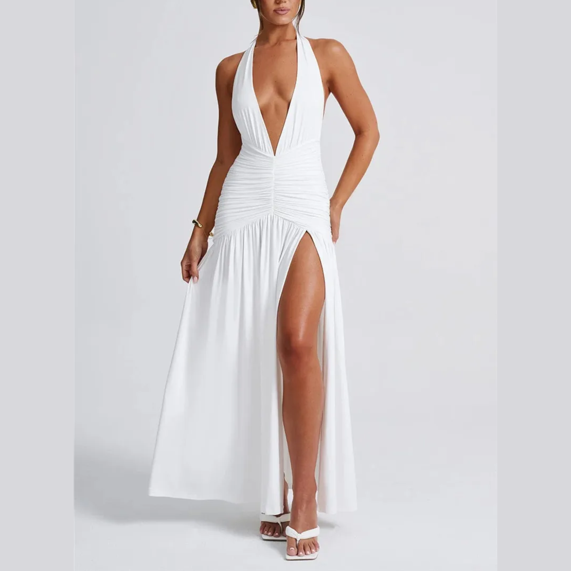 Presentando lo último en la ropa de noche elegante: un vestido maxi cautivador que exuda confianza y estilo. Diseñado con una sensual cuello de cabestro V profundo y una espalda abierta, este vestido asegura que hagas una entrada inolvidable. La división de la parte delantera hasta el muslo hasta el muslo mejora el ambiente glamoroso, lo que le permite mostrar sus piernas mientras se mueve con gracia. Ideal para bodas, graduación o una noche en la ciudad, este vestido combina sofisticación con un toque de seducción.