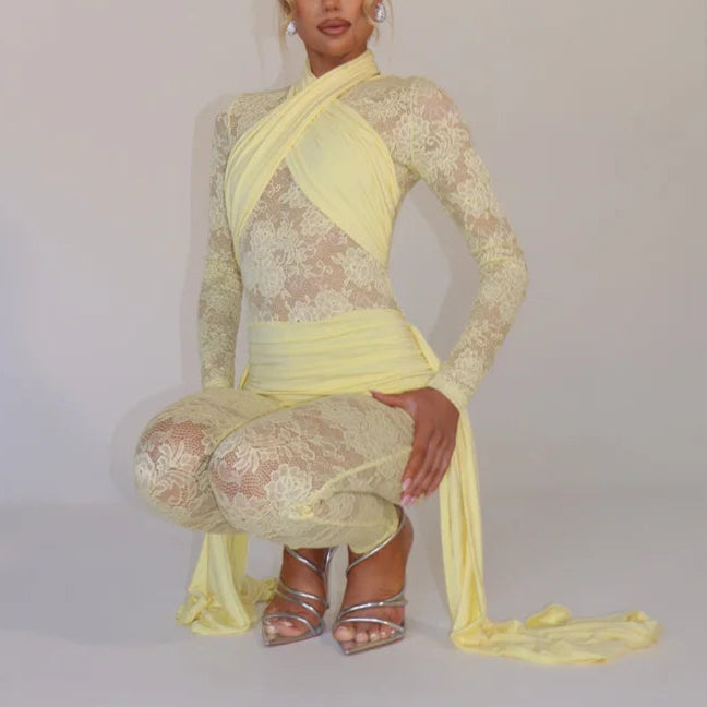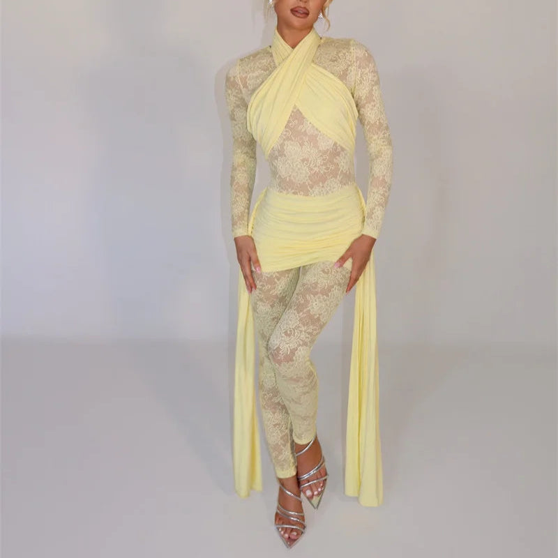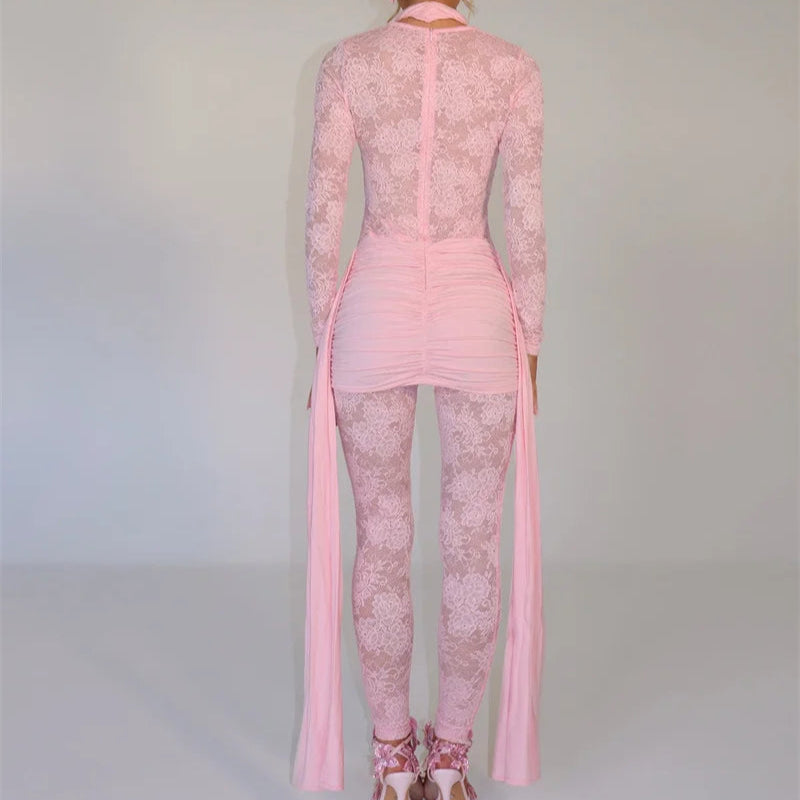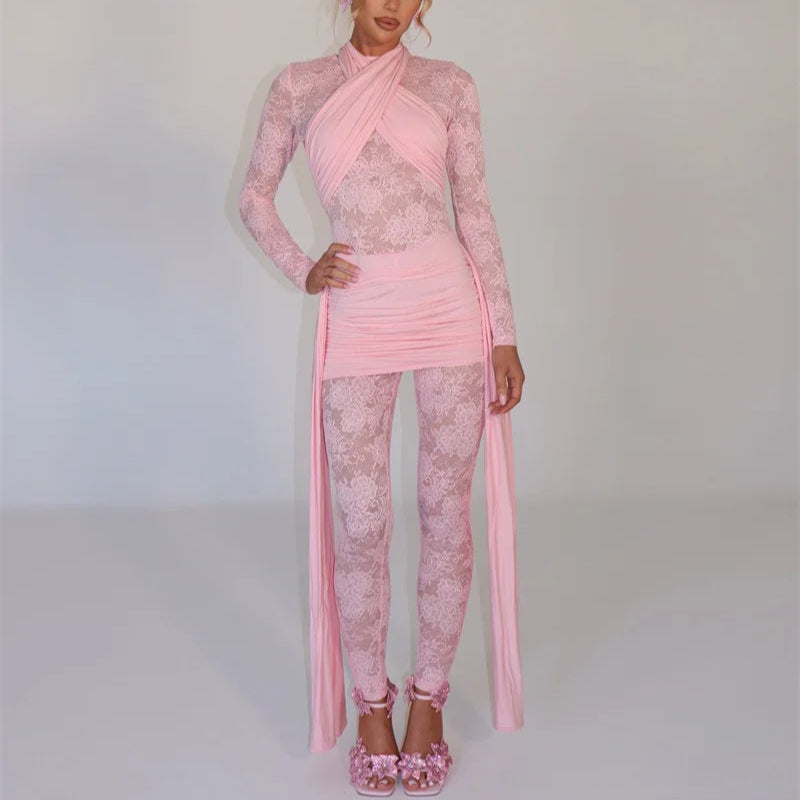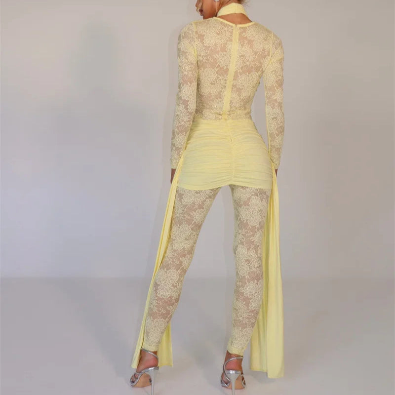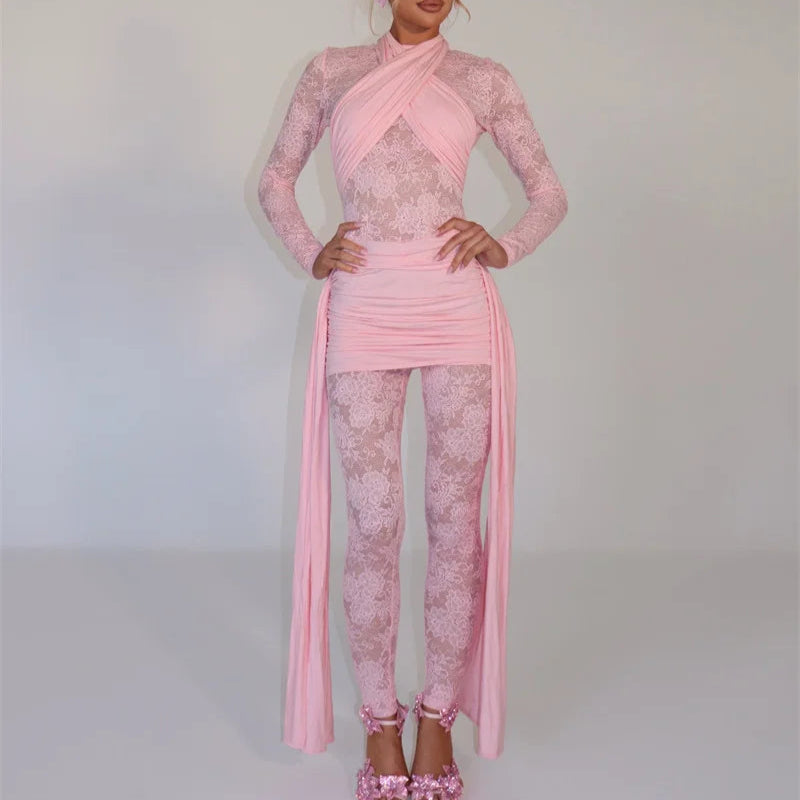 Turn heads in our exquisite lace jumpsuit with a contemporary twist. This all-in-one outfit features long sleeves and coordinating leggings for a cohesive, polished look. An elegant draped fabric adorns the bodice, forming a stylish, ruched short skirt with dramatic side panels that flow gracefully. Made with premium lace, it ensures you stay comfortable and chic. Make this sophisticated and fashionable jumpsuit a standout piece in your closet.