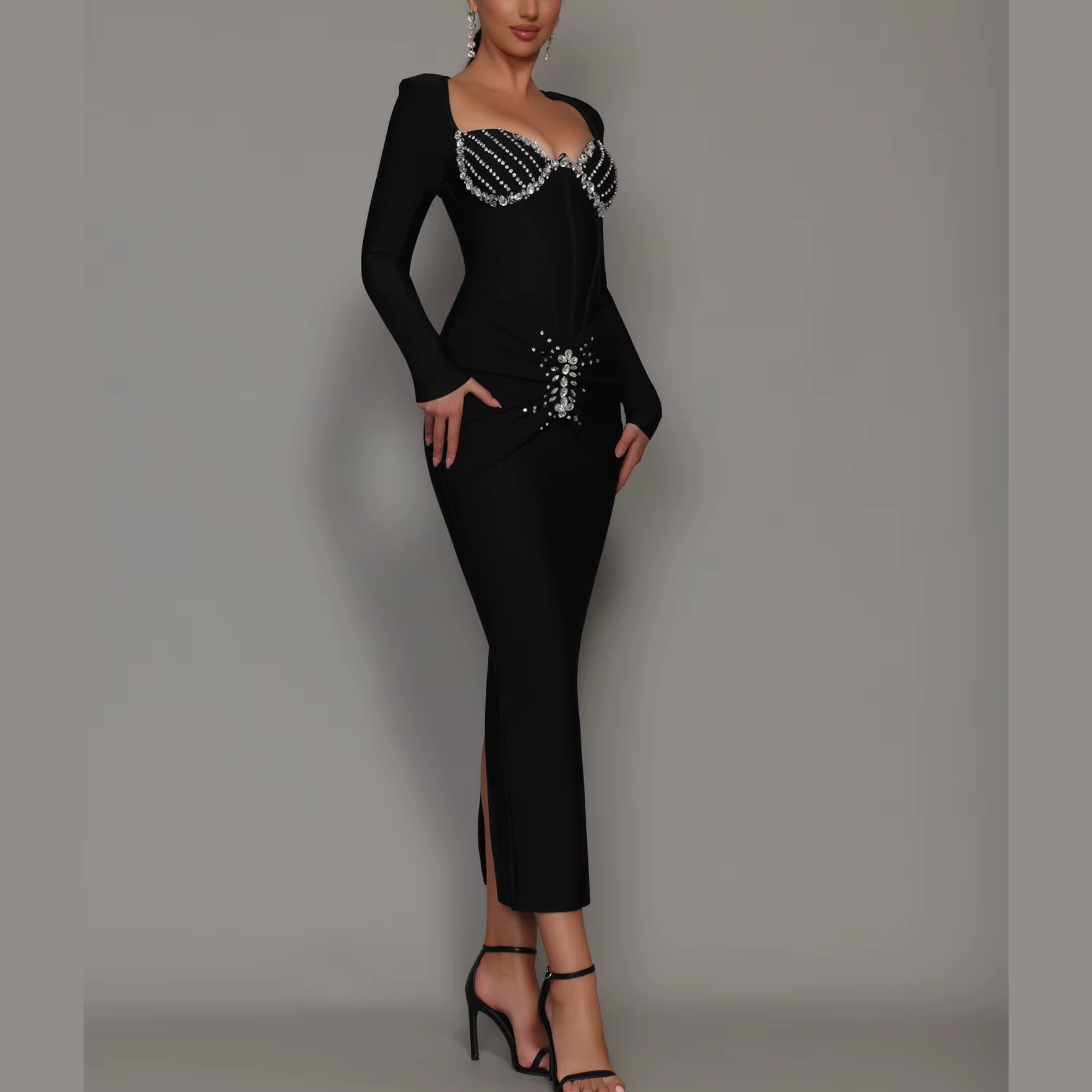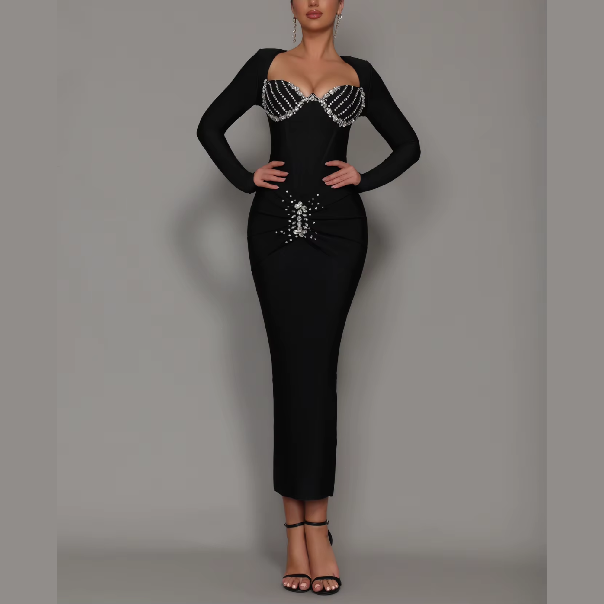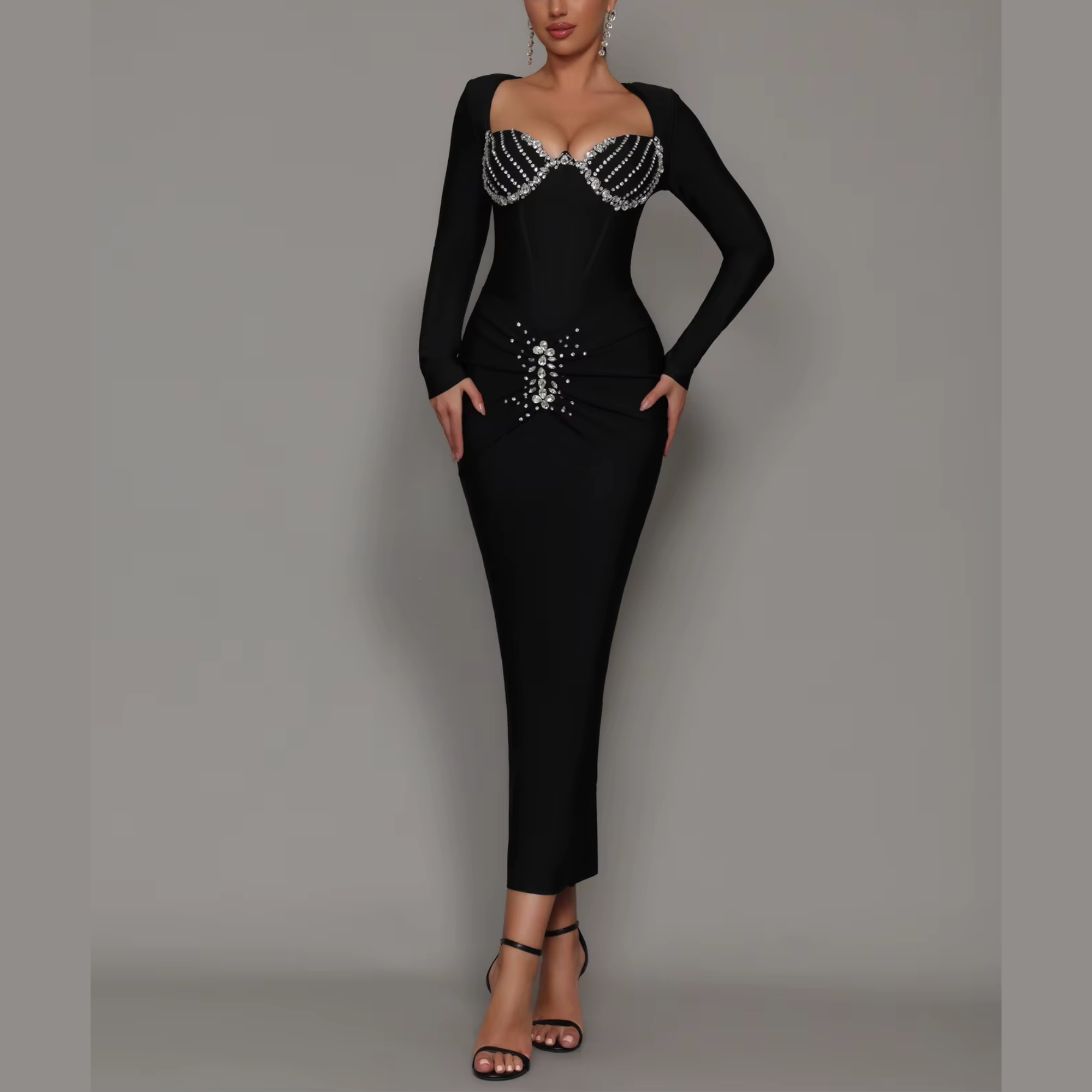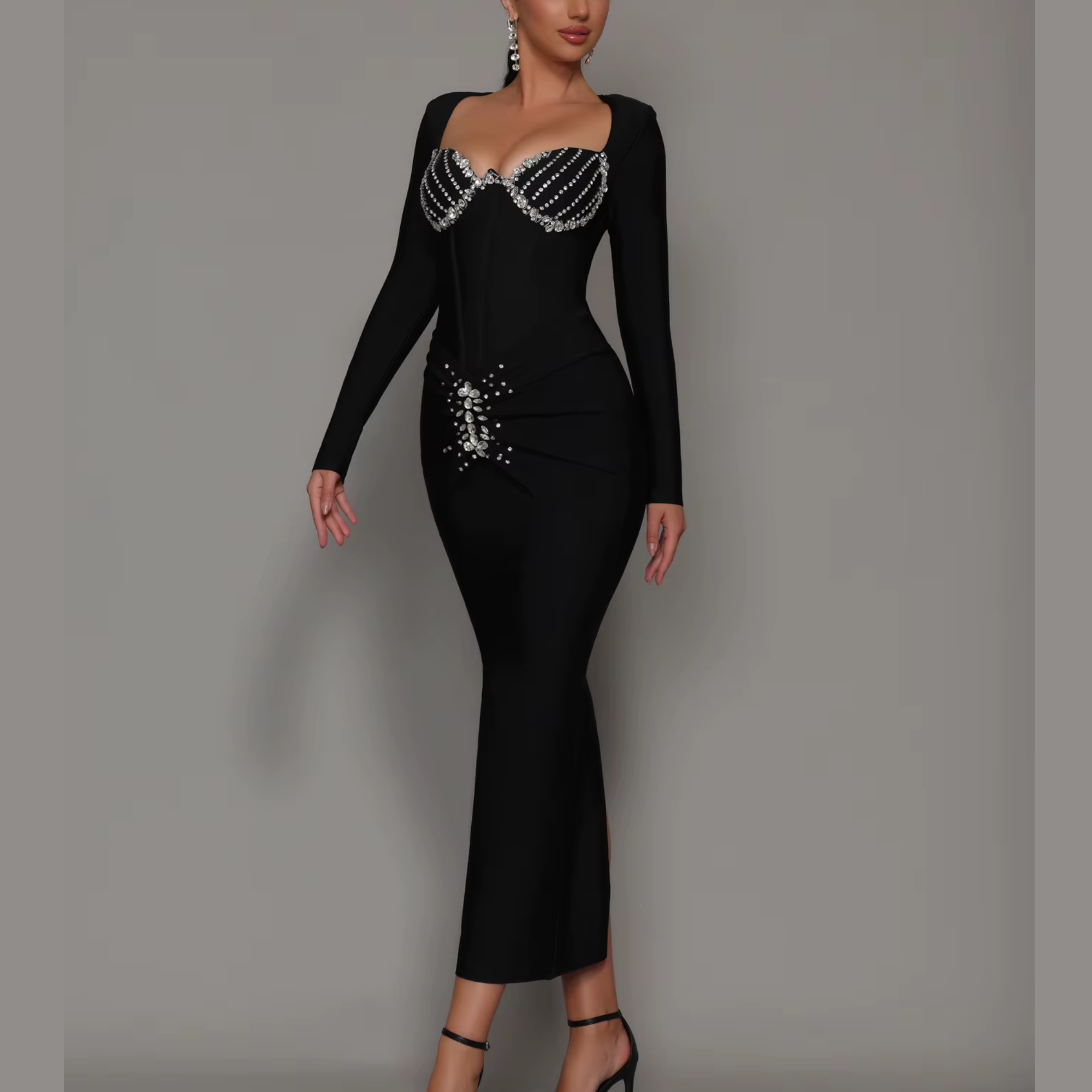 Entra en el centro de atención con este impresionante vestido negro de manga larga. Con un sofisticado escote corazón y adornado con relucientes cuentas plateadas o diamantes de imitación alrededor del busto y la cintura, este vestido ofrece elegancia y encanto. Perfecto para ocasiones formales, el vestido se combina maravillosamente con sandalias negras de tacón alto y se complementa con aretes largos y colgantes. Hecho para la mujer moderna que busca un estilo atemporal y encanto refinado, este vestido promete ser una curva en cualquier caso.