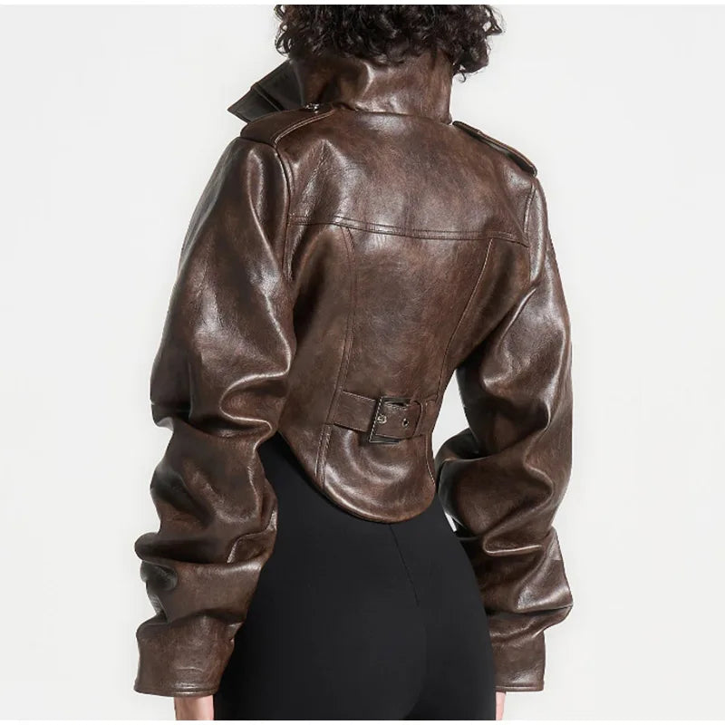Bold, structured, and effortlessly chic — the Tahlia Jacket redefines the modern silhouette. Crafted from soft yet durable faux leather, it features a sculpted waistline and voluminous sleeves that cinch into statement cuffs. The high collar and front zip closure add an edgy finish, while the cropped fit highlights your frame with a tailored, runway-inspired touch.