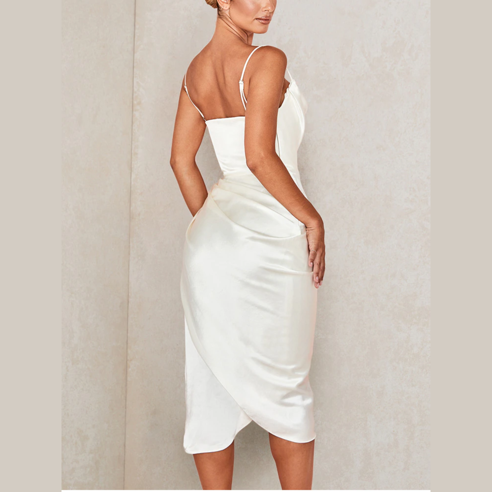 Tammy tiene una pista sensual con un estilo lúdico. Este impresionante vestido midi está hecho en una tela manchada con un escote de capucha de tiras y una falda midi drapeado al lado de la cintura. El dobladillo dividido superpuesto muestra sus piernas desnudas en exhibición.