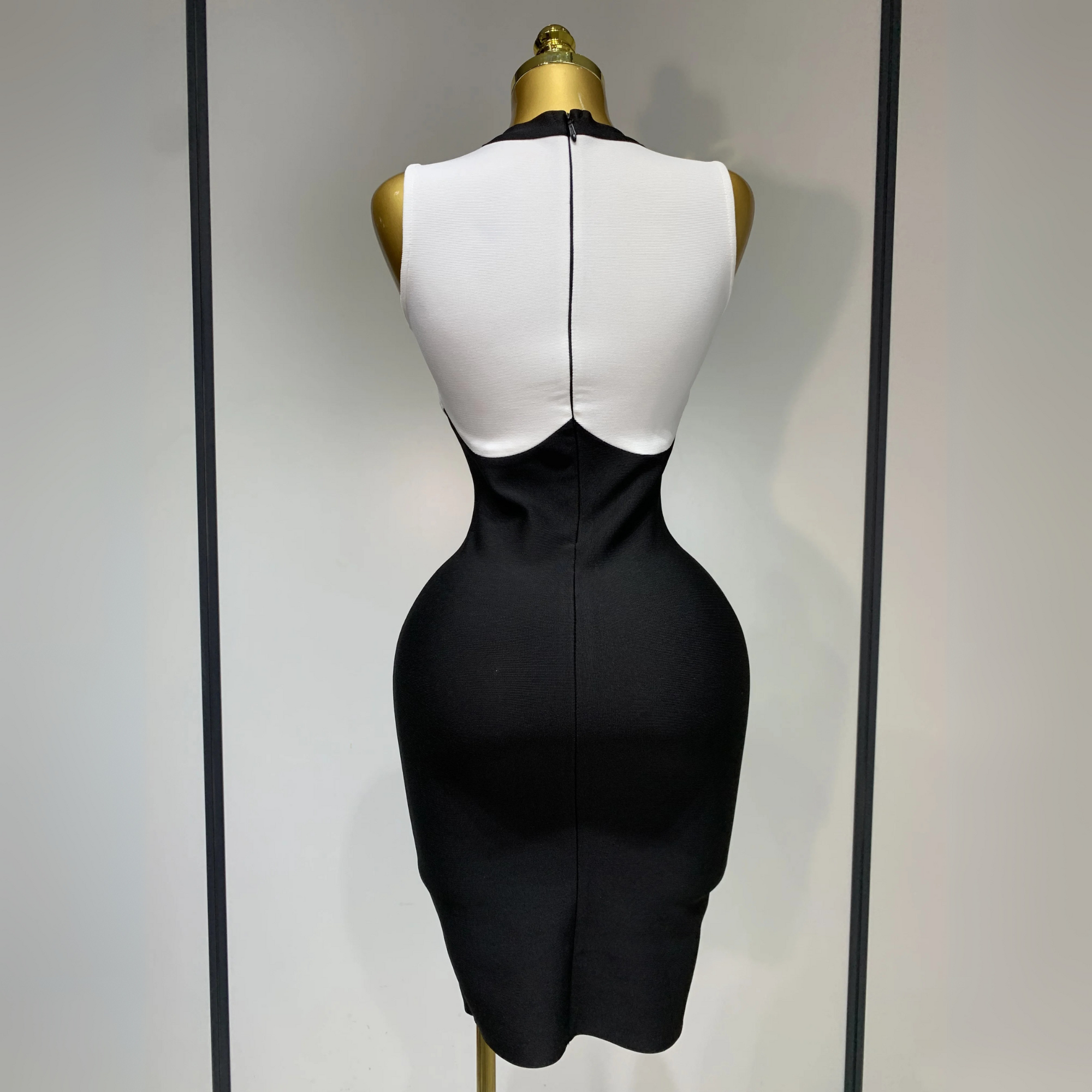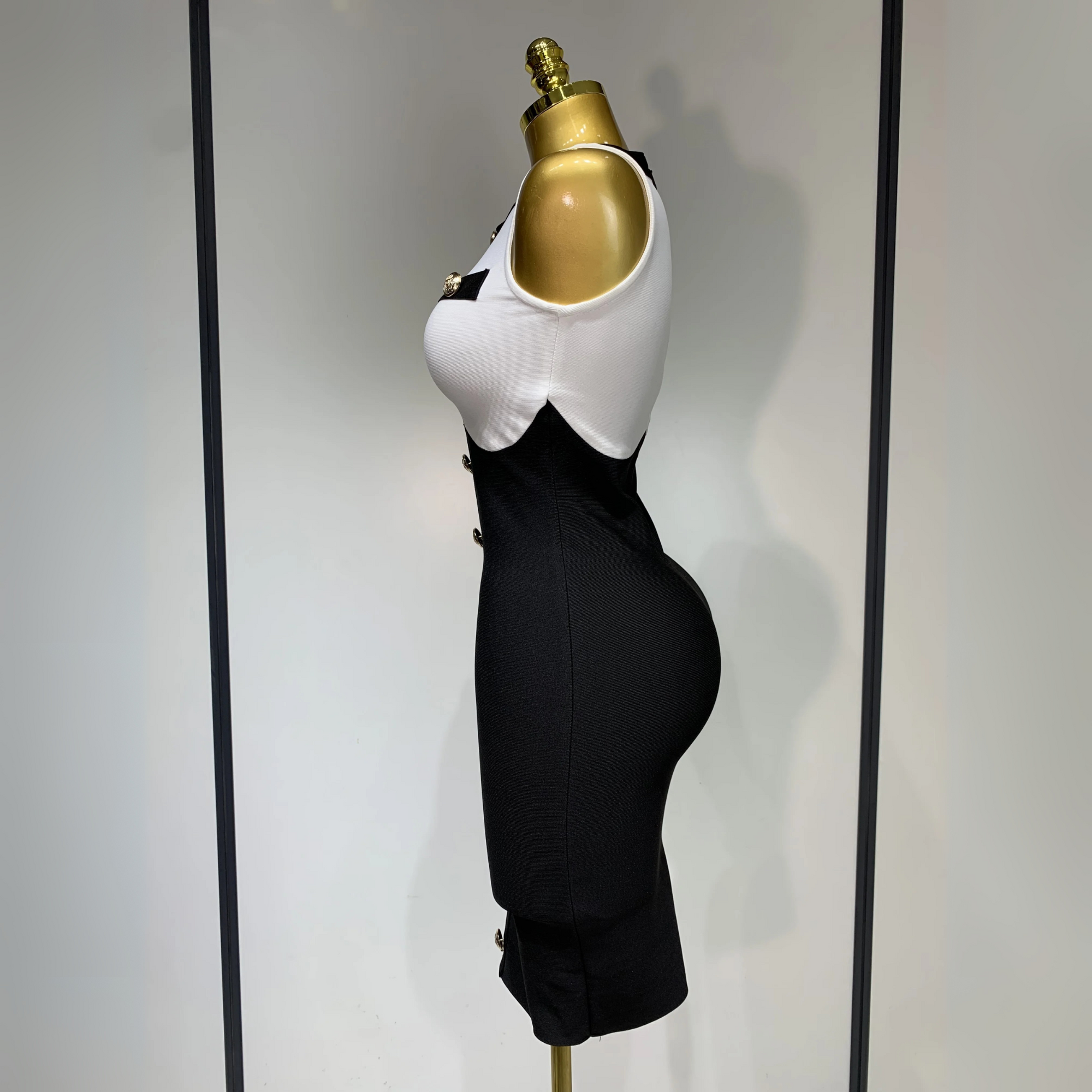 Turn heads effortlessly in this elegant black and white knee-length bandage dress. Designed with a tailored silhouette, this form-fitting piece flatters your curves without compromising comfort. The gold button detailing provides a touch of sophistication, making it suitable for any formal occasion or cocktail hour. Perfect for pairing with classic heels and a clutch, this dress guarantees a polished and stylish appearance that stands out in any crowd.