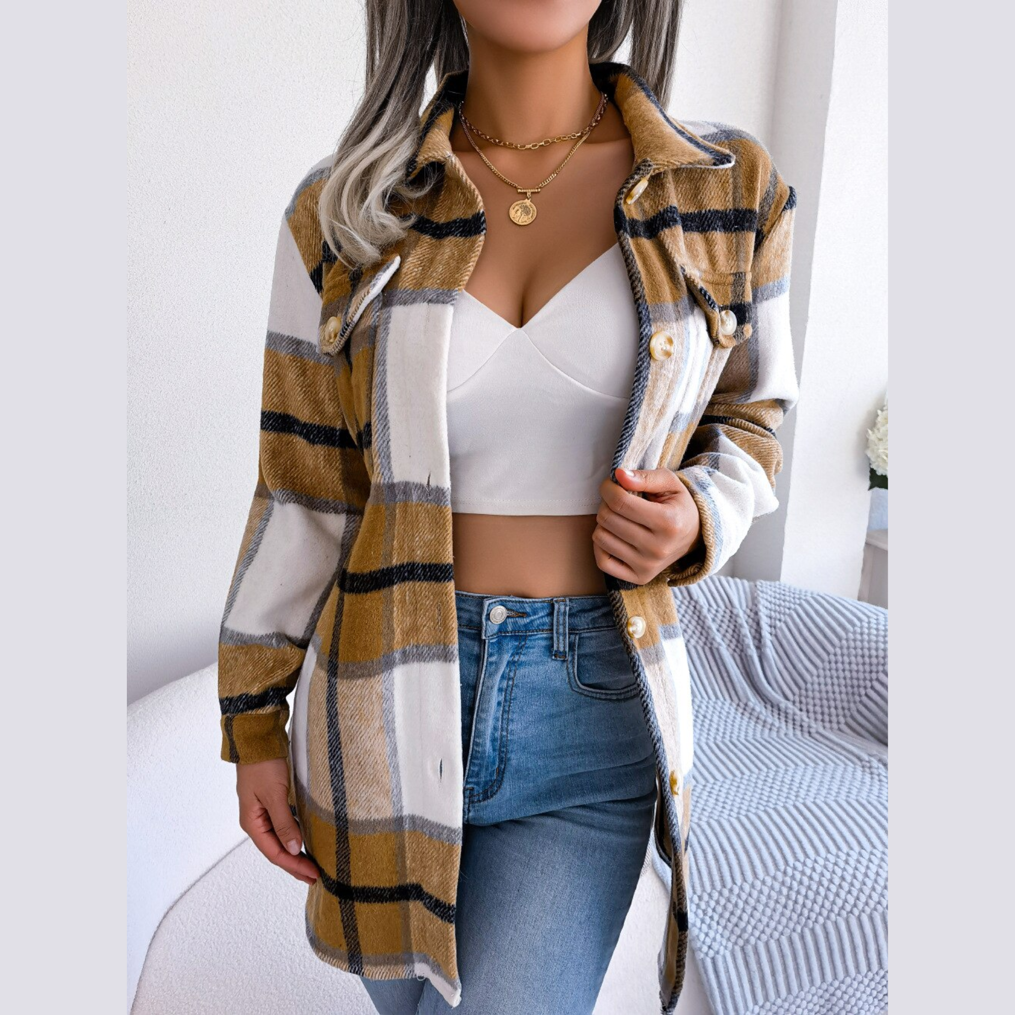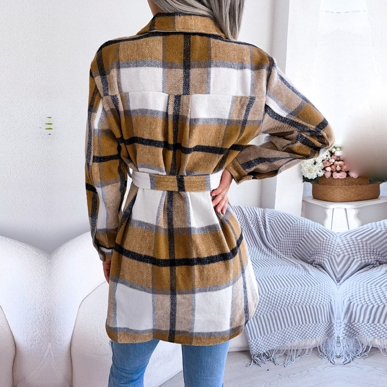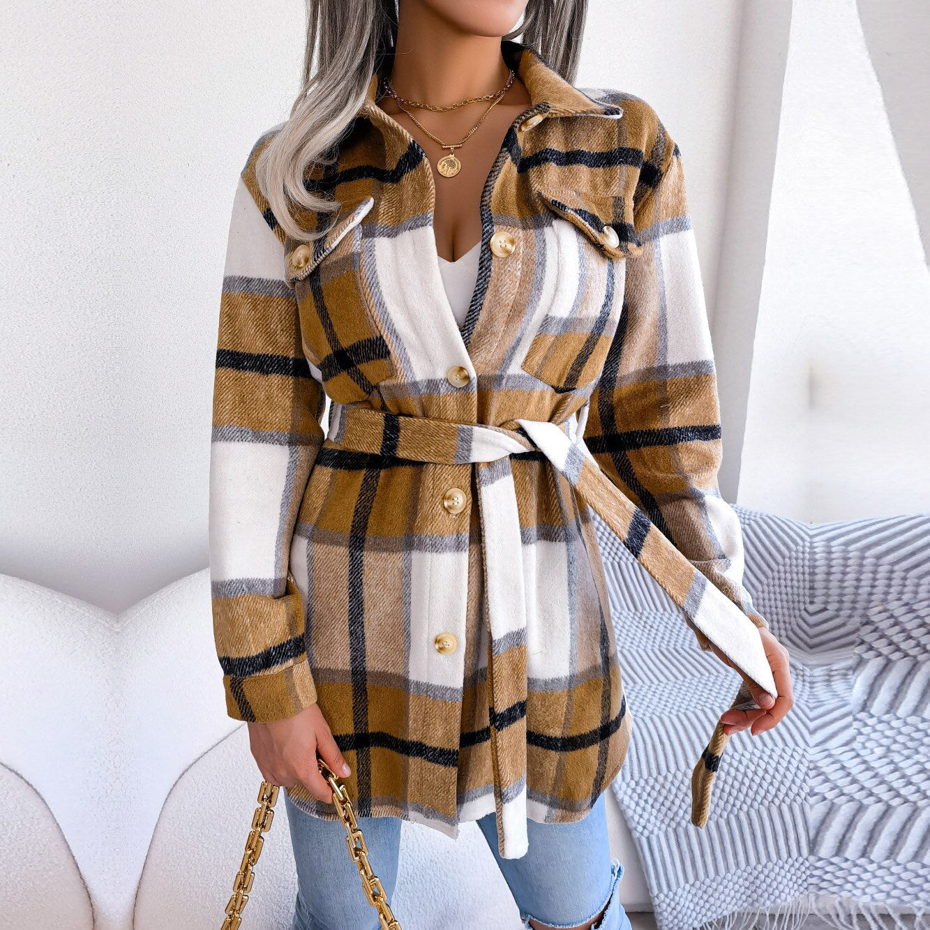 Las mañanas de la ciudad se sienten incluso más vendidas en Vivian. Este abrigo de lana presenta un patrón a cuadros en una paleta contrastante. Se detalla en un escote con cuello, mangas largas y un botón de frente con un cinturón a juego en la cintura para resaltar su silueta. Este abrigo se siente súper cómodo y termina a mediados de los tiempos. También disponible en Negro y Verde.