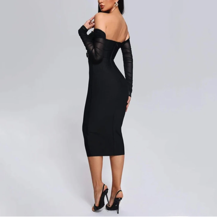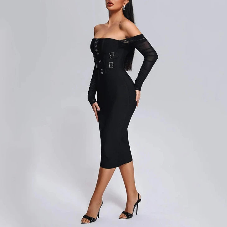 Step out in confidence with this stunning black off-the-shoulder midi bandage dress. Designed to hug your curves, it features long mesh sleeves that add an element of elegance. The bodice is adorned with a belt fasten embellishment, offering a chic and polished finish. Perfect for any special occasion, this dress ensures you'll be the center of attention.