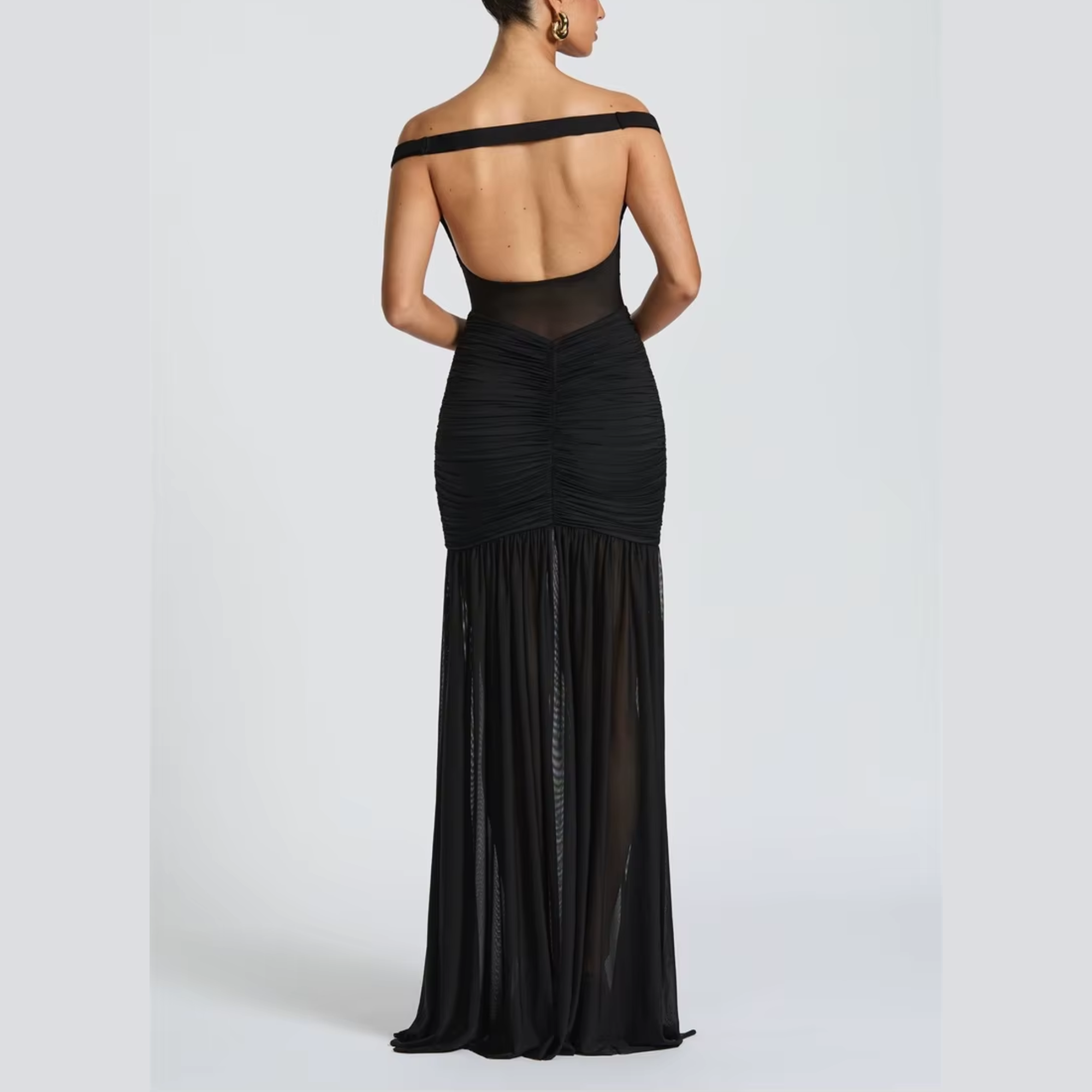 Elegance with a daring twist — the Ariella gown captures attention from every angle. Crafted with a sheer mesh bodice, ruched detailing through the waist, and an off-shoulder neckline that enhances your silhouette, this piece radiates red-carpet confidence. The flowing floor-length skirt with a thigh-high slit and chiffon side drape brings fluid movement with every step. Also available in multiple colors.