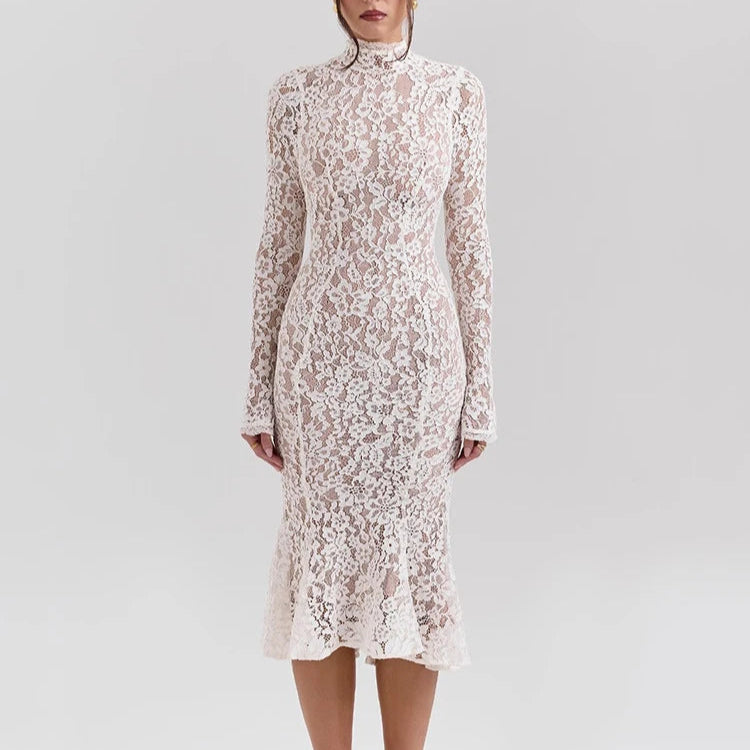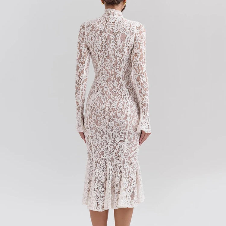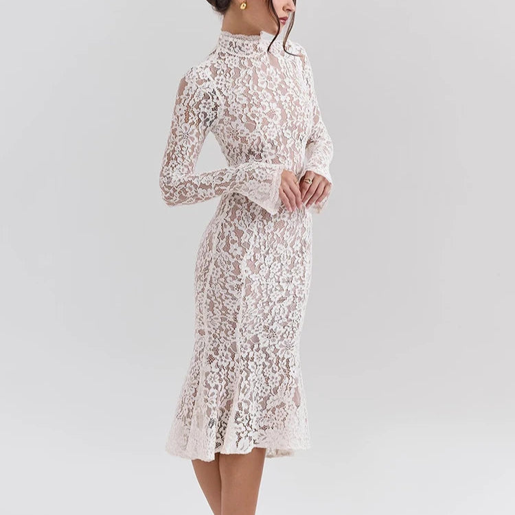 Step into classic beauty with this knee-length white lace dress. Featuring long sleeves and a high neckline, this piece captures elegance in every detail. Its fitted silhouette hugs the figure perfectly, and the flared hem ensures effortless movement. This dress transitions seamlessly from day to evening events, offering the ideal choice for engagements, dinner parties, or any formal celebration. Its timeless design makes it a must-have for anyone seeking both style and comfort. Pair with heels for an elevated ensemble, or dress it down for a relaxed yet polished appearance.