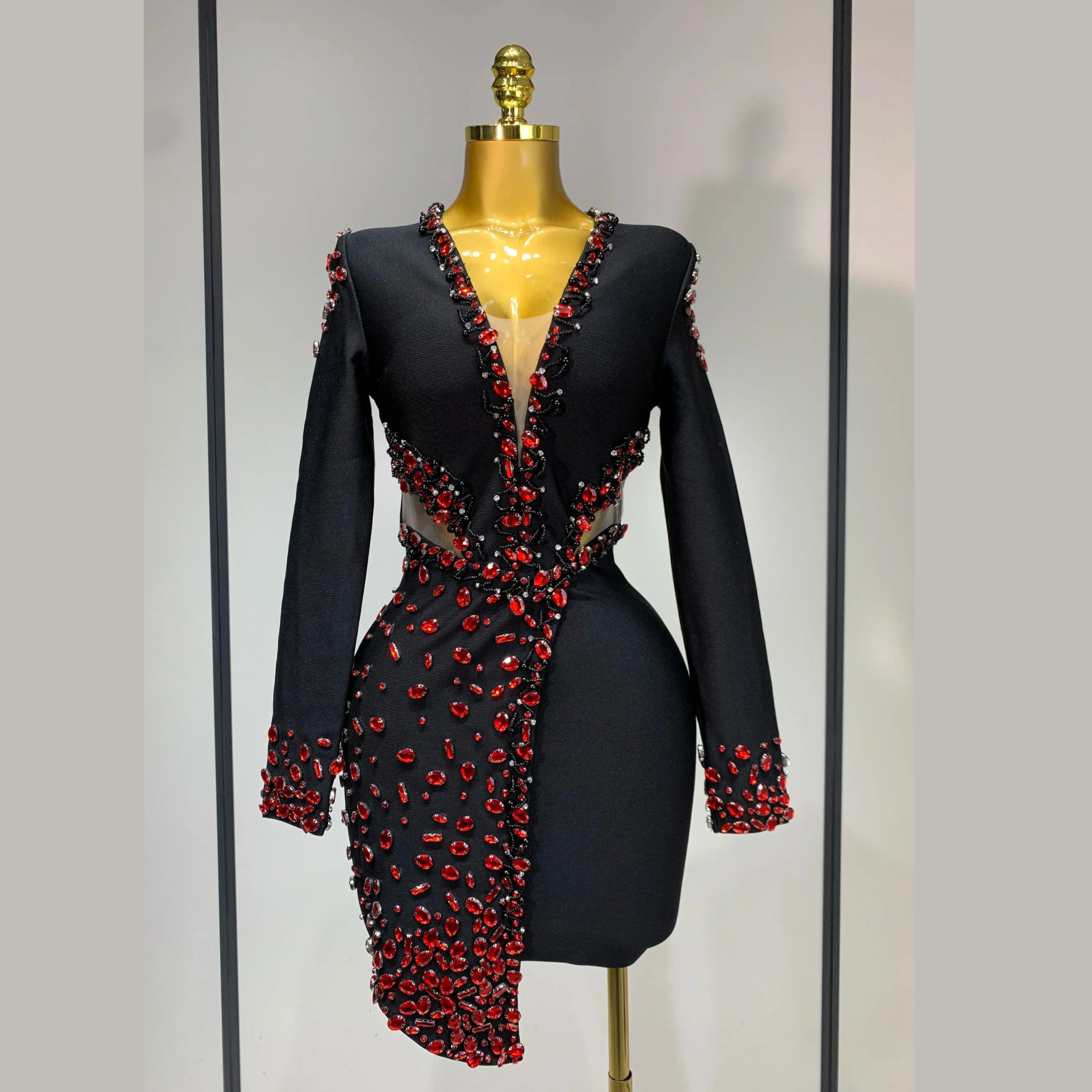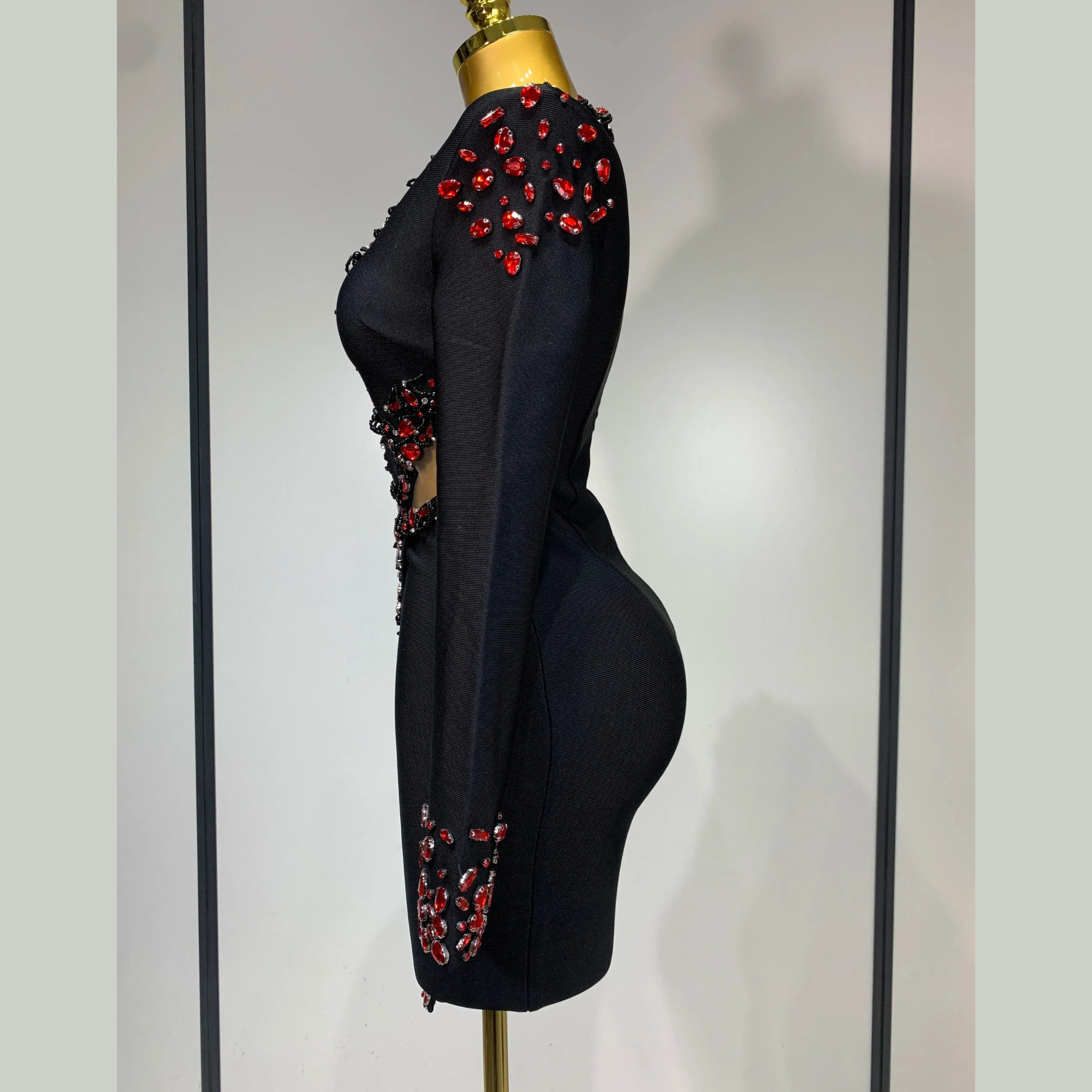 Step into undeniable elegance with Calanthe, a couture-inspired bandage dress designed to sculpt, contour, and command attention. This statement piece features a plunging V neckline accented with sheer mesh panels and intricate red crystal embellishments that cascade across the bodice and asymmetrical skirt for a dramatic, high-glam finish.