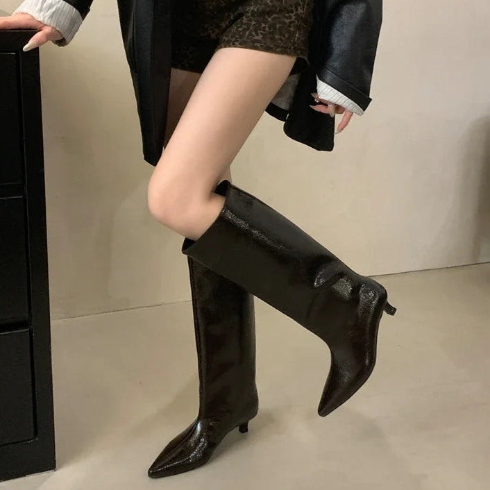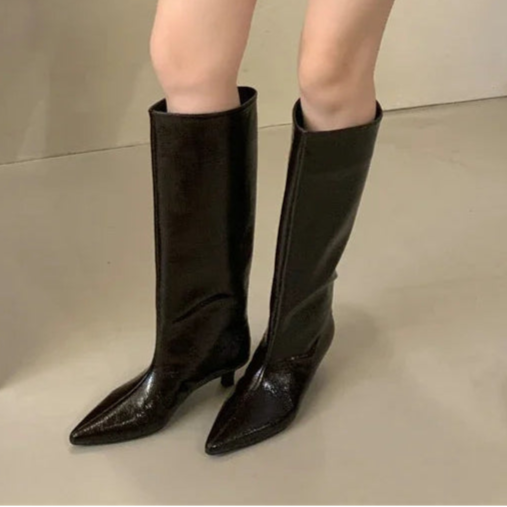 Chic, sleek, and versatile—these dark burgundy knee-high boots feature a pointed toe and low kitten heel for a polished, comfortable look. The glossy finish and structured silhouette make them perfect for both day and night styling.