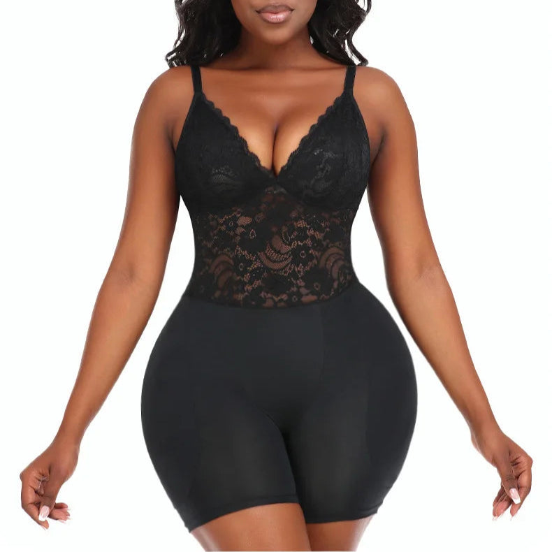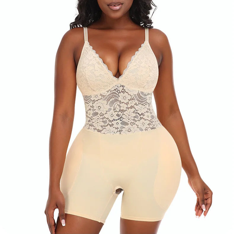 Embrace your curves with our stunning lace bodysuit. Designed to make you feel confident and beautiful, this piece showcases a delicate lace top with feminine spaghetti straps. The beige bottom offers a shorts-like fit for ultimate comfort and elegance. Our open gusset feature ensures convenience without sacrificing style. Enhanced with removable hip pads, this bodysuit accentuates your natural curves, giving you a sleek and sculpted silhouette. Ideal for layering or wearing alone, this bodysuit is a must-have addition to any sophisticated wardrobe.