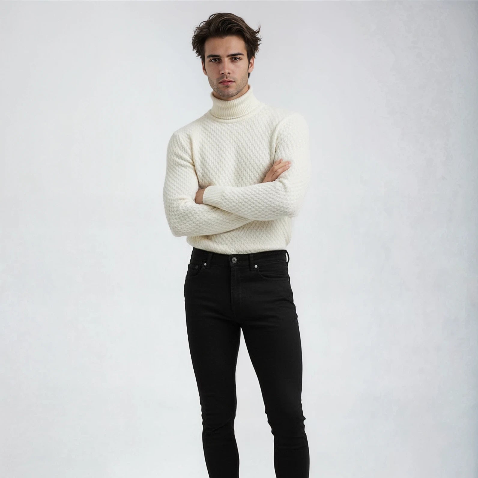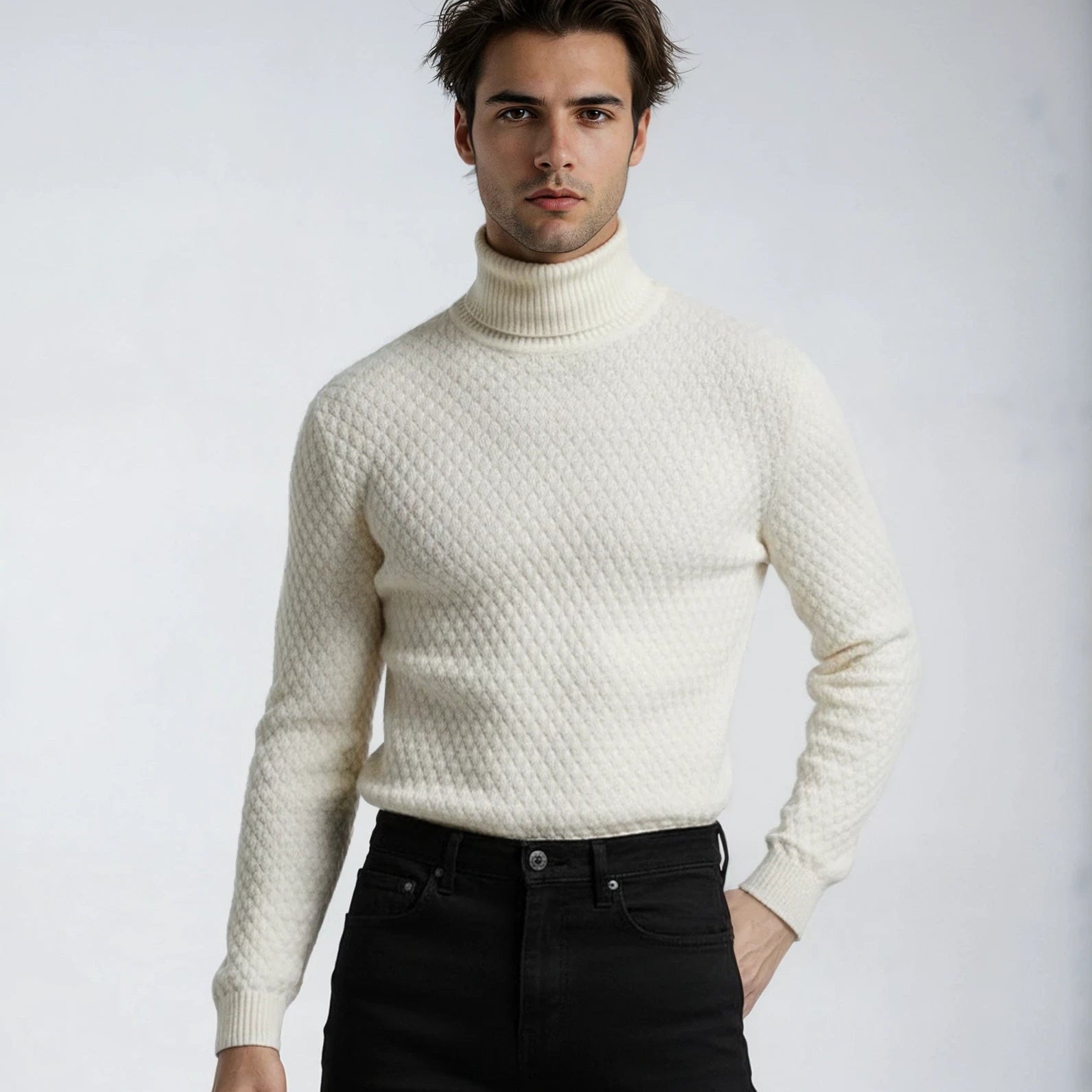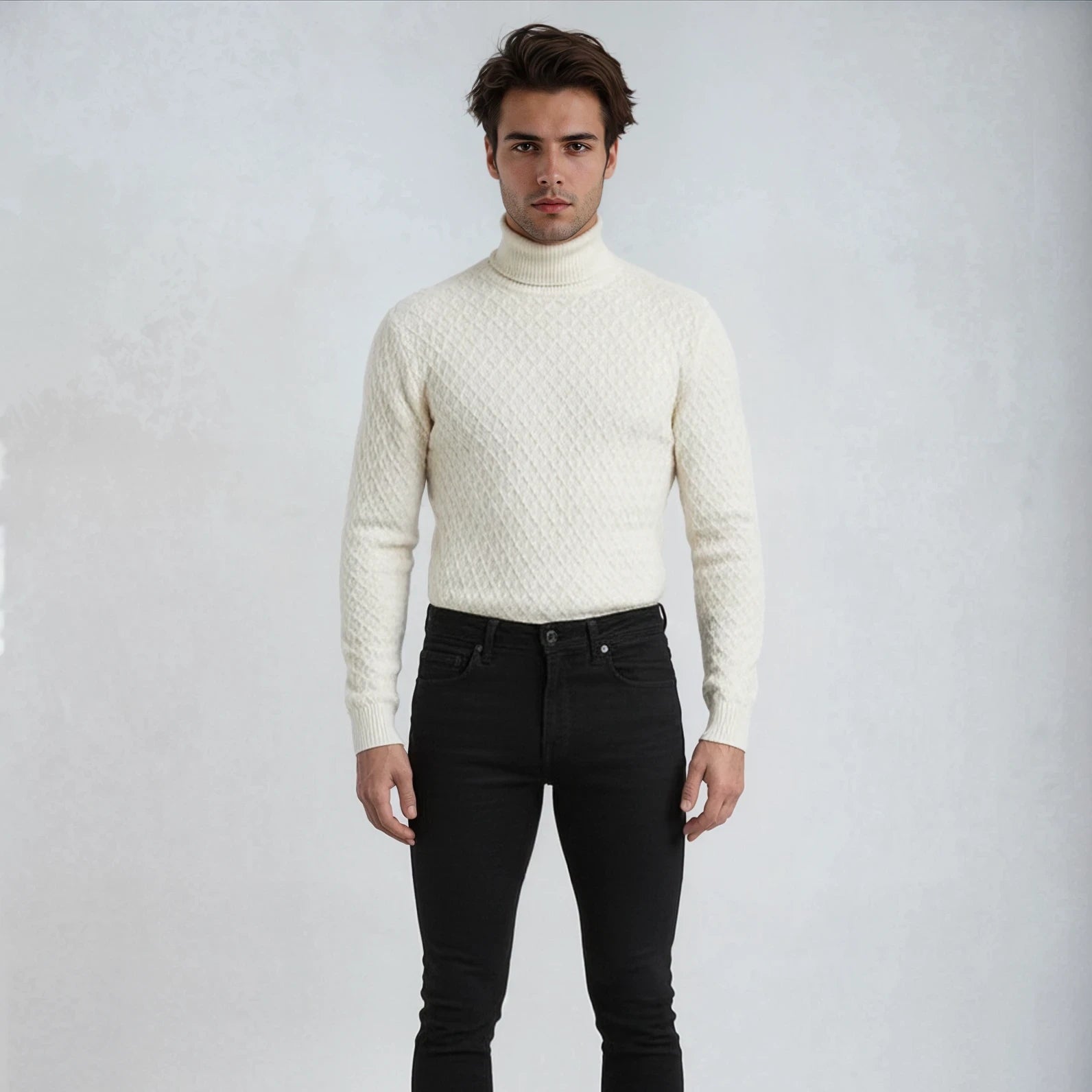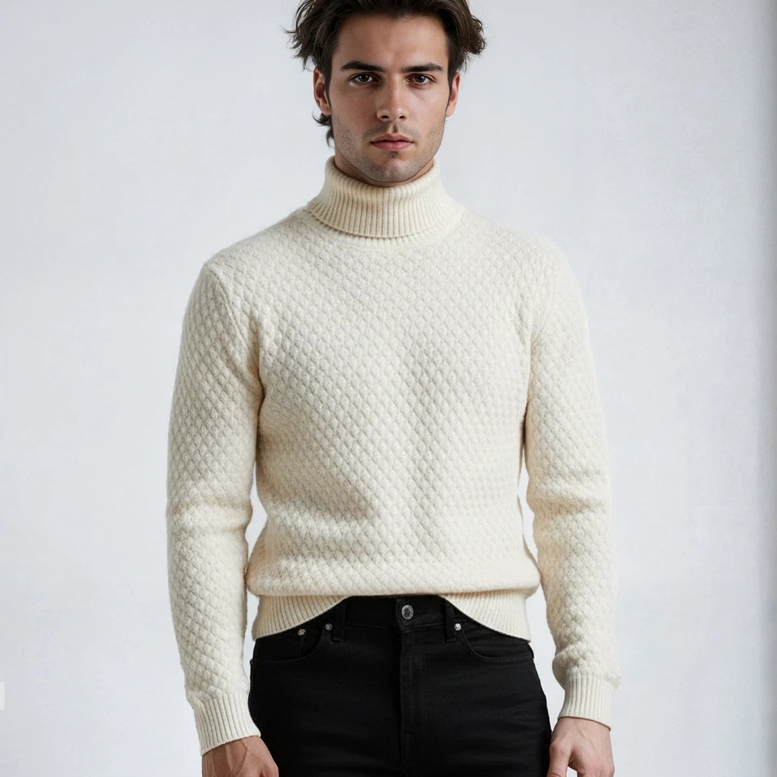 Classic and sophisticated, this textured knit turtleneck sweater is the perfect blend of warmth and refined style. Featuring a diamond-pattern weave, ribbed cuffs, and a high neckline, it delivers both comfort and a polished look. Ideal for layering under coats or wearing on its own, this versatile sweater transitions seamlessly from casual weekends to smart occasions. Also available in multiple colors.