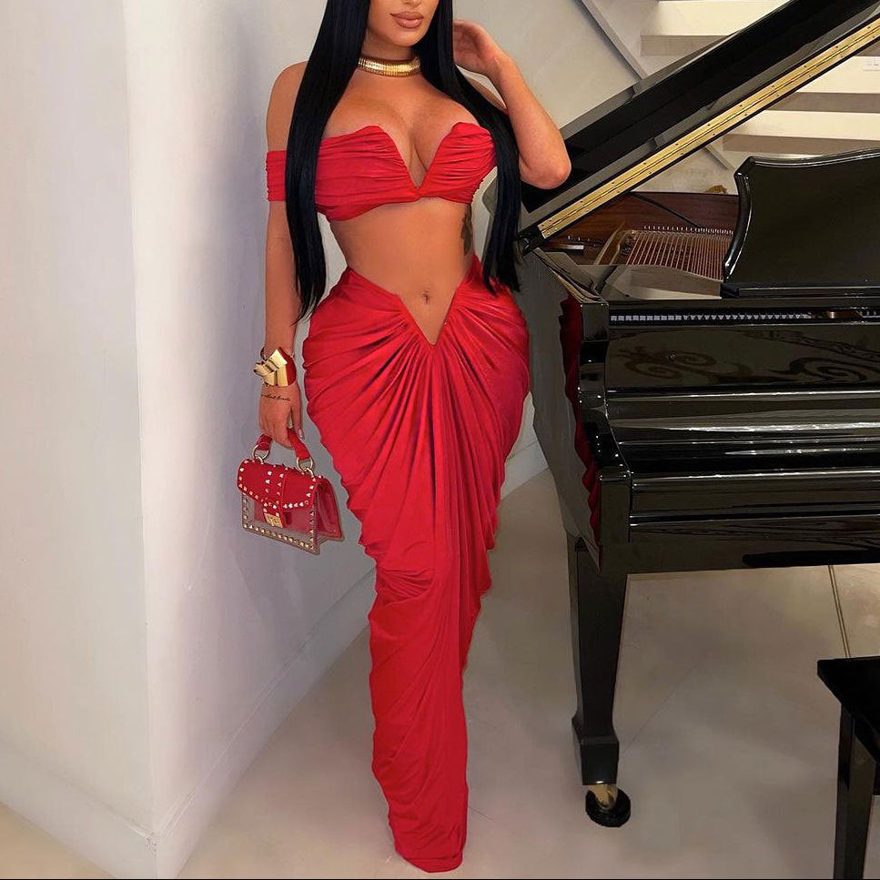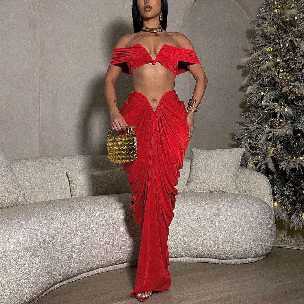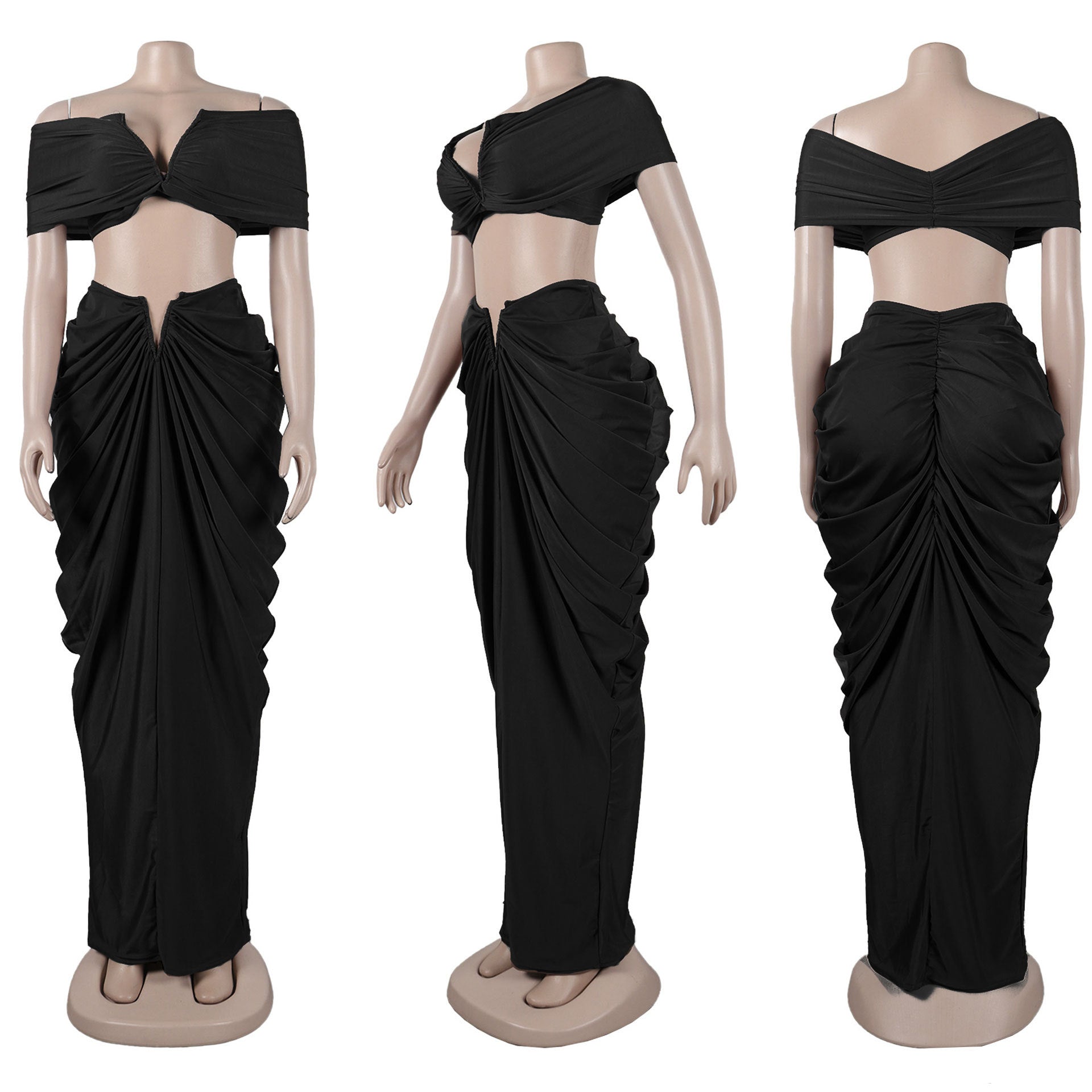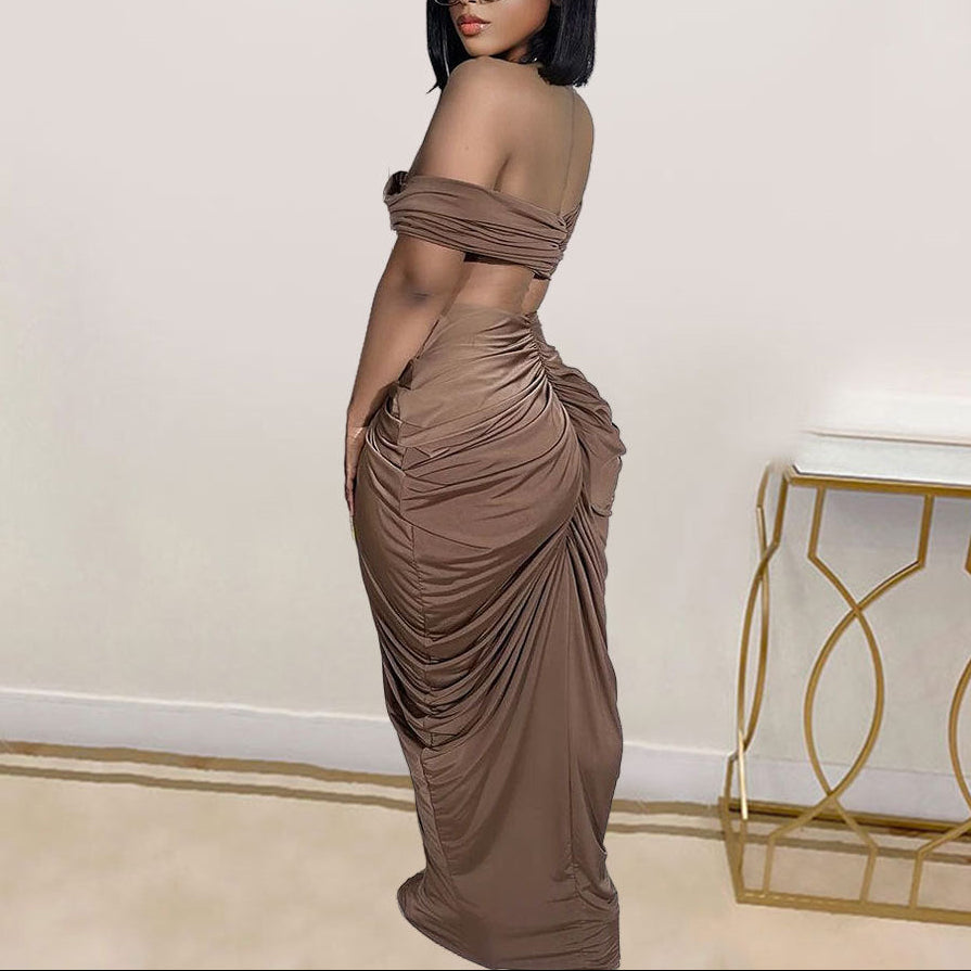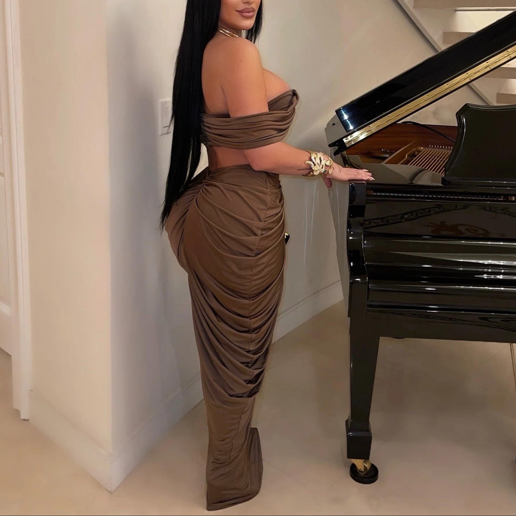 Daring, sculptural, and designed to turn heads — the Lailah Set exudes pure confidence and sensual allure. This two-piece statement ensemble features a ruched off-shoulder top that shapes and lifts the bust, paired with a stunning draped maxi skirt that cascades in elegant folds to the floor. The cut-out waistline and gathered detailing flatter every curve, creating a breathtaking silhouette that captures the essence of high-fashion eveningwear.