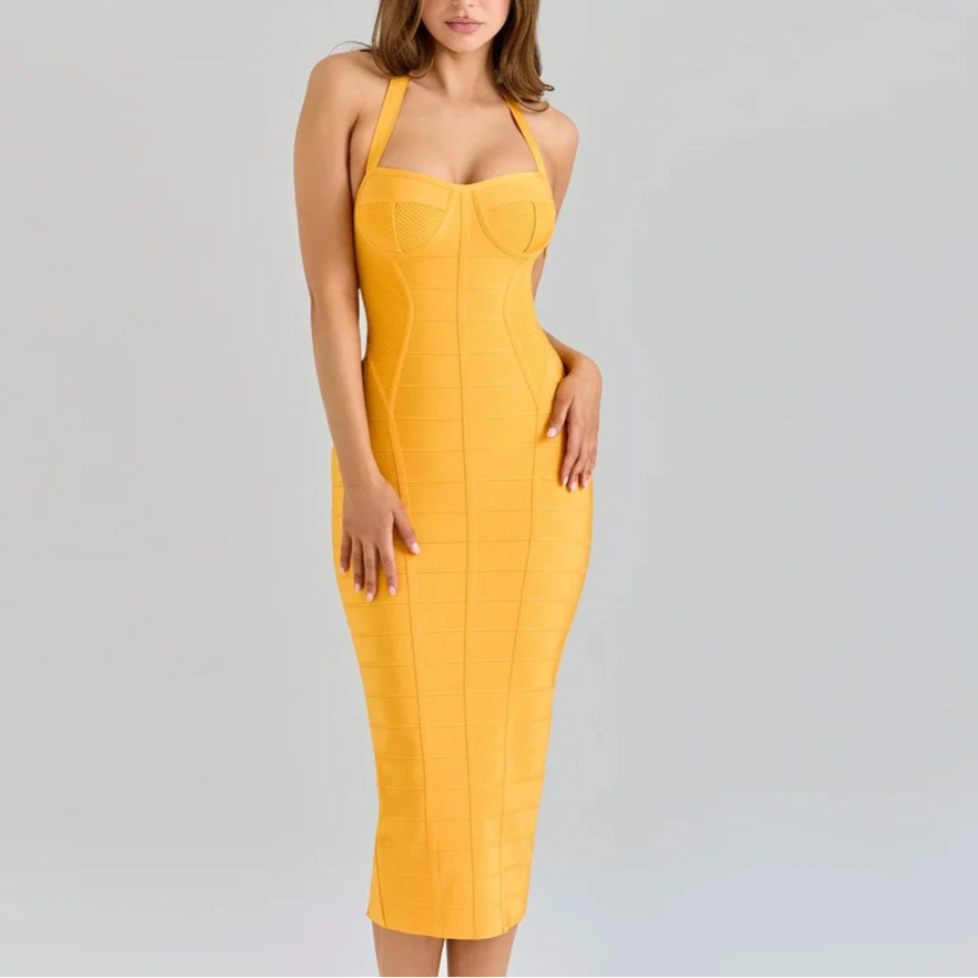 Sculpt, support, and steal the spotlight in this halter neck bandage midi dress. Crafted from premium stretch bandage fabric, it hugs your curves in all the right places while offering a sleek and structured silhouette. The built-in bustier design enhances the bust, while the halter strap adds a touch of elegance and lift. Perfect for birthdays, cocktails, date nights, or any moment made for turning heads.