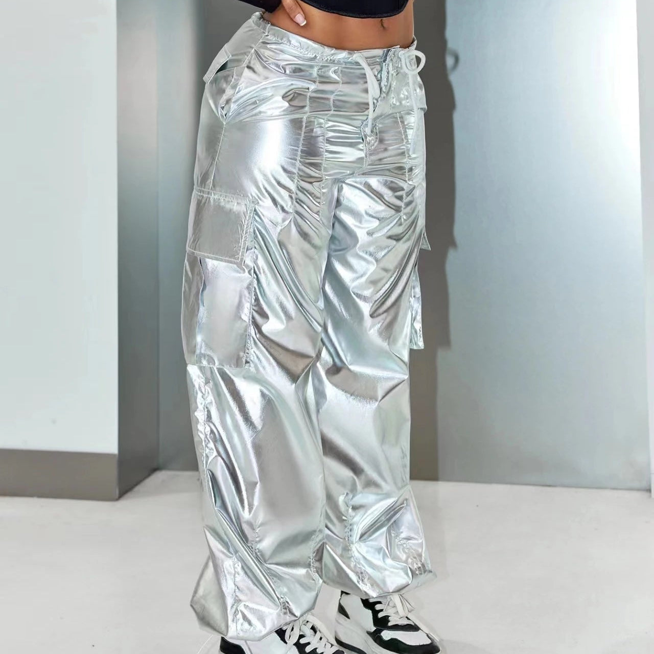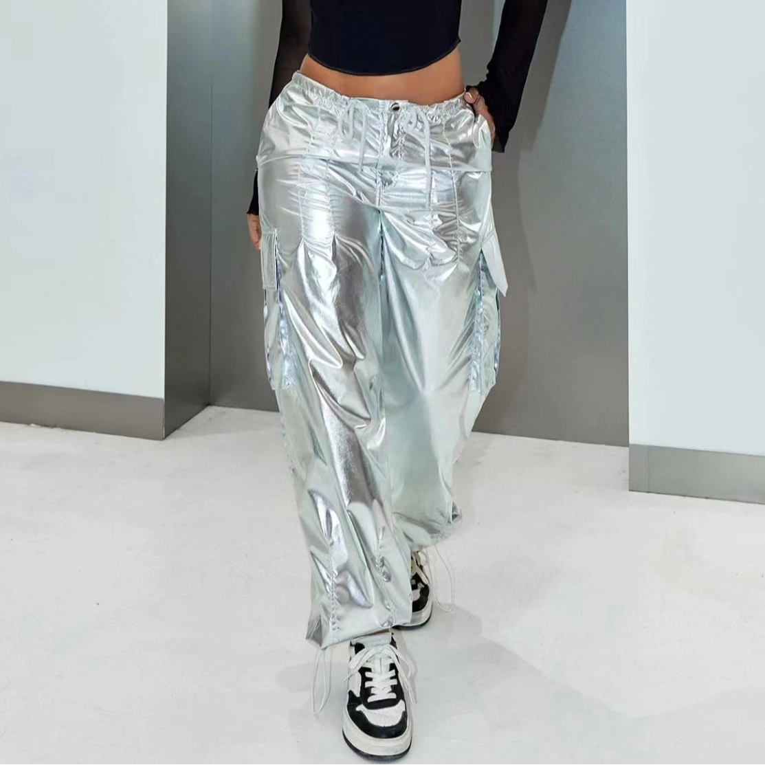 Add a touch of glam to your outfit with these stunning . Designed for those who love to blend comfort with style, these pants feature a reflective silver finish that catches the light beautifully. They come with multiple pockets, making them as practical as they are stylish. Match them with a simple black top and comfortable sneakers to complete the look. Whether you're heading out with friends or just running errands, these cargo pants are sure to turn heads. Available in all standard sizes for your perfect fit.