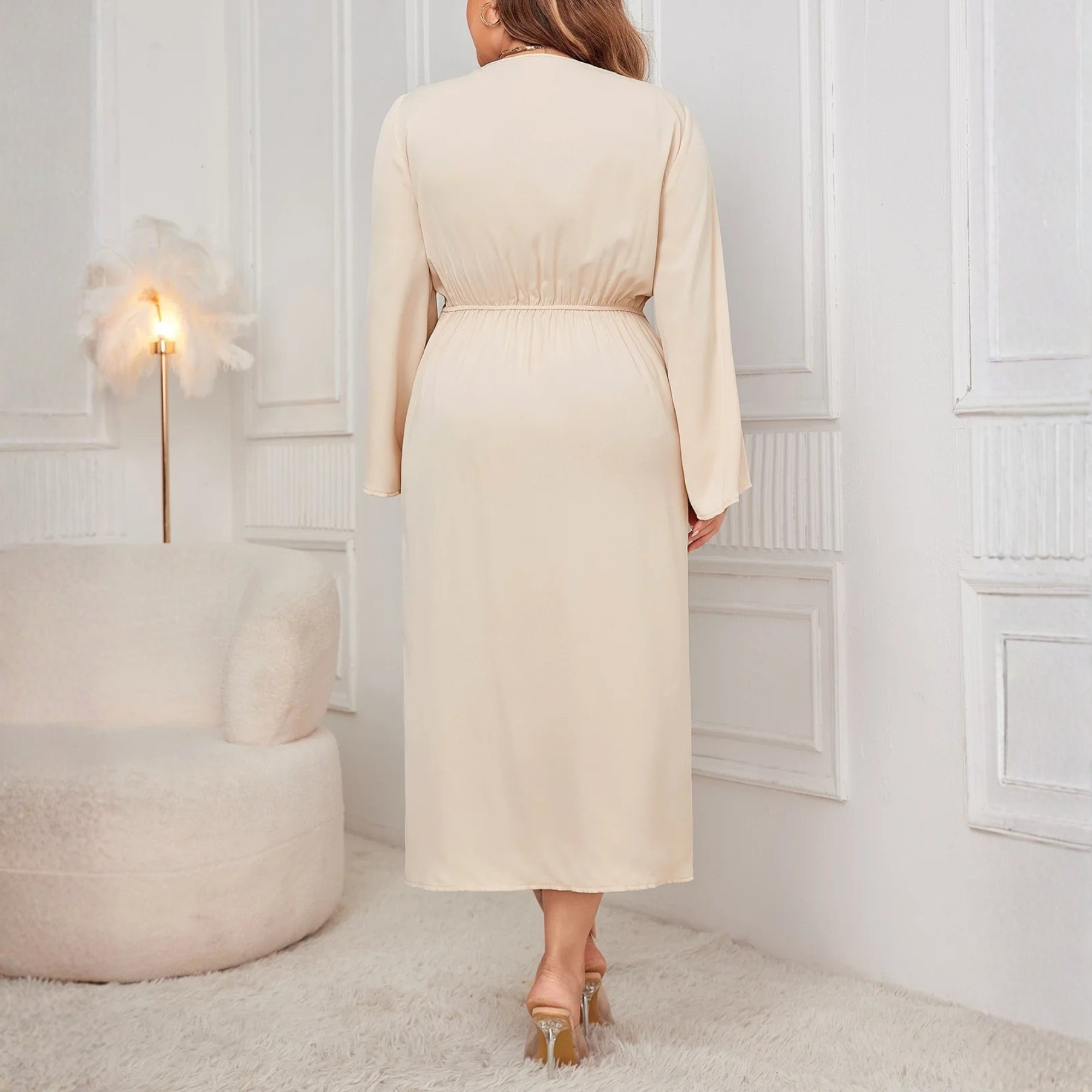 Effortlessly elegant, this plus size wrap midi dress is designed to flatter your curves with timeless sophistication. Featuring a draped wrap front, cinched waist detail, and flowing long sleeves, it creates a refined silhouette perfect for any occasion. Whether styled for a formal dinner, cocktail evening, or special event, this dress ensures comfort without compromising on style.