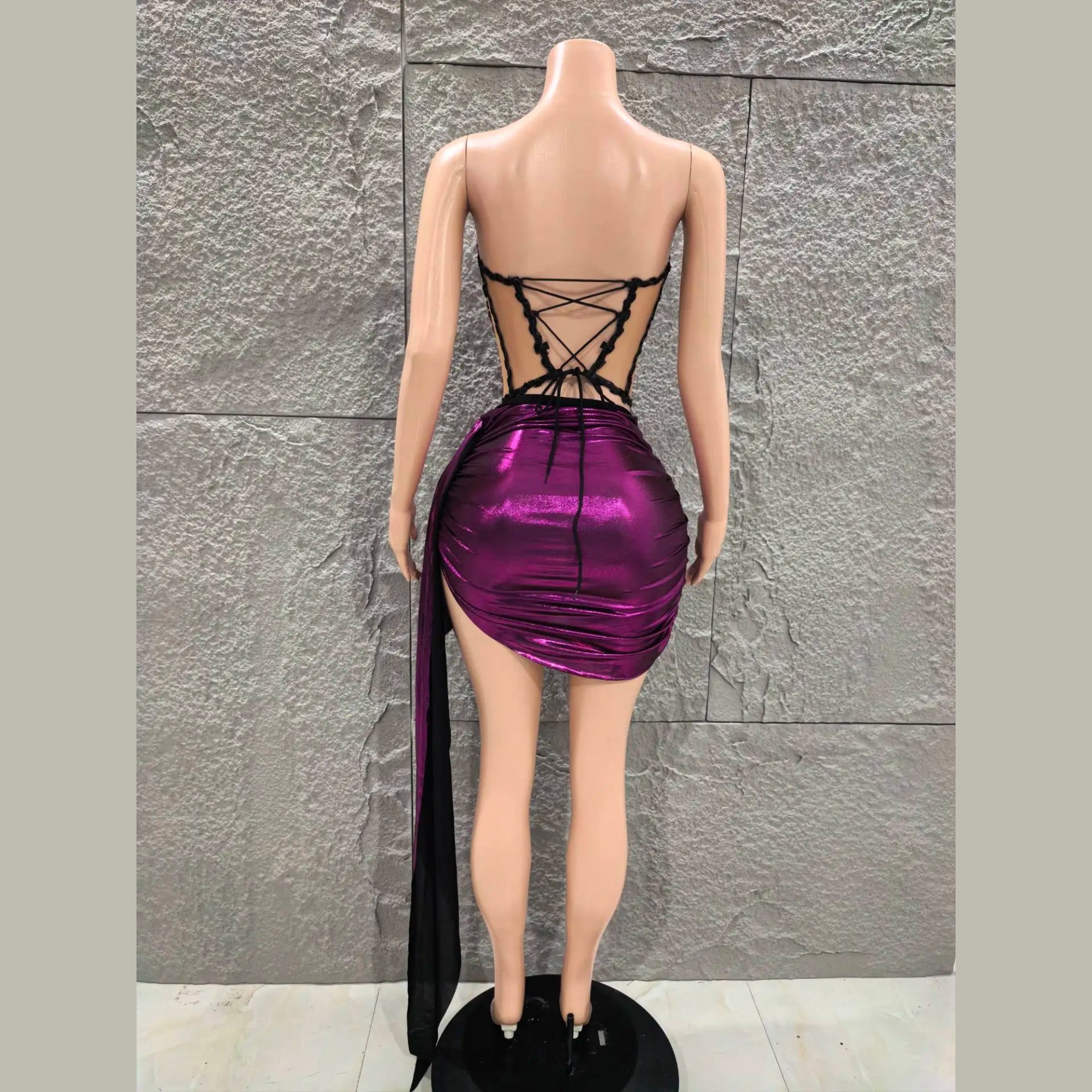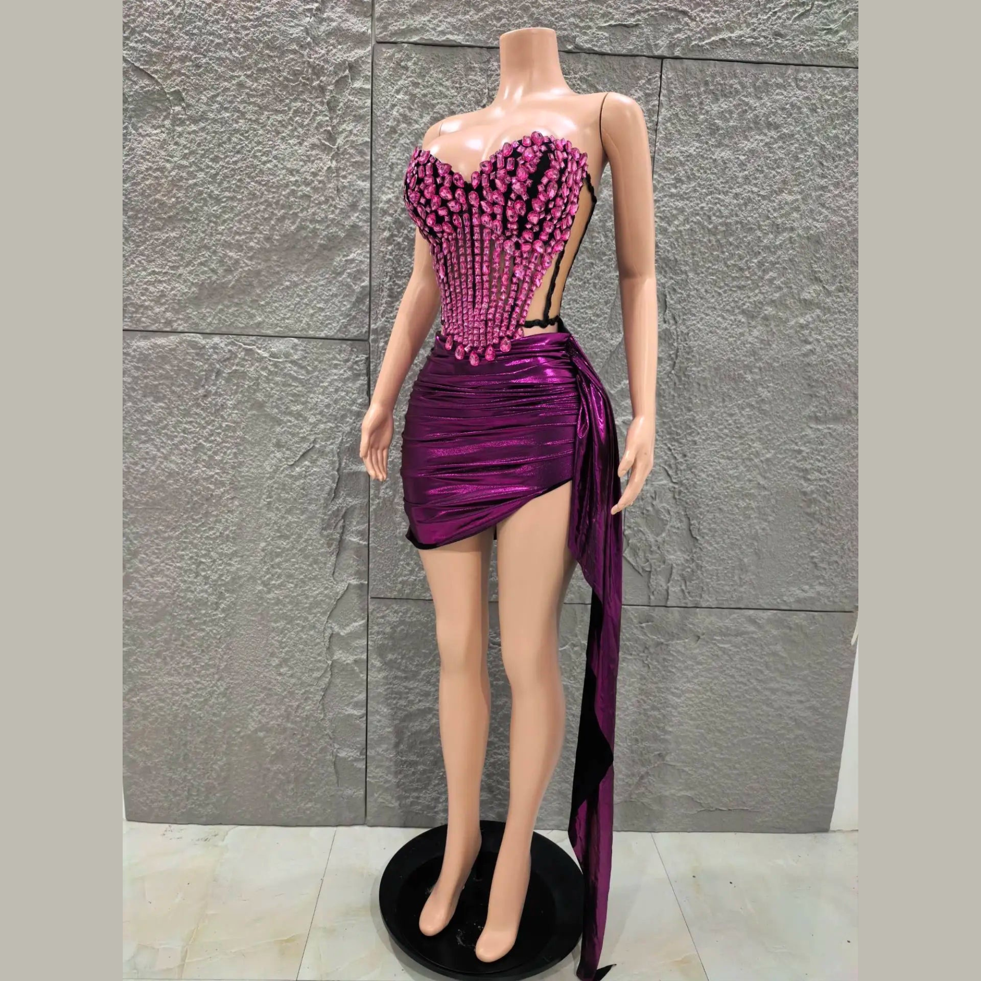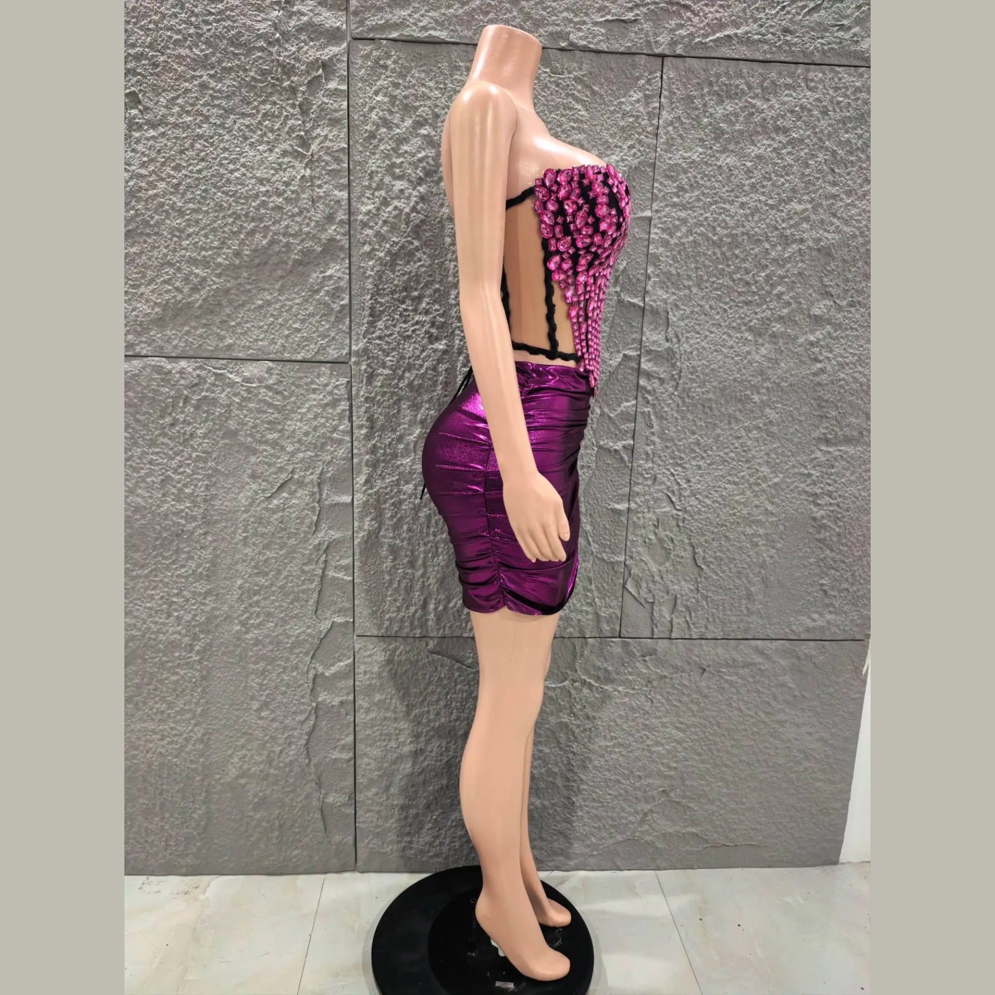 Dazzle the crowd in this show-stopping two-piece set designed for unforgettable nights out. The corset-style top is intricately detailed with 3D gem embellishments and structured boning for a sculpted silhouette, while the metallic draped mini skirt with side-tie detail adds a bold, glamorous finish. Perfect for special events, parties, and occasions where all eyes should be on you.