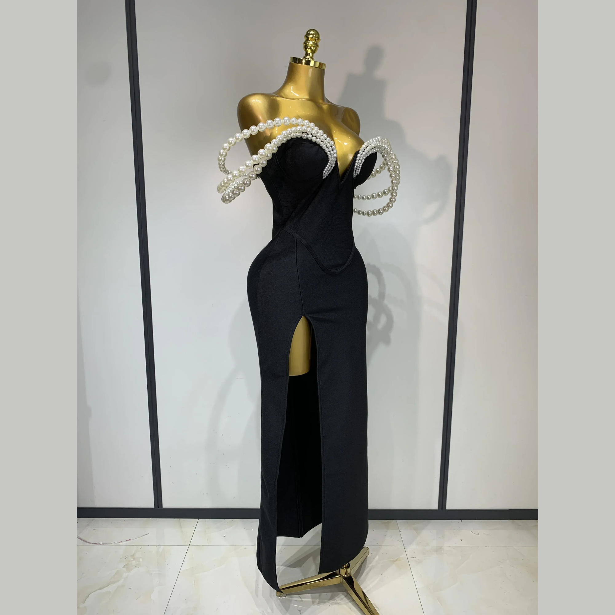 Command attention in the Olivienne Pearl Embrace Bandage Gown, a striking fusion of elegance and modern glamour. Designed to sculpt the body with signature bandage construction, this dramatic gown features a structured sweetheart neckline framed by cascading pearl embellishments that drape gracefully over the shoulders and arms. The sleek, body-contouring silhouette enhances your curves, while the thigh-high slit adds movement and a bold, sophisticated finish.