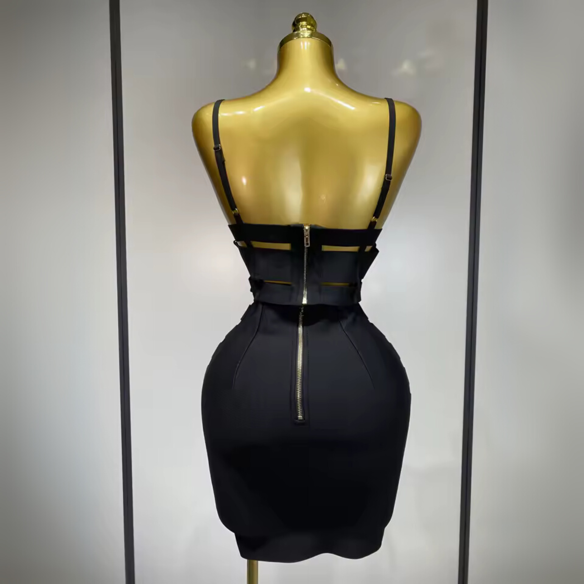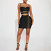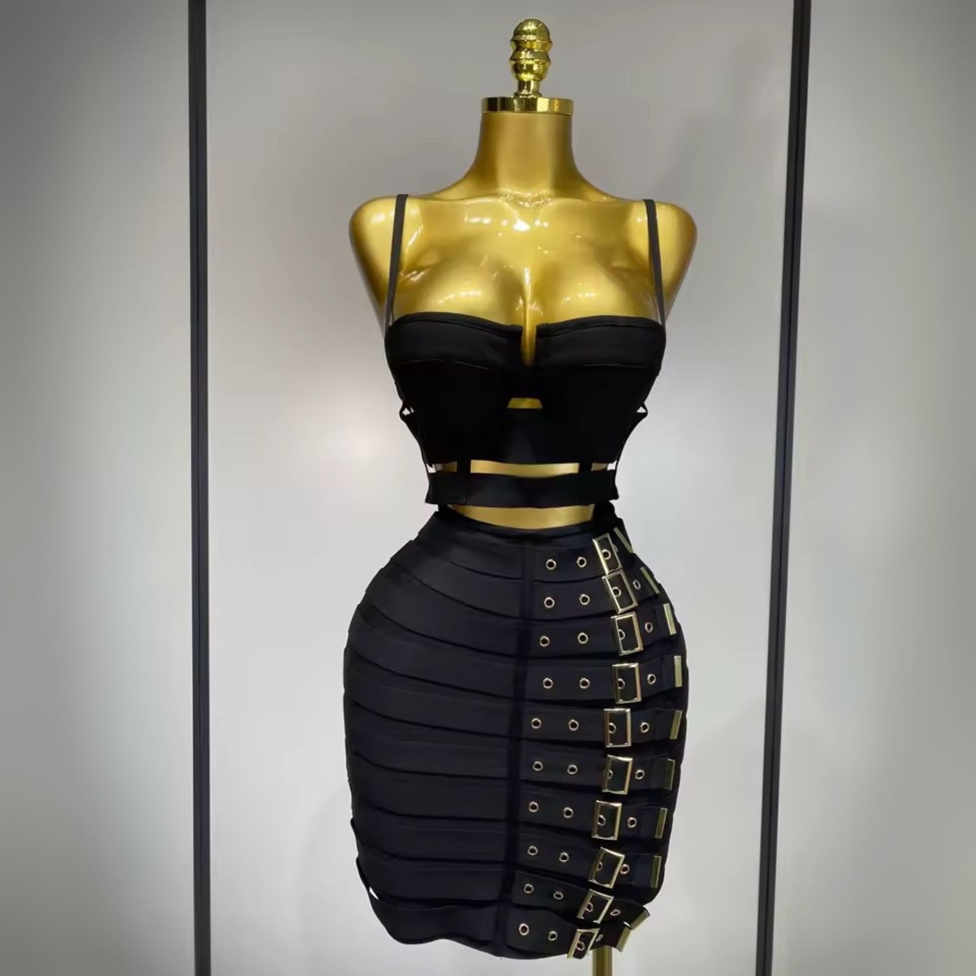 Turn every head in the room with this daring two-piece bandage set. Featuring a structured bustier-style crop top with cutout details and a curve-hugging skirt designed with bold buckle accents, this set is the perfect mix of edgy and glamorous. Crafted from premium stretch bandage fabric, it sculpts and smooths your figure while offering unbeatable comfort and support. Available in classic white and black for versatile styling.