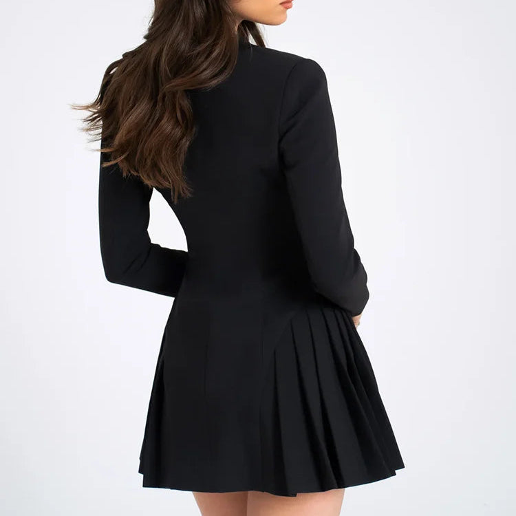 Step into elegance with this stunning black v-neck fit and flare blazer dress. Featuring side pleats that add a touch of sophistication and movement, this dress effortlessly combines the classic blazer silhouette with a feminine twist. The v-neck design provides a flattering neckline, while the fit and flare cut ensures a figure-enhancing shape. Perfect for both office settings and evening outings, this versatile dress is a must-have in any modern wardrobe. Pair it with heels for a polished look or dress it down with flats for a more casual vibe.