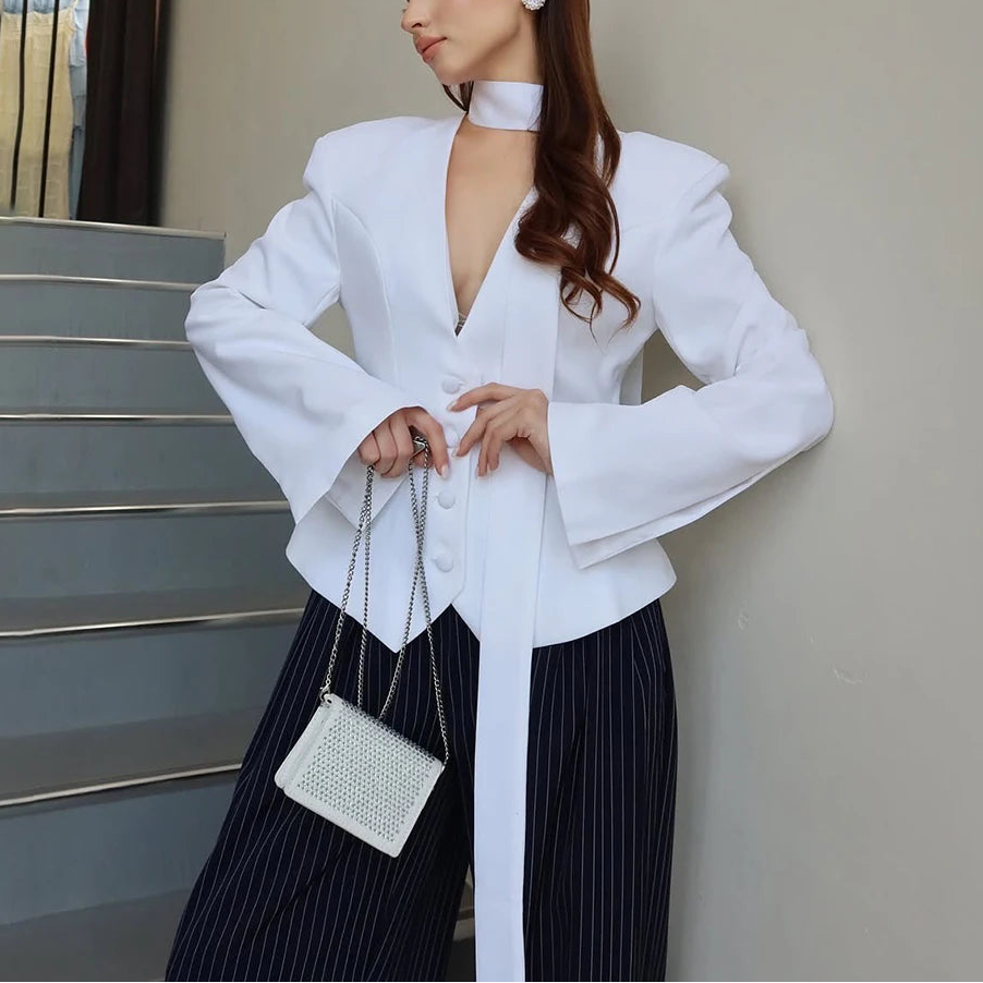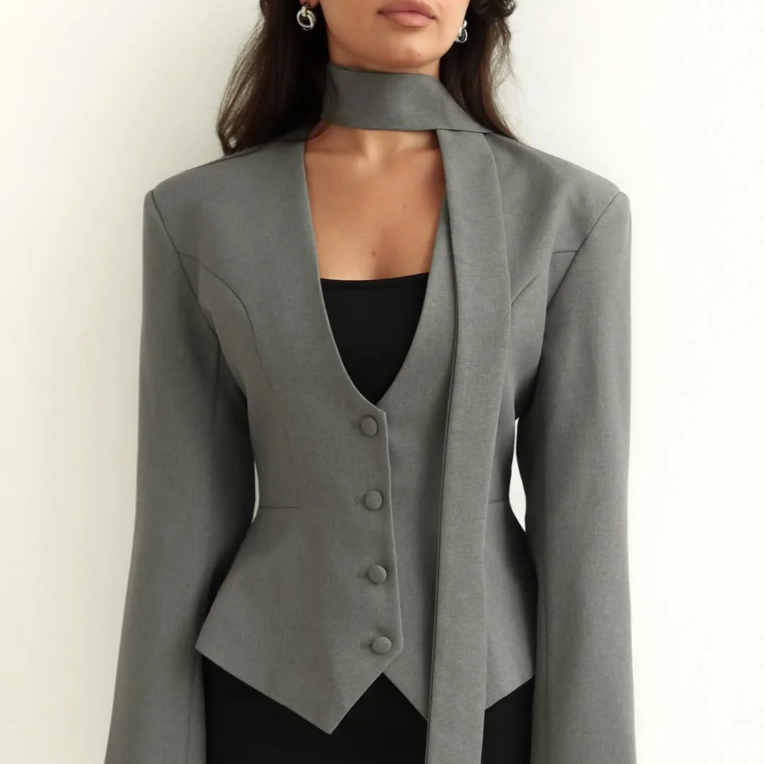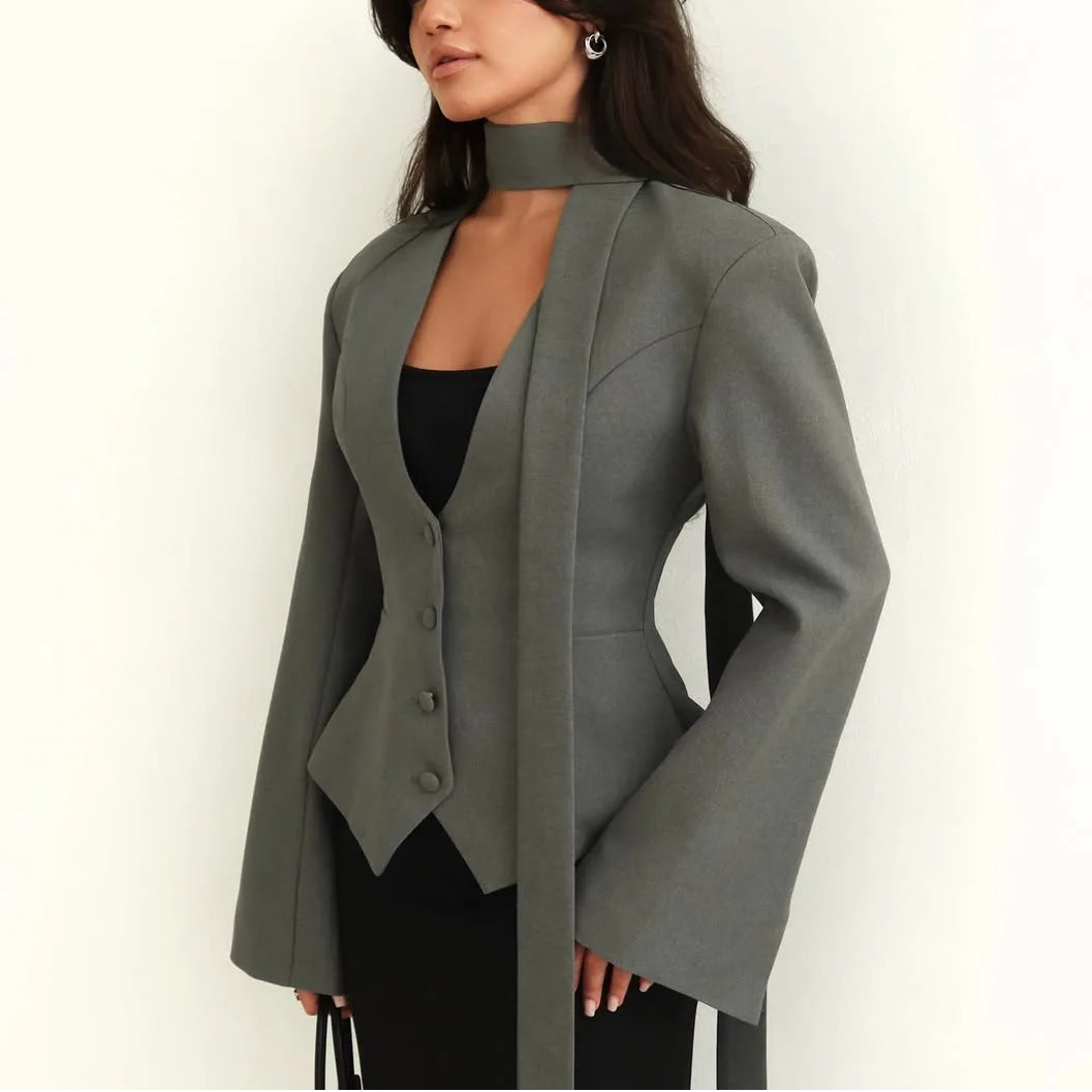 The built-in scarf detail drapes gracefully along the neckline, adding a soft feminine touch to the structured silhouette—making it a versatile piece that transitions seamlessly from boardroom to evening dinner.