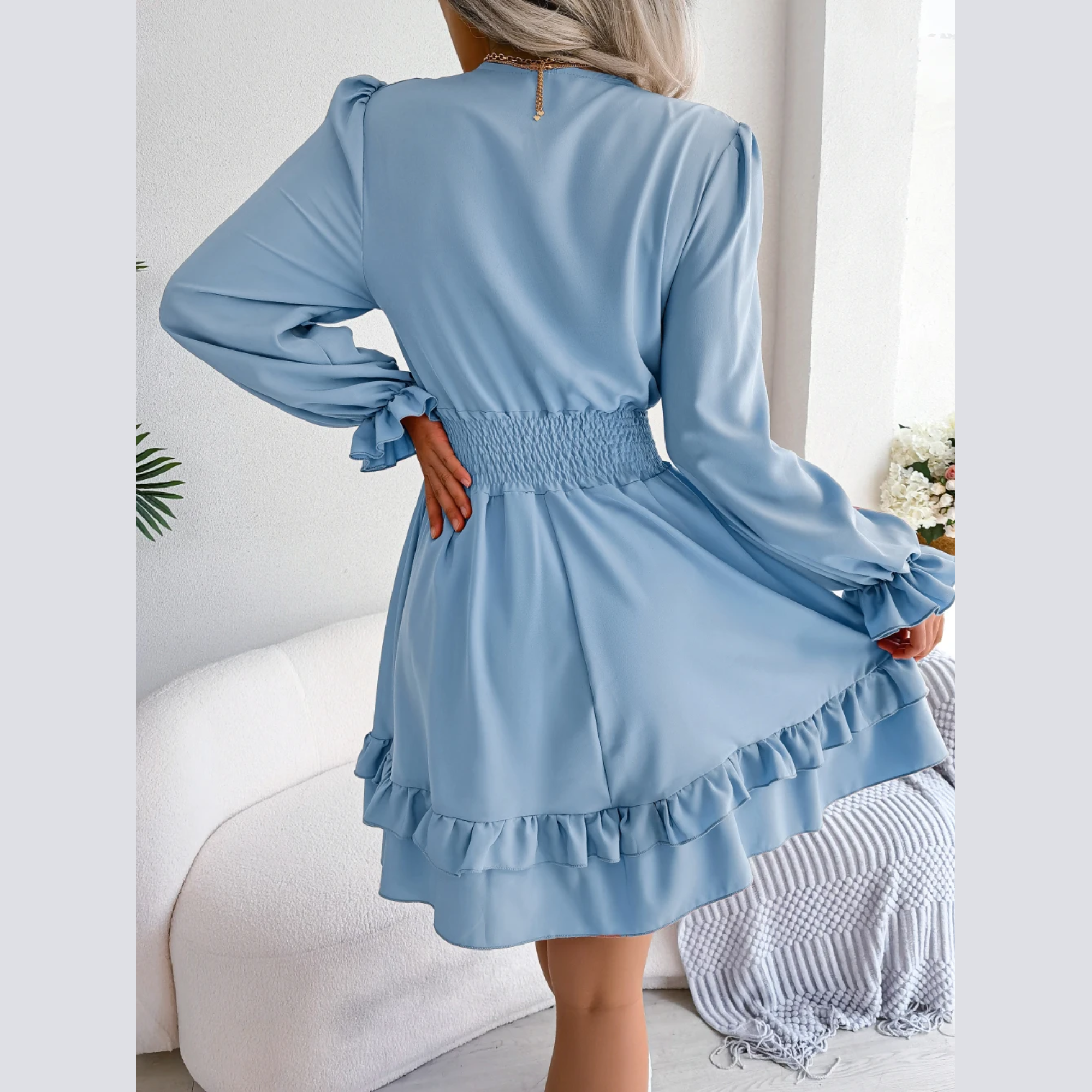 Sadie is a blooming beauty that will inspire your feminine side. This lovely mini dress features a plunging neckline with bow ties with long elasticized sleeves. The waist has gentle smocking to highlight your curves with a flowy A-Line skirt featuring ruffles on the mini hemline. Also available in White and Pink.