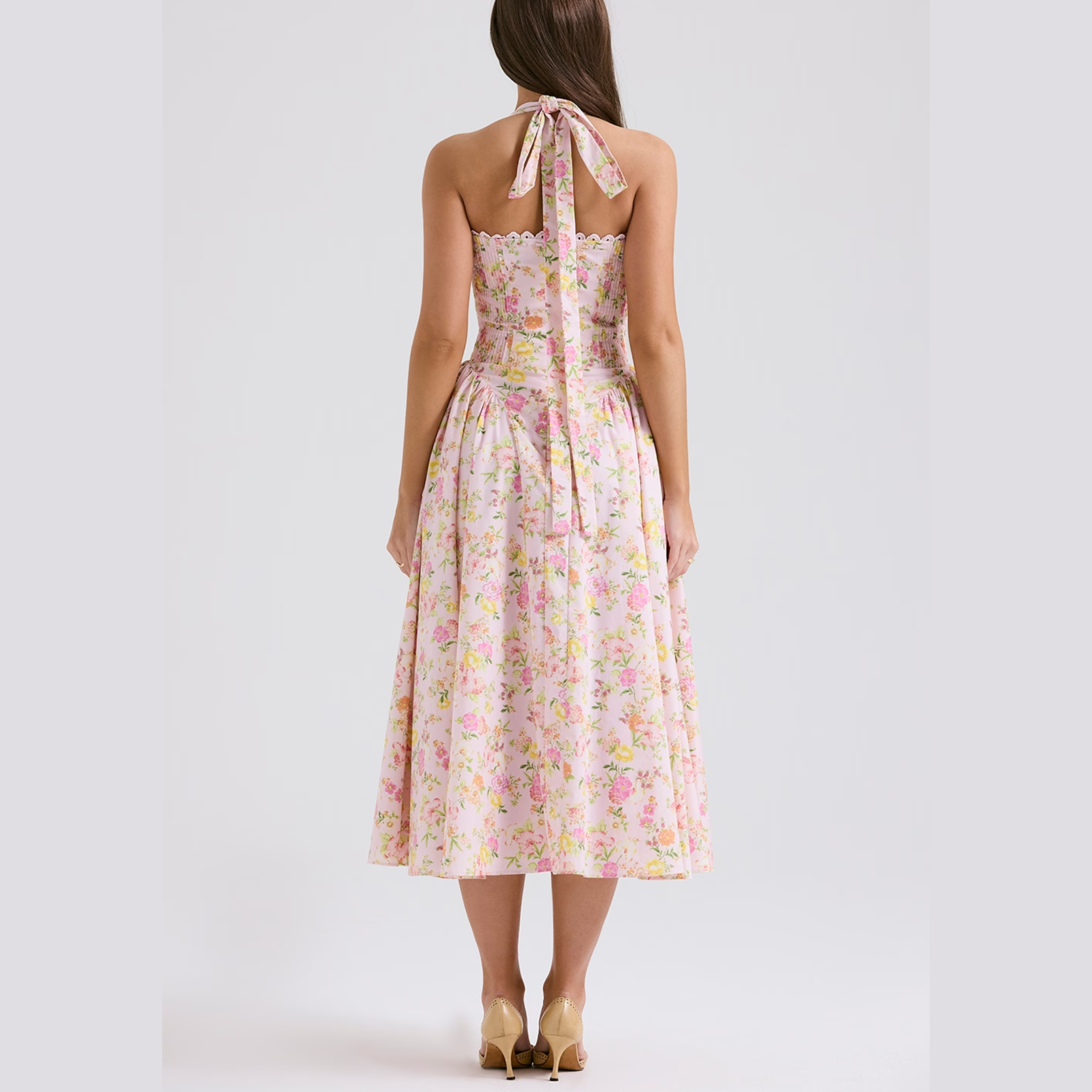 Embrace timeless beauty with this stunning A-line fit and flare midi dress. The halter neck provides a classic yet contemporary look, ideal for any fashionable wardrobe. Delicately crafted with pleated sides on the skirt, this dress combines elegance with a playful twist. Whether you’re attending a garden party, a cocktail event, or a dinner date, this dress is your go-to for effortless style and grace.