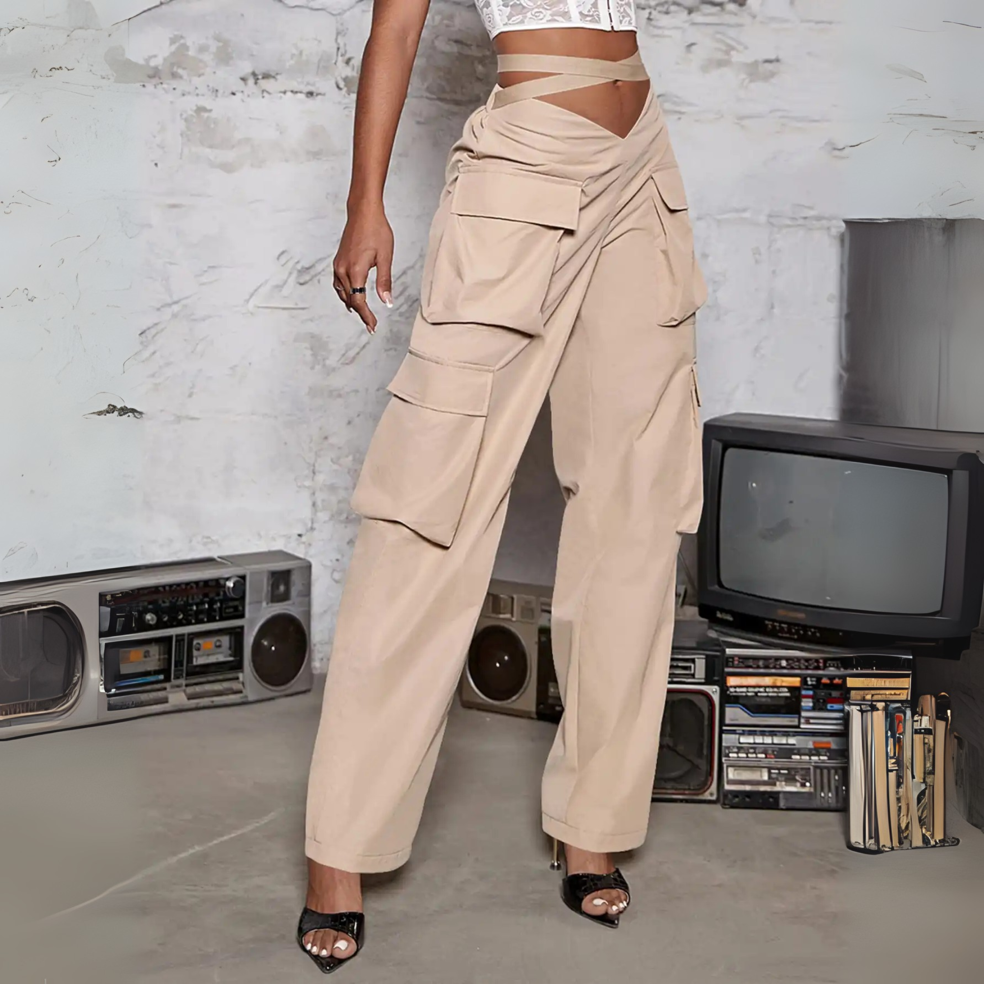 Stay stylish and functional with these versatile khaki cargo pants. Designed with practicality in mind, they feature two long side straps that can be adjusted or wrapped around the waist for a customizable fit. Perfect for casual outings or an on-the-go lifestyle, the lightweight fabric ensures all-day comfort. Pair them with your favorite sneakers or boots for a trendy yet laid-back look. Ideal for anyone looking to combine utility with fashion-forward appeal.